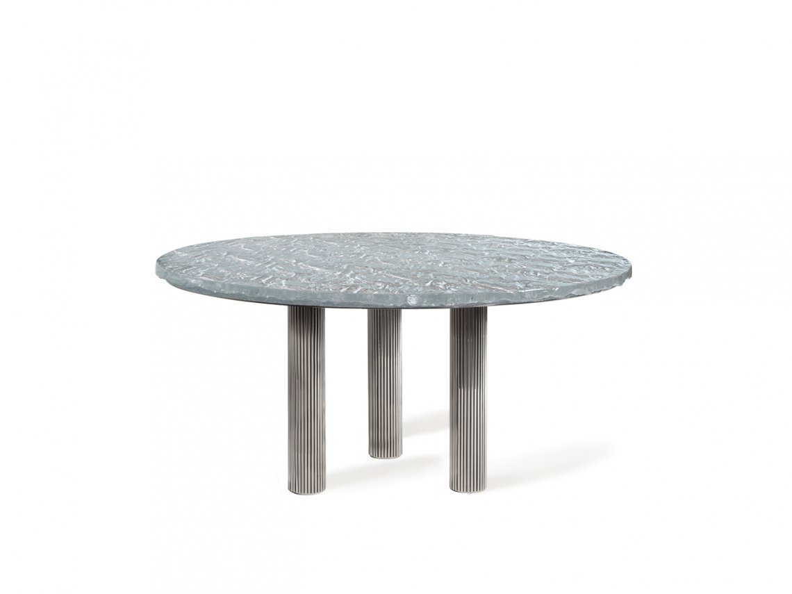 For many years, our company has been glad to cooperate with the Masters of glass art in the Venice area. Miller collection of tables is the perfect result of the ability of these artists, who learnt the ancient Murano working techniques and have handed them down from generation to generation. The glass top was born from the desire to experiment with a completely unconventional product, reinterpreting a millennial tradition in a modern key. The production difficulties inherent in a casting process aimed at obtaining a large and thick glass top, make this piece a truly unique element. The top is supported by a metal plate that accentuates the reflections of the lower part of the glass, resembling sea ripples. The table top is supported by three cylindrical legs covered with thin chrome metal rods.