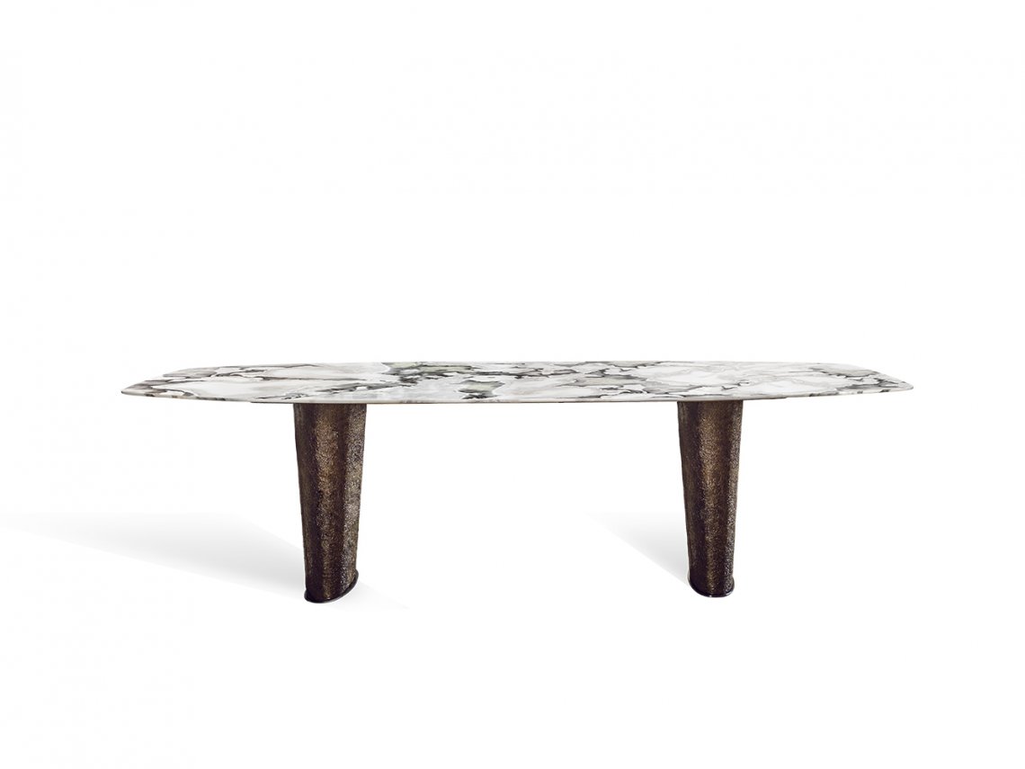 The peculiarity of the table Cheope lies in the eccentric decoration that covers the oval bases, the designer’s artistic expression. A thin metal sheet is molded thus creating a surface with a strong three-dimensionality emphasized by a chromatic finish that enhances its texture. Available in different chromatic finishes to obtain the best match with the type of marble chosen. Thanks to the wide range of sizes available for the top, this table fits any dimension of dining room.