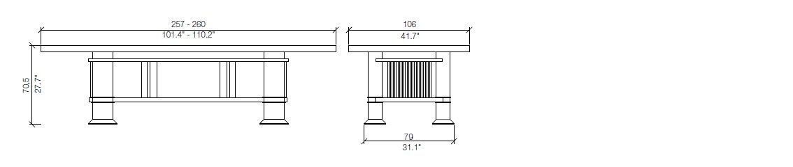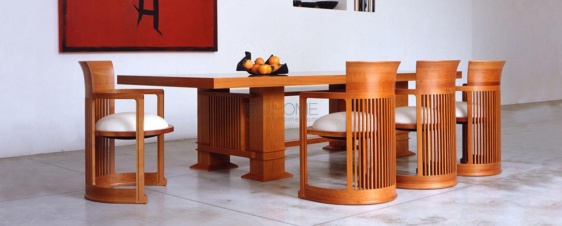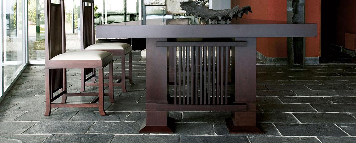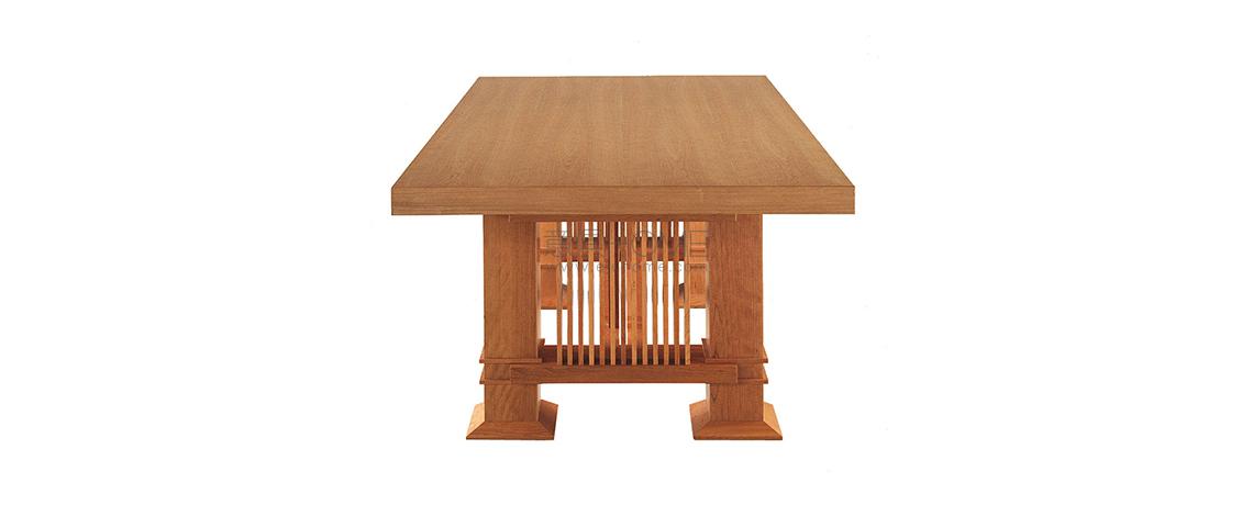 Frank Lloyd Wright progetta questo tavolo da pranzo nel 1917, per la casa del governatore e senatore del Kansas Henry J. Allen, riconosciuta come uno degli ultimi esempi di modulo unifamiliare in stile praire house. Il suo profilo sostanziale e possente rivaluta il concetto di spazio senza tralasciare il riferimento alla tradizione, come dimostrato dall’eleganza stilistica della forma rettangolare in legno. La struttura è disponibile in ciliegio naturale, tinto noce o noce canaletto, con due diverse lunghezze di piano corrispondenti alle dimensioni originali.
