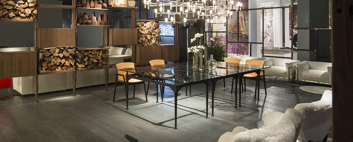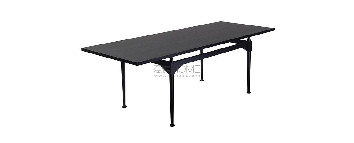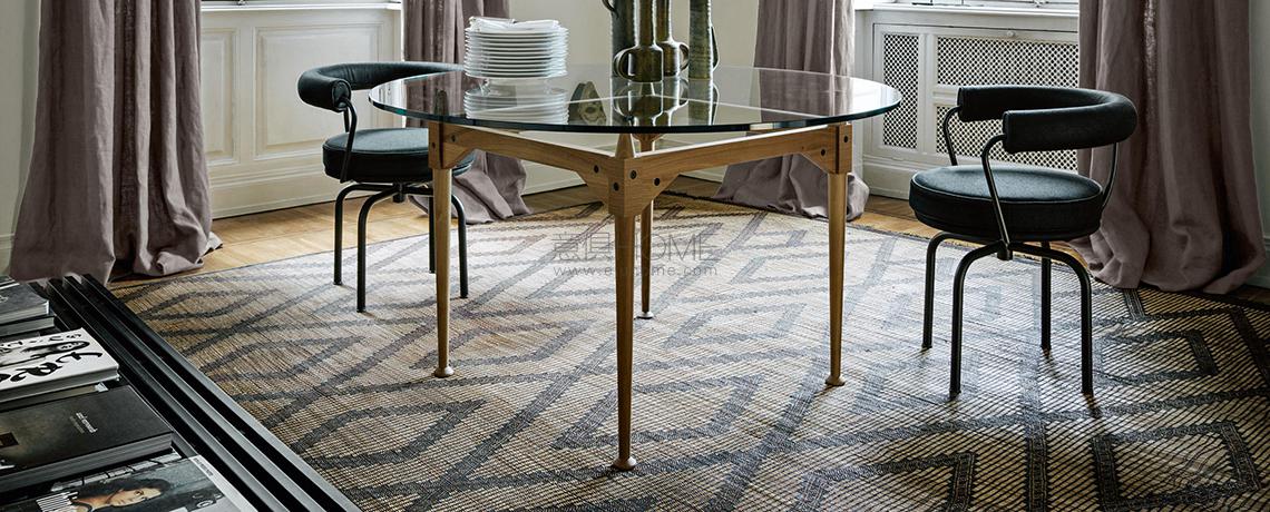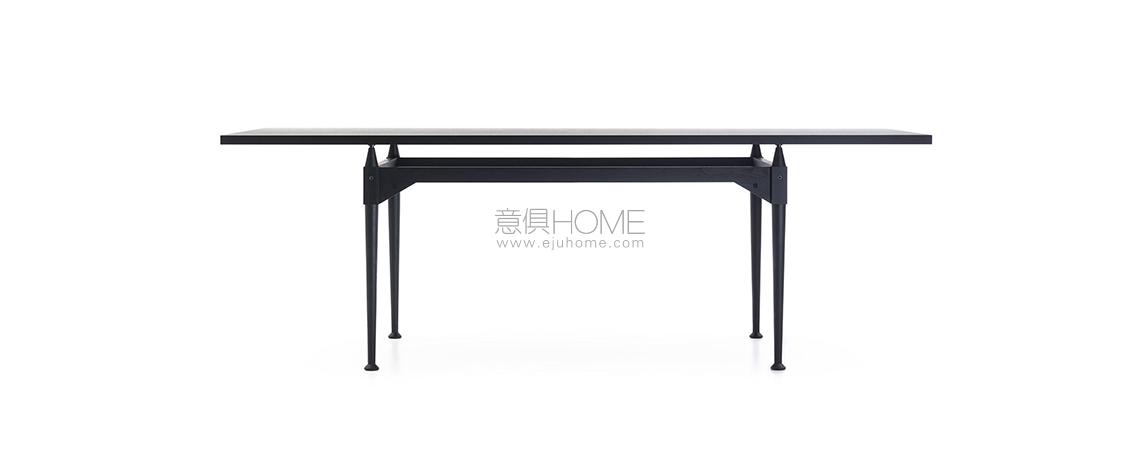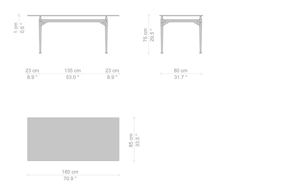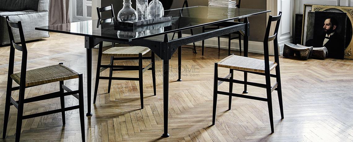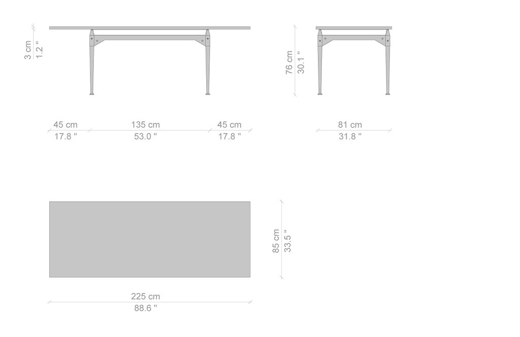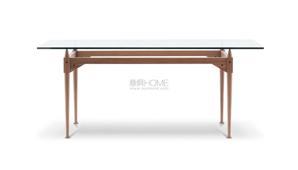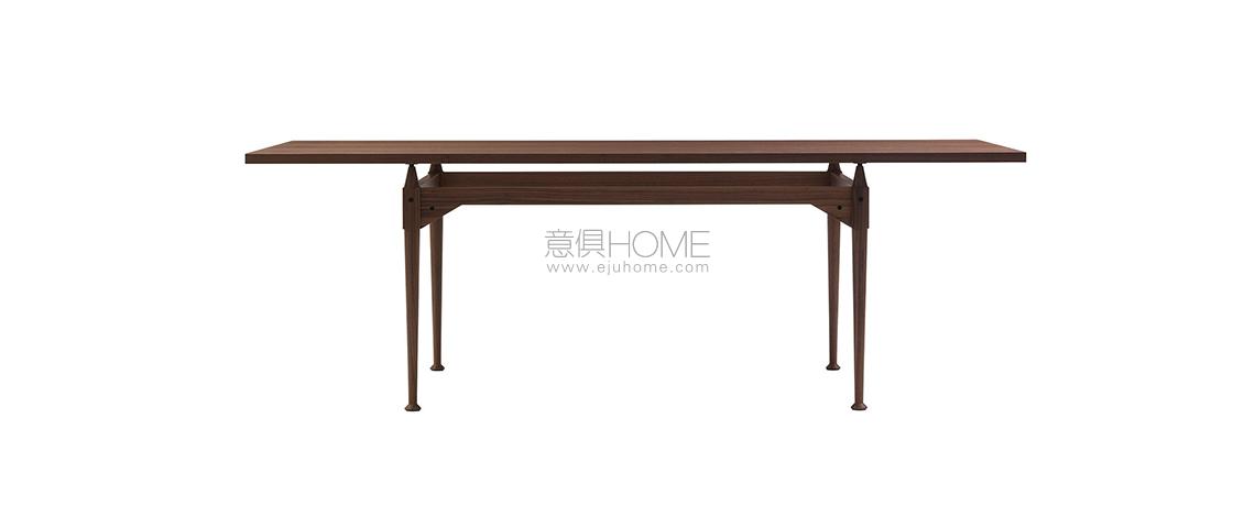 Franco Albini progetta questo tavolo utilizzando l’elemento puntone già impiegato, nella sua massima valorizzazione, per le librerie Veliero e Infinito. In questo caso le gambe fungono da montante presentandosi come blocchi unici torniti lungo tutta la superficie, ad eccezione della sezione quadrata su cui si aggancia la traversa orizzontale. Il cono in legno che sormonta ogni parallelepipedo crea un distacco tra i traversi in legno e il piano, che con la sua estrema leggerezza visiva sembra quasi sospeso a mezz’aria. Il raccordo tra i montanti verticali e i traversi sagomati orizzontali è definito da viti a vista che evidenziano il concetto di smontabilità al cuore del progetto. La riedizione di Cassina studiata insieme alla Fondazione Albini sulla base dei disegni d’archivio ha previsto anche l’inserimento di piani di cristallo che lasciano a vista i dettagli di alta ebanisteria.