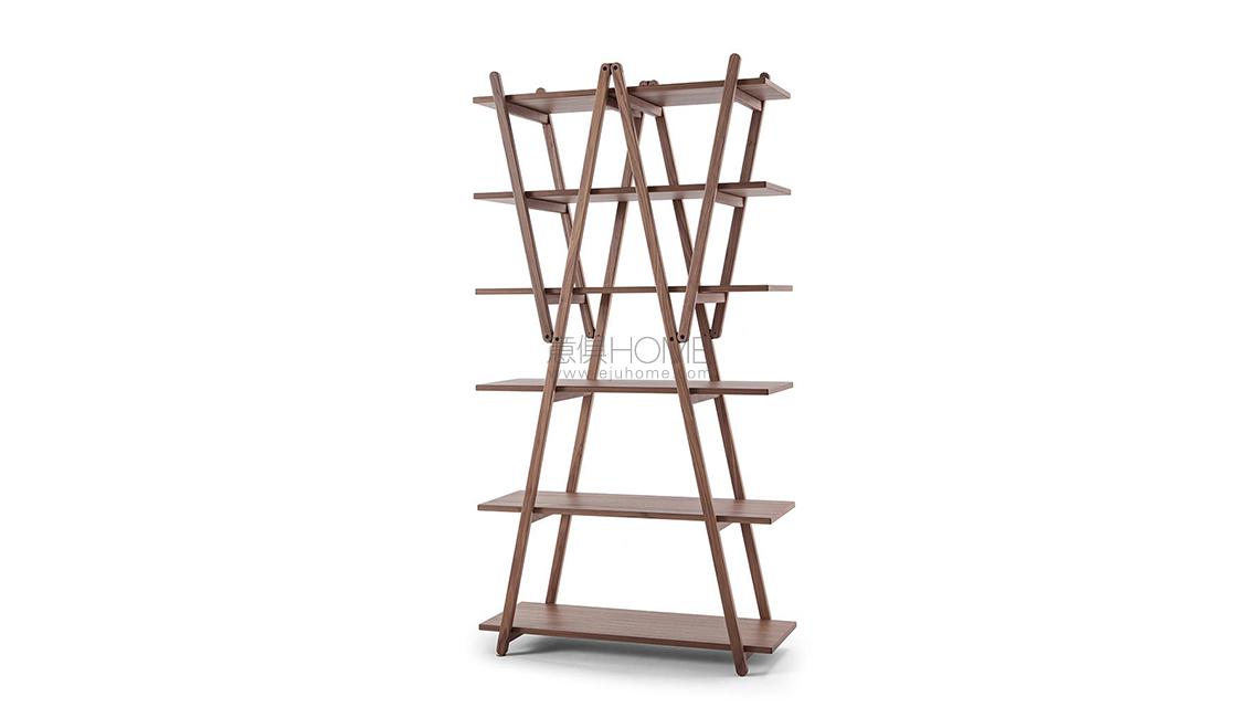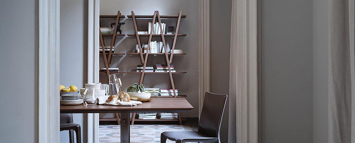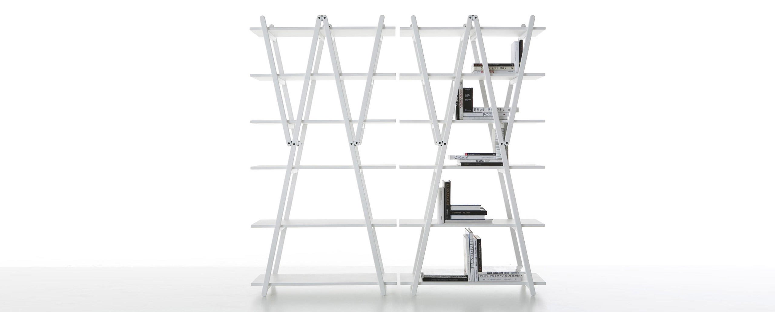 Una libreria dalle linee semplici ed essenziali, progettata da Vico Magistretti dopo una lunga analisi e interpretazione degli elementi costitutivi della classica libreria a fianchi e ripiani. Un’icona del design ma anche una vera e propria invenzione costruttiva, in cui le diagonali di controventatura diventano soggetti portanti ed elemento di sostegno per i ripiani consentendo l’eliminazione dei fianchi. La sua struttura pieghevole, utilizzabile anche come divisorio, conferisce un ruolo centrale alle cerniere e sorregge sei ripiani. L’estetica elegante e primaria, fuori dal tempo e di facile lettura, la rende un’icona indiscussa dal 1977, imitata a più riprese quale esempio di funzione semplificata attraverso il gioco delle forme.