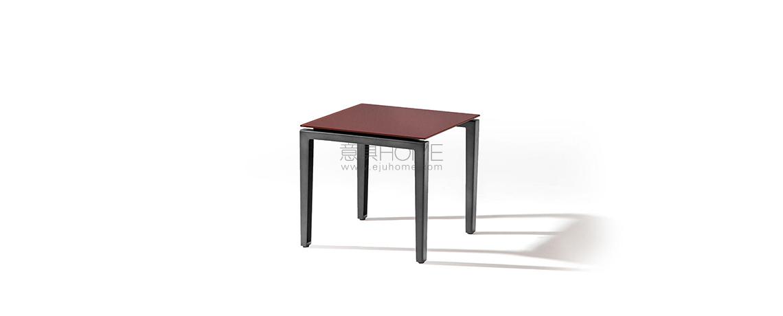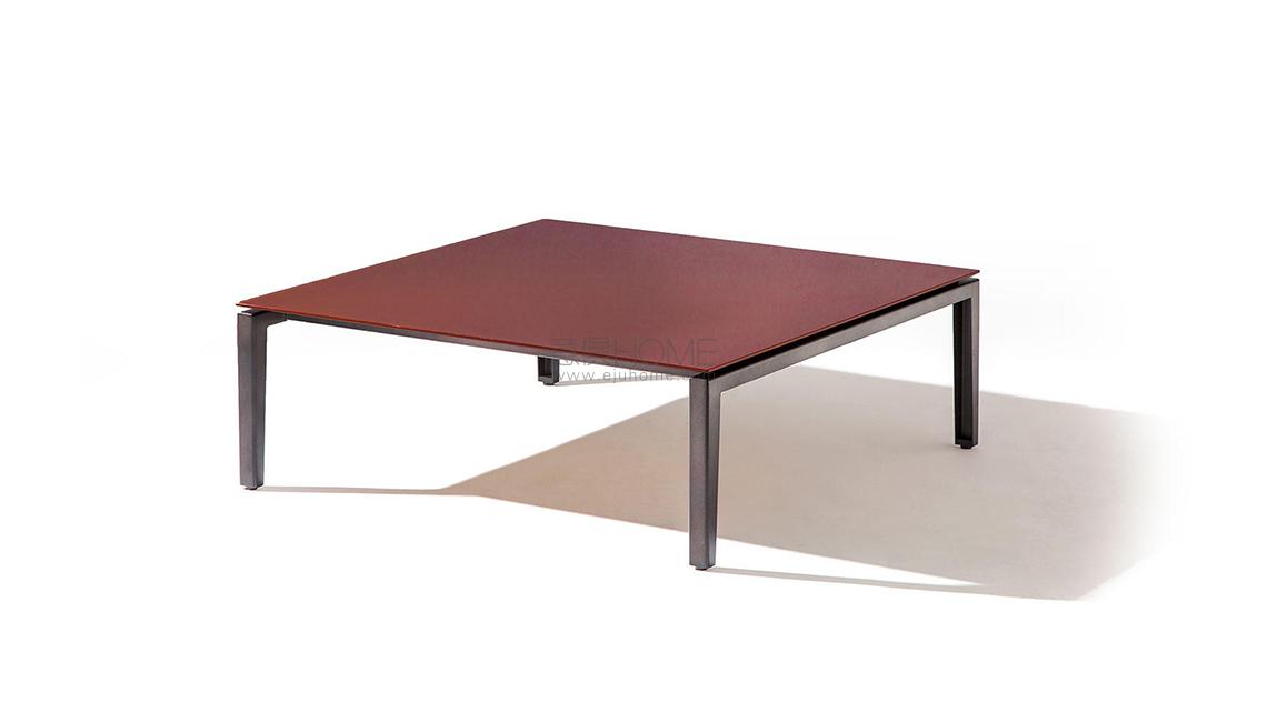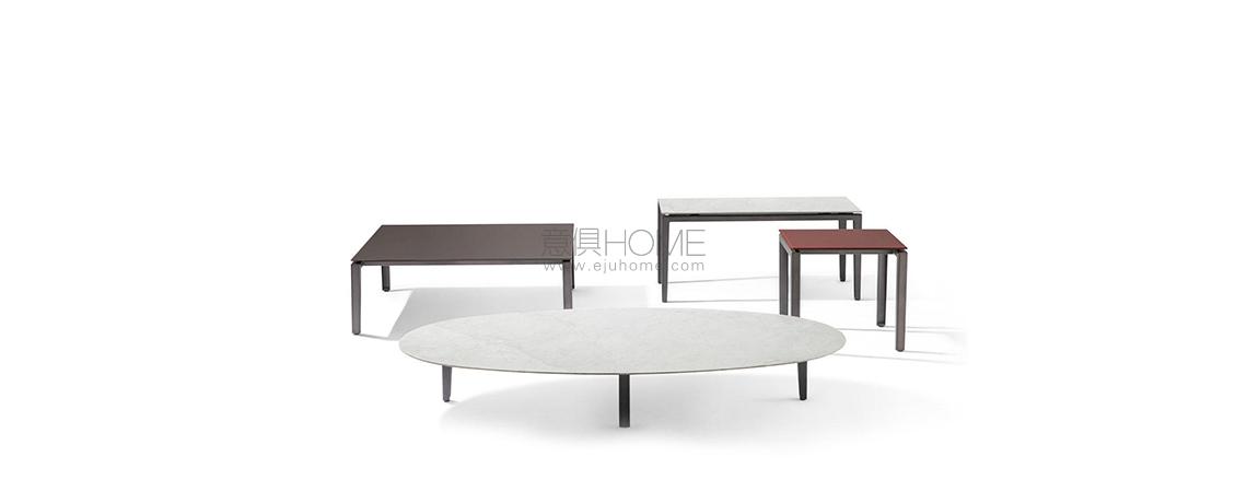 Serie di tavolini, di forma quadrata, ovale e rettangolare, di differenti dimensioni e altezze. Basamento in metallo verniciato opaco nei colori antracite o marrone castagno. Piani in marmo Carrara bianco o marmo Marqui?a nero oppure in vetro nei colori rosso mattone o caffè.