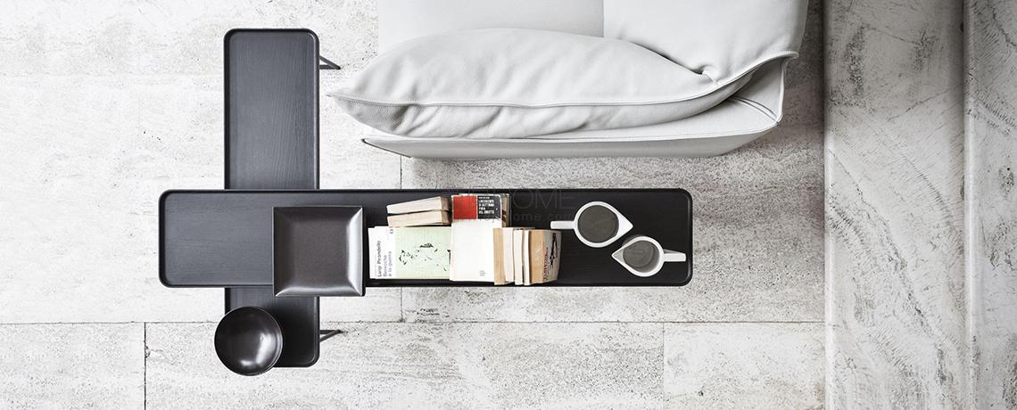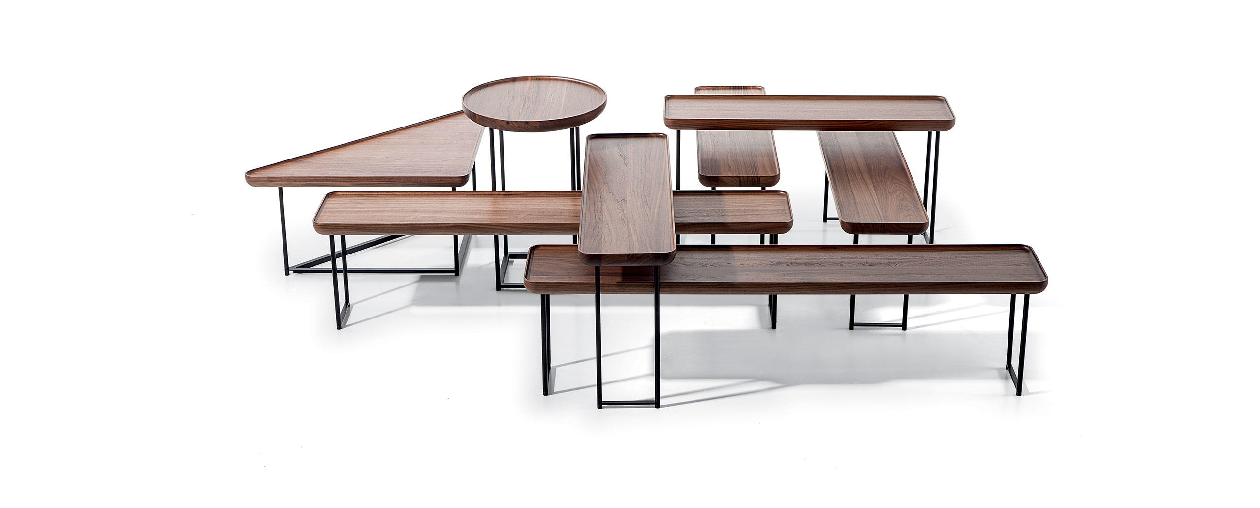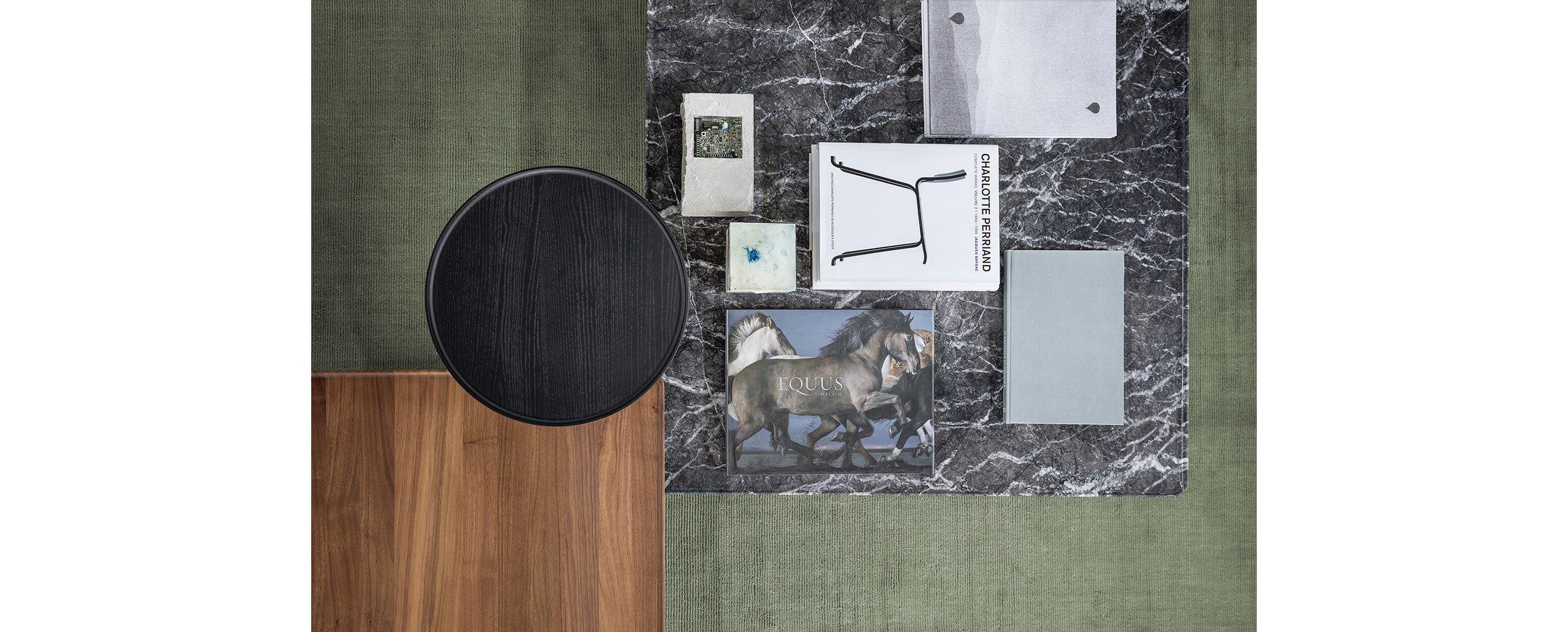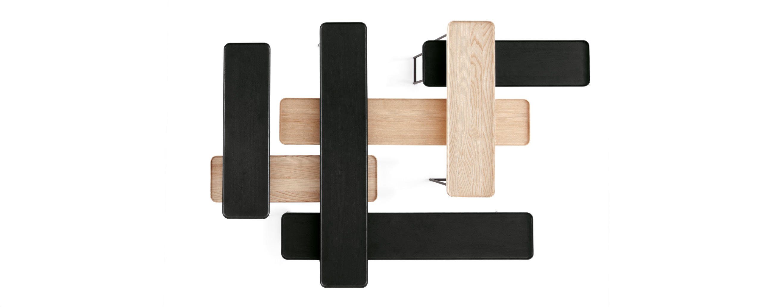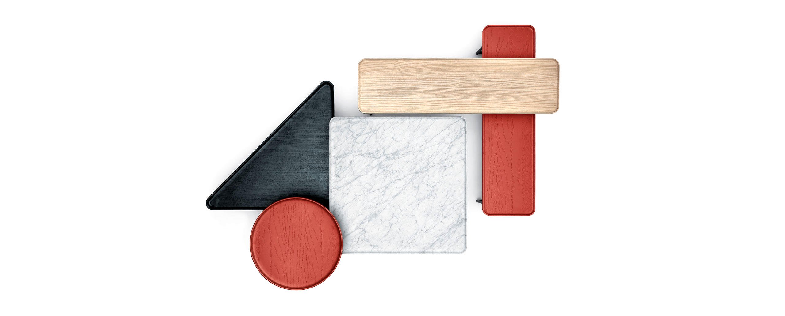 Eleganza e versatilità contraddistinguono una collezione di tavolini in continua evoluzione, facilmente intersecabili e combinabili in base allo spazio e alla destinazione d’uso. Il richiamo all’essenzialità giapponese si rivela nel minimalismo delle geometrie tonde, quadrate e triangolari, declinate in frassino naturale e in tre tipologie di marmo che includono il bianco Carrara, il nero Marqui?a e il grigio Carnico. Le diverse altezze e forme si uniscono e alternano per costruire piccole architetture d’appoggio che esprimono una particolare propensione all’ospitalità e alla condivisione.
