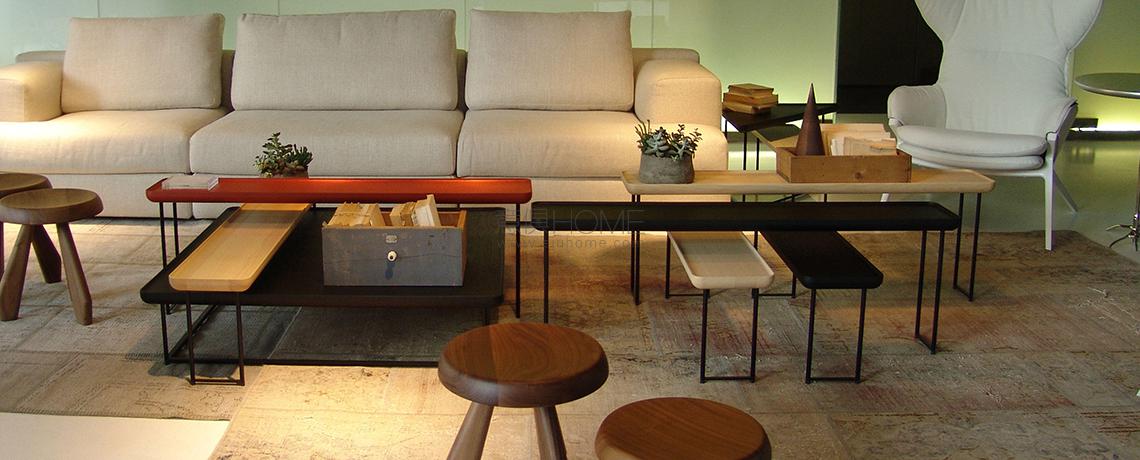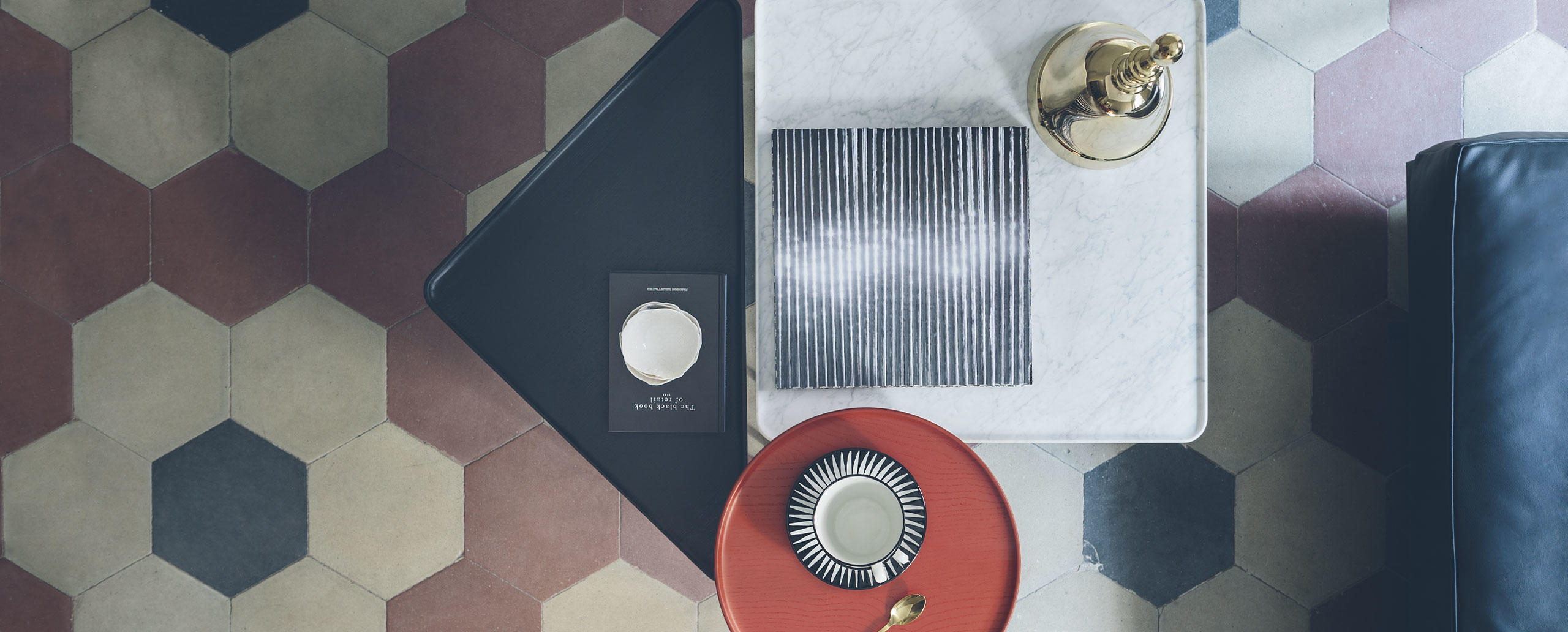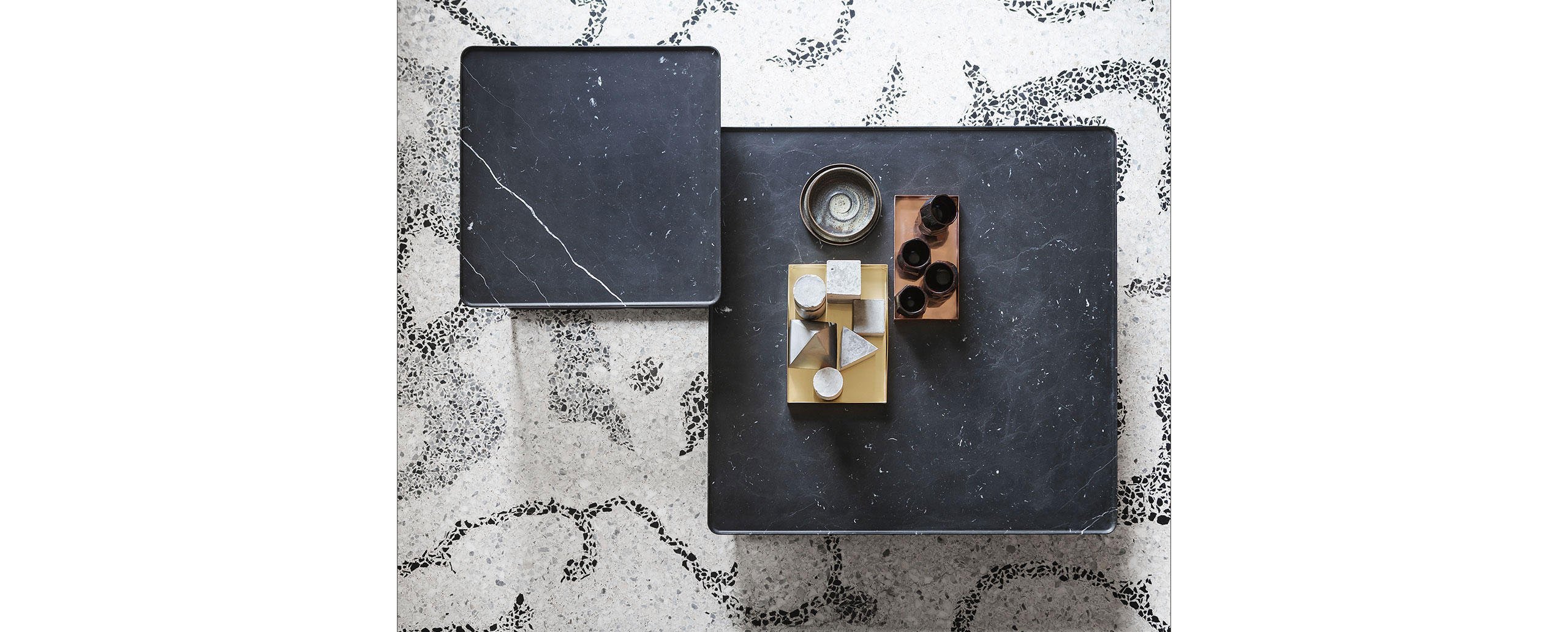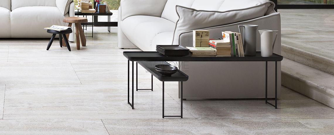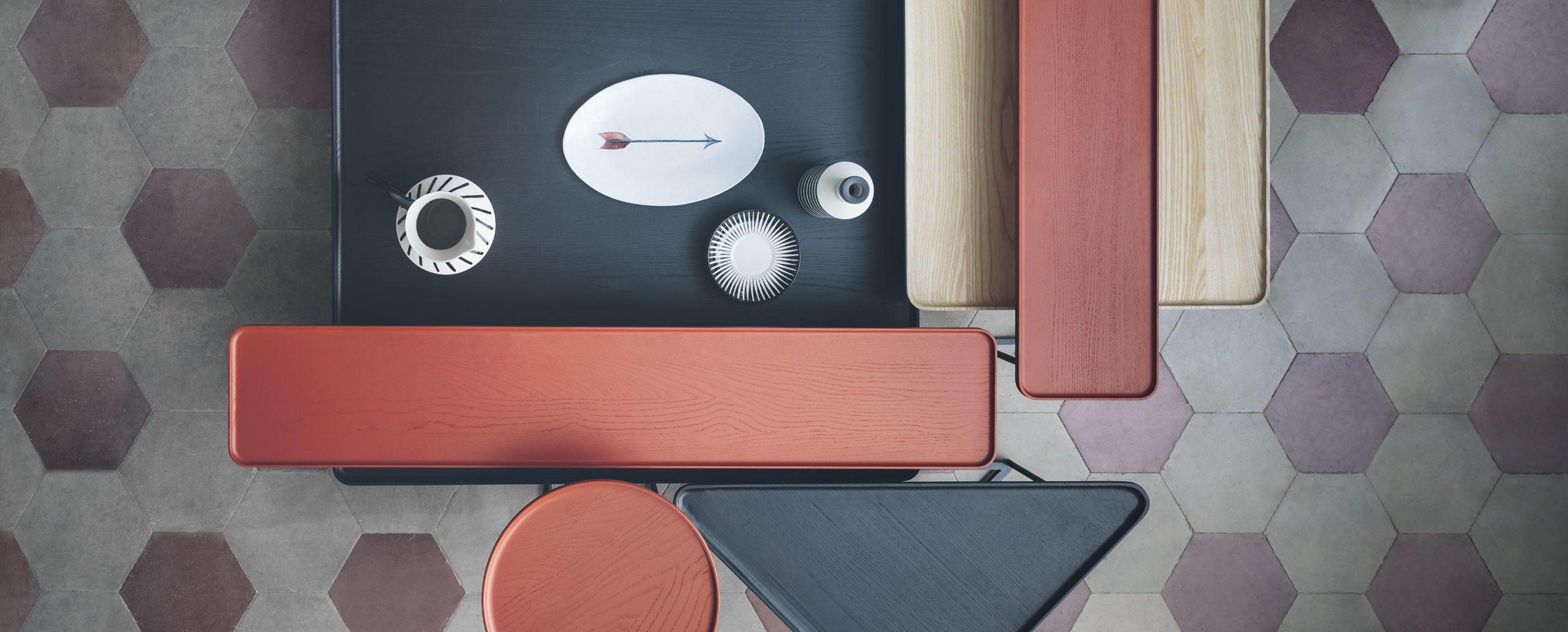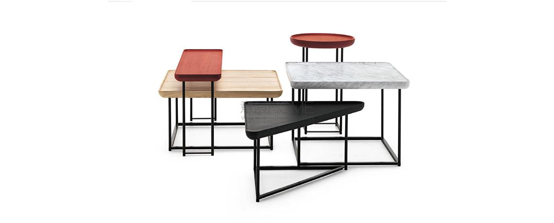 Eleganza e versatilità contraddistinguono una collezione di tavolini in continua evoluzione, facilmente intersecabili e combinabili in base allo spazio e alla destinazione d’uso. Il richiamo all’essenzialità giapponese si rivela nel minimalismo delle geometrie tonde, quadrate e triangolari, declinate in frassino naturale e in tre tipologie di marmo che includono il bianco Carrara, il nero Marqui?a e il grigio Carnico. Le diverse altezze e forme si uniscono e alternano per costruire piccole architetture d’appoggio che esprimono una particolare propensione all’ospitalità e alla condivisione.