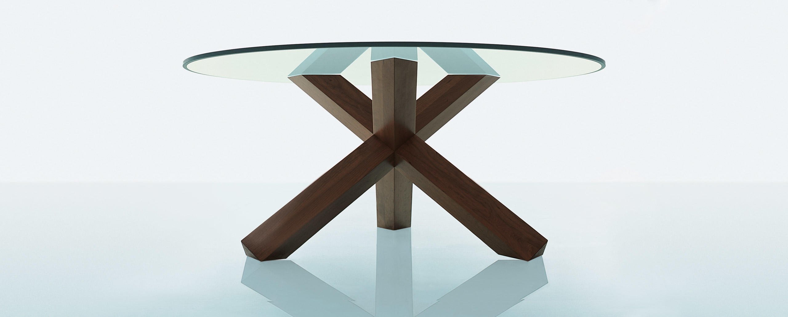 La Rotonda è un tavolo che trasforma il calore e l’essenza del legno in bellezza, presentando una base semplice e scultorea in cui tre gambe a sezione quadrata si incrociano perpendicolarmente incastrandosi e compenetrandosi alla perfezione per sostenere il piano sottile. I tre elementi sono uniti da incastri solidi direttamente ricavati dal massello grazie alla straordinaria padronanza di Cassina nella lavorazione del legno, sempre in equilibrio tra qualità tecnica e raffinatezza estetica. Le basi sono disponibili in un’ampia varietà di legni, con piano in legno o cristallo, cui si aggiungono le nuove versioni in marmo bianco Carrara, nero Marqui?a e marrone Emperador.