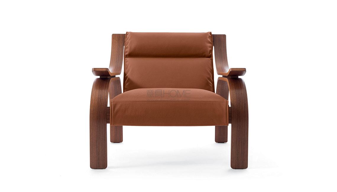 Una poltrona dal design deciso e rigoroso, sviluppata da Zanuso attraverso una ricerca sulla possibilità di ancorare un elemento di seduta ad una struttura portante in legno. Lo studio fu inizialmente compiuto nel 1949, per il concorso internazionale di design al MoMA di New York, e successivamente ripreso nel 1964 facendo leva sulla tecnologia avanzata di Arflex. Lo scheletro in legno è progettato partendo da una matrice basata sulla geometria del cerchio, che conferisce alla seduta un’estetica elegantemente formale. Disponibile in un’edizione iconica con struttura in noce tinto noce, pannello in cuoio beige e cuscinatura in pelle color tabacco.