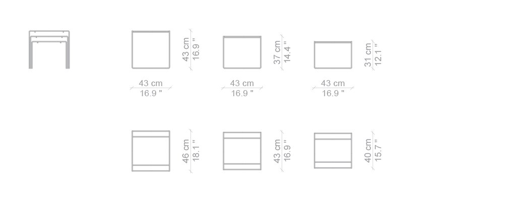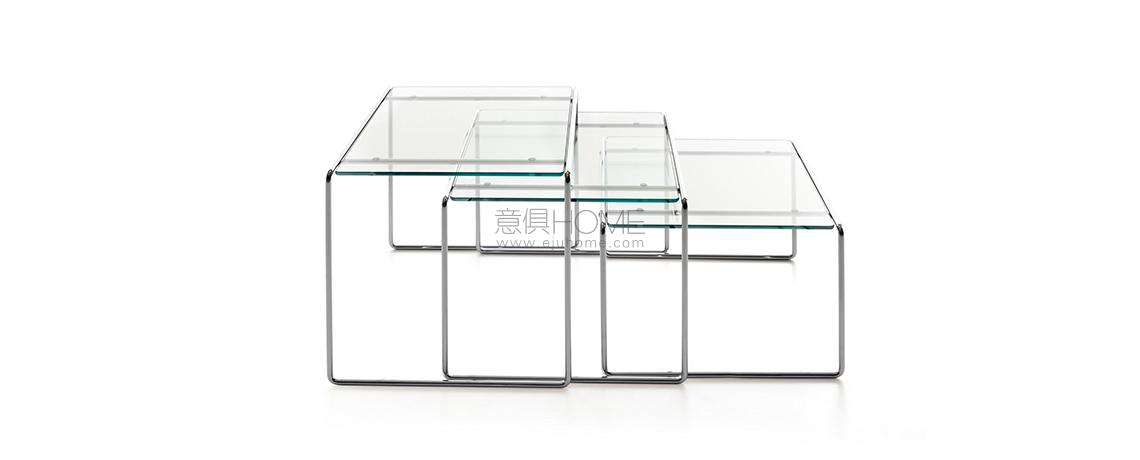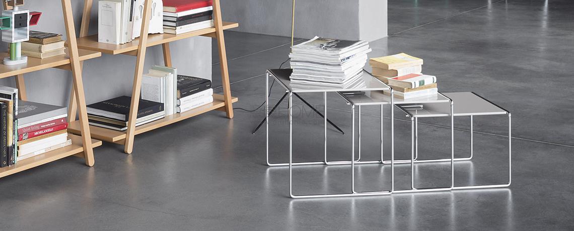 Un trittico di tavolini sovrapponibili, realizzati applicando il tondino d’acciaio cromato, tratto distintivo di molti progetti firmati dal maestro. Il modello è disponibile con piani in vetro float trasparente e con piani verniciati poliestere con finitura lucida opaca o specchiante.