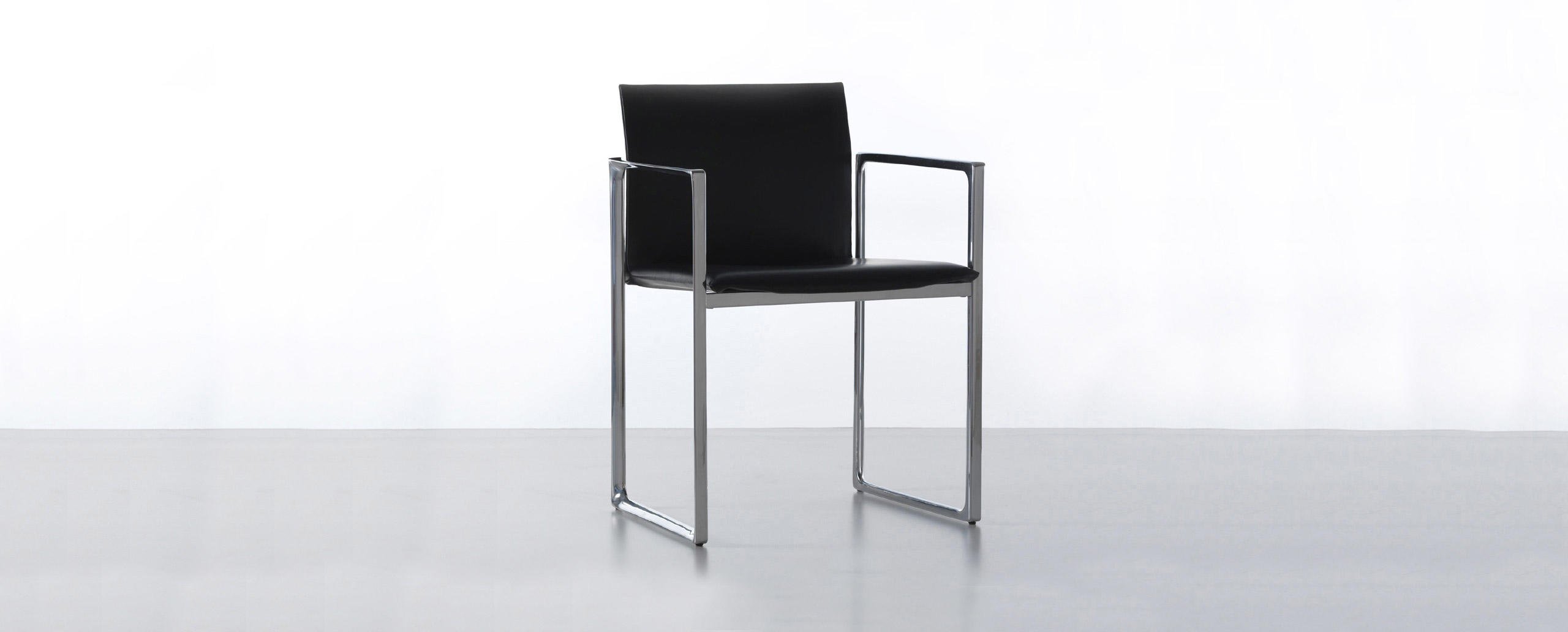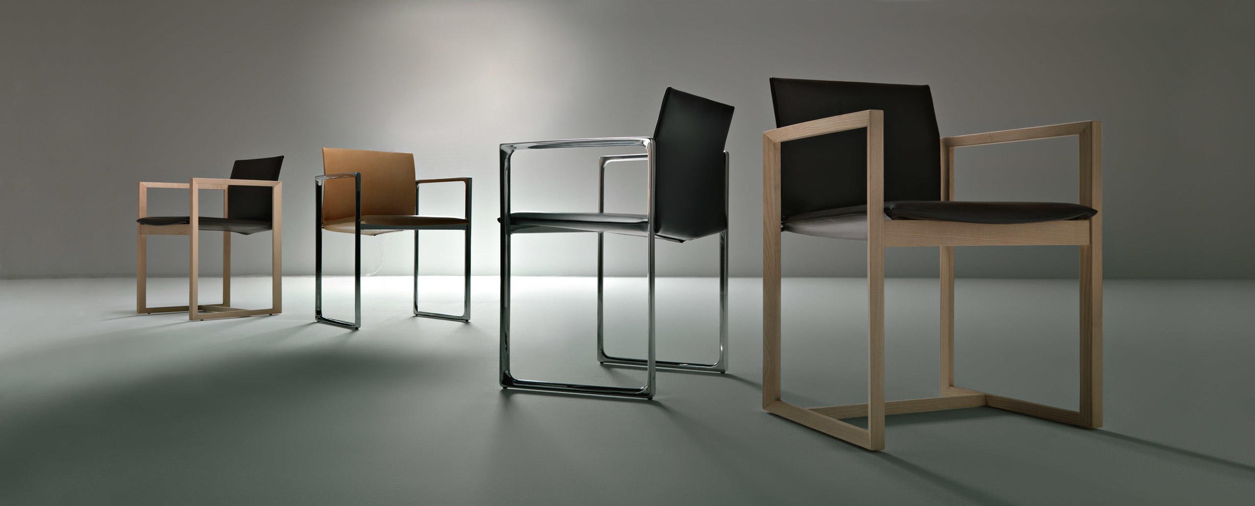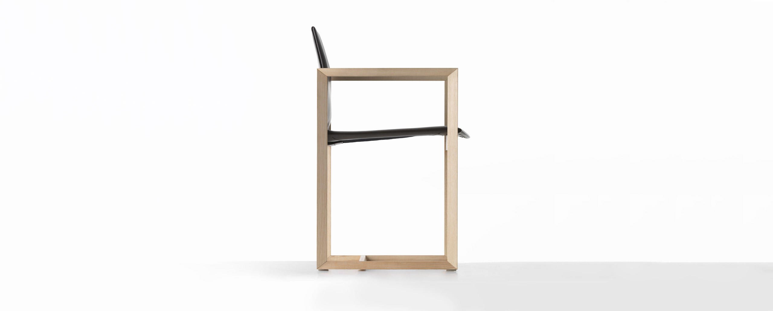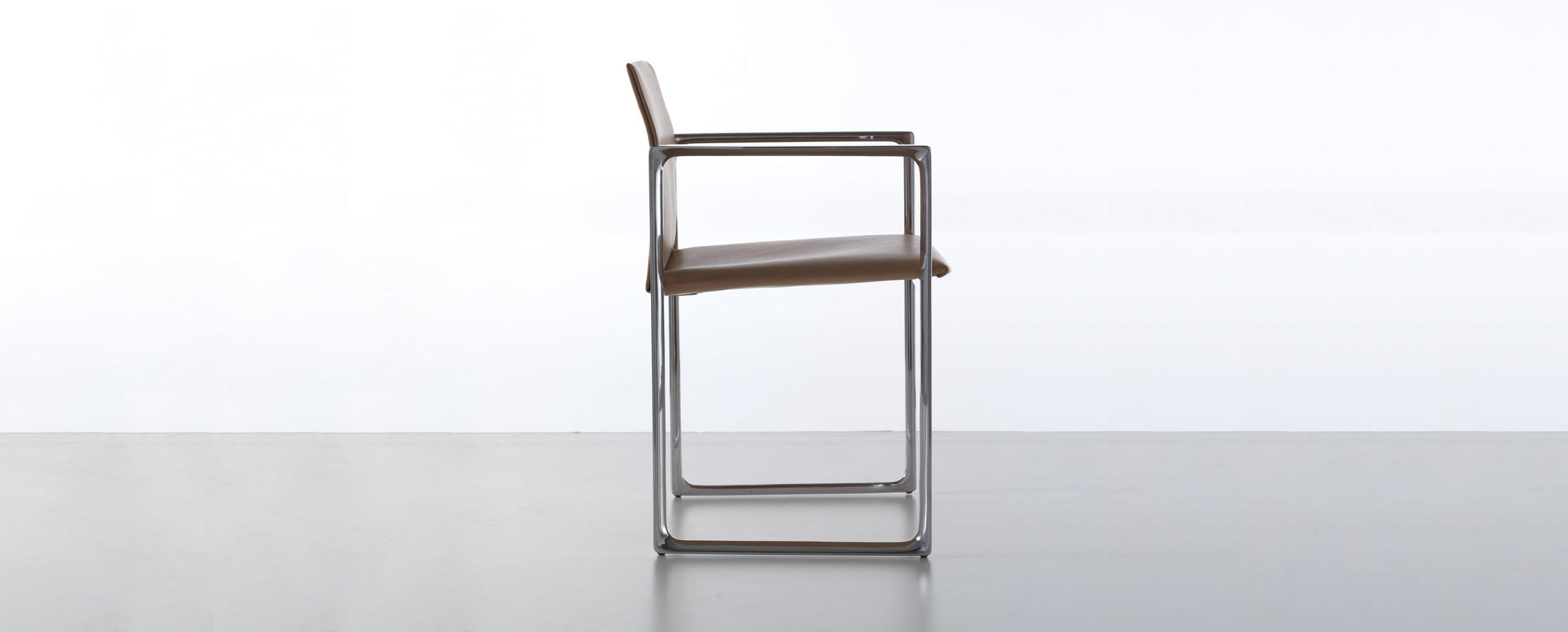 Una sedia dall’anima duplice, proposta da Cassina nelle versioni in legno o metallo. La stessa forma cambia personalità in base al materiale utilizzato, mantenendo comunque inalterati il sedile e lo schienale in cuoio. La geometria semplice della struttura diventa più calda e naturale nel modello in noce o frassino, ideale per gli ambienti domestici. Le linee si fanno invece più sottili e d’impatto nella variante in fusione di alluminio dedicata agli spazi office e contract. L’innovativo assemblaggio delle parti in pelle rivela un gioco sapiente di tagli e piegature che evidenziano la maestria artigianale dell’azienda: il rivestimento è concepito come una “busta” priva di cuciture a vista da inserire sopra la struttura. Estrema attenzione è rivolta anche all’aspetto funzionale, agevolato da una scocca in materiale plastico termoformato accoppiato con un sottile strato di poliuretano, mentre la linea stondata del sedile aumenta l’effetto comfort.