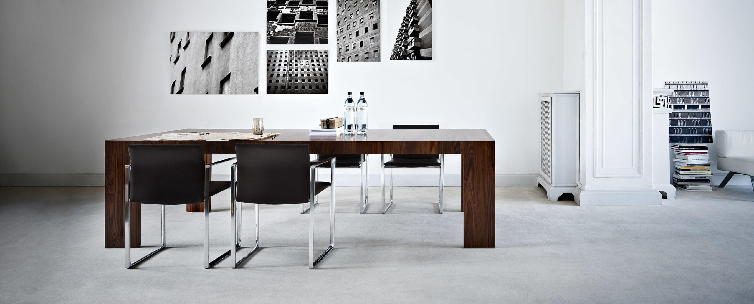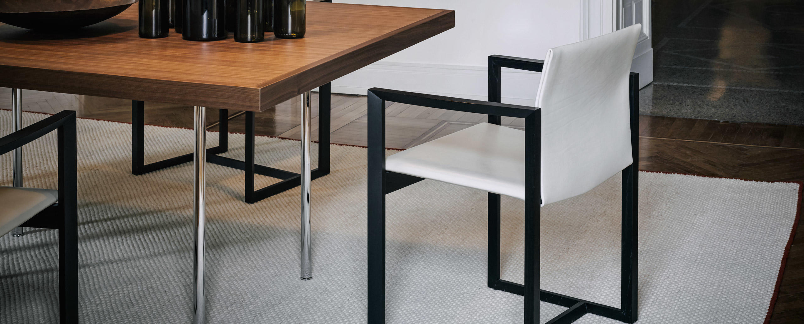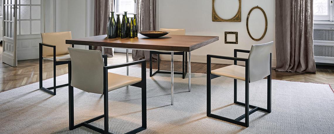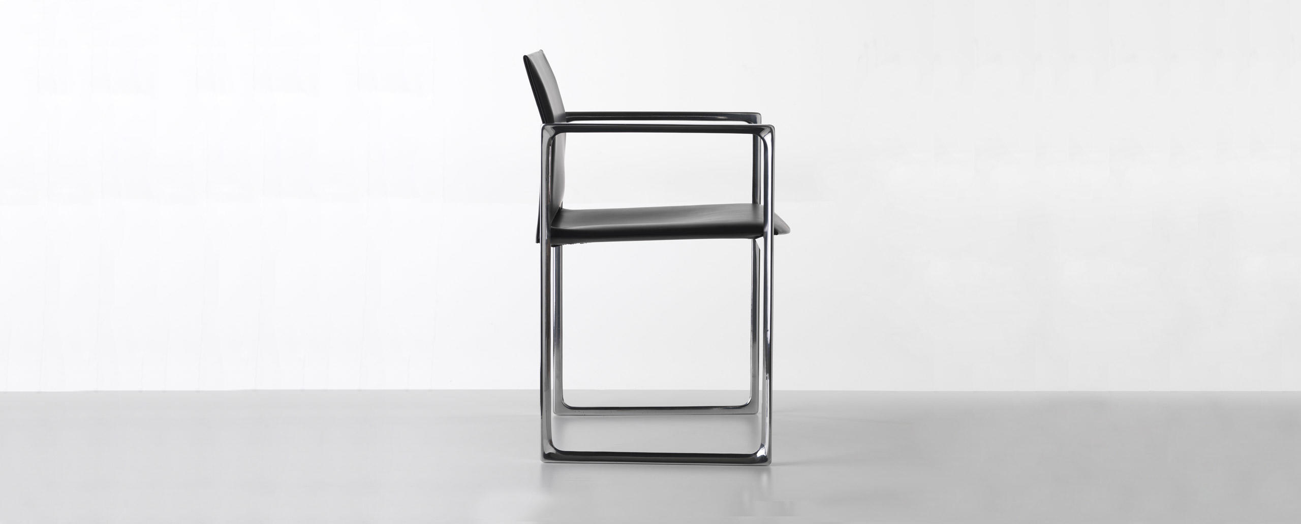 Una sedia dall’anima duplice, proposta da Cassina nelle versioni in legno o metallo. La stessa forma cambia personalità in base al materiale utilizzato, mantenendo comunque inalterati il sedile e lo schienale in cuoio. La geometria semplice della struttura diventa più calda e naturale nel modello in noce o frassino, ideale per gli ambienti domestici. Le linee si fanno invece più sottili e d’impatto nella variante in fusione di alluminio dedicata agli spazi office e contract. L’innovativo assemblaggio delle parti in pelle rivela un gioco sapiente di tagli e piegature che evidenziano la maestria artigianale dell’azienda: il rivestimento è concepito come una “busta” priva di cuciture a vista da inserire sopra la struttura. Estrema attenzione è rivolta anche all’aspetto funzionale, agevolato da una scocca in materiale plastico termoformato accoppiato con un sottile strato di poliuretano, mentre la linea stondata del sedile aumenta l’effetto comfort.