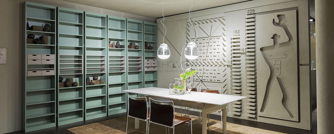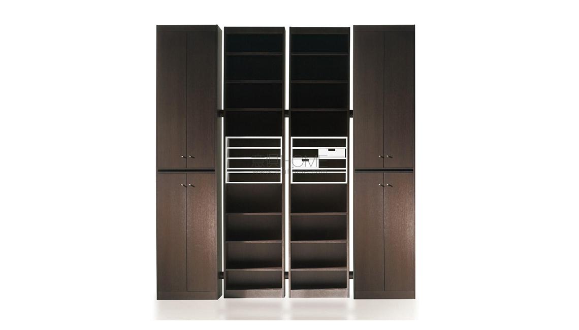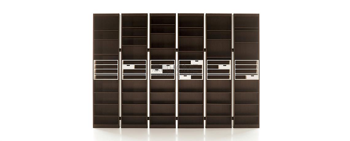 Questa libreria, realizzata negli anni’70 da Carlo Scarpa per la sua casa, fu in seguito ridisegnata su richiesta di Dino Gavina per essere compatibile con i processi della produzione industriale. Gli elementi componibili mediante un distanziatore, tratto iconico del progetto, sono disponibili con lavorazione impiallacciata in frassino naturale o tinto nero oppure interamente laccata opaca. Altrettanto distintivo è il blocco centrale costituito da ripiani o piccoli cassetti verniciati con finitura opaca.