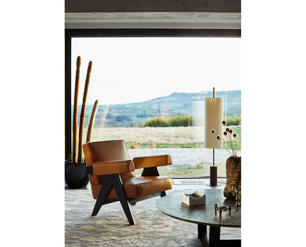 L'inclusione nella lista del patrimonio mondiale Unesco avvenuta nel 2016 ha suscitato un grande interesse verso il Capitol Complex di Le Corbusier, una straordinaria opera architettonica realizzata a Chandigarh nel 1951 per celebrare l’indipendenza di una nazione che si apre alla modernità. L’Haute Cour, insieme al Secretariat e all’edificio dell’Assemblée, costituisce il nucleo fondativo del Capitol Complex di Chandigarh. Nelle sue sale erano presenti comode poltrone dalla corposa imbottitura. In esse si ritrova lo schema compositivo degli arredi caratterizzati dalla tipologia a “V” dei sostegni. Gli appoggi, insieme ai traversi di connessione e alla parte finale di giunzione dei braccioli con lo schienale, sono le uniche parti in legno a vista. L’imbottitura del bracciolo avvolge quasi completamente il bracciolo, disegnando di testa una geometrica sagoma arrotondata, e insieme ai cuscini sedile e schienale nitidamente distinti, restituisce una idea di comfort immediata, non disgiunta da eleganza e semplicità. La riedizione Cassina propone oltre alla storica versione in teak, due versioni in rovere naturale e tinto nero.