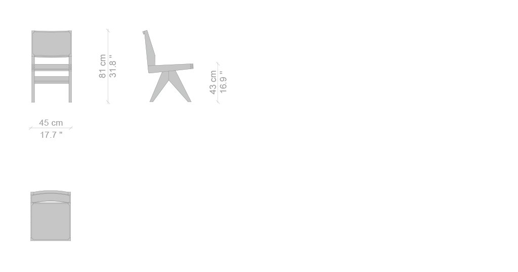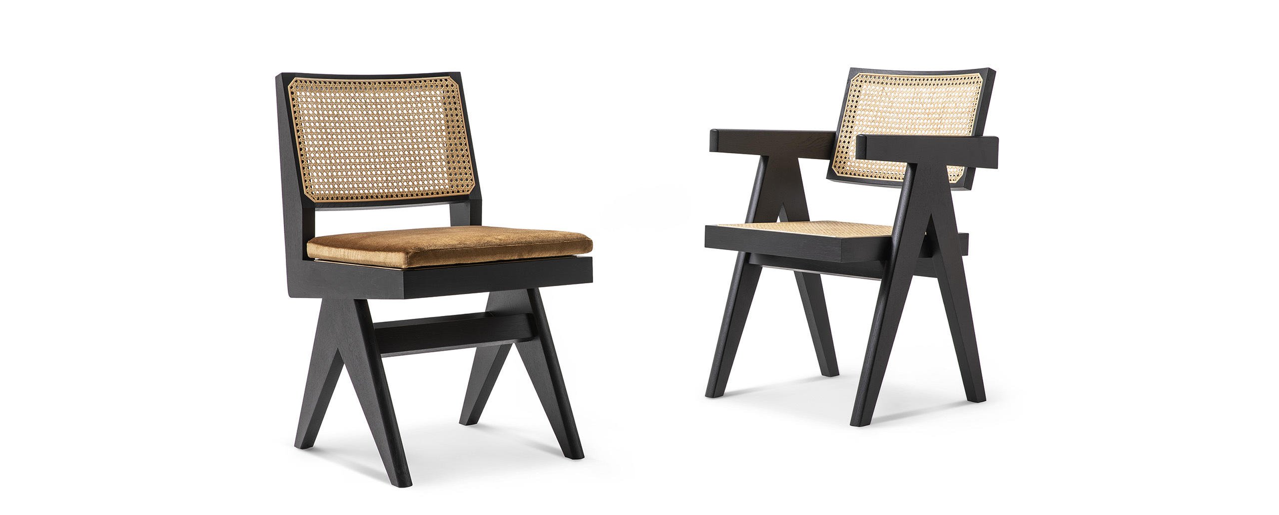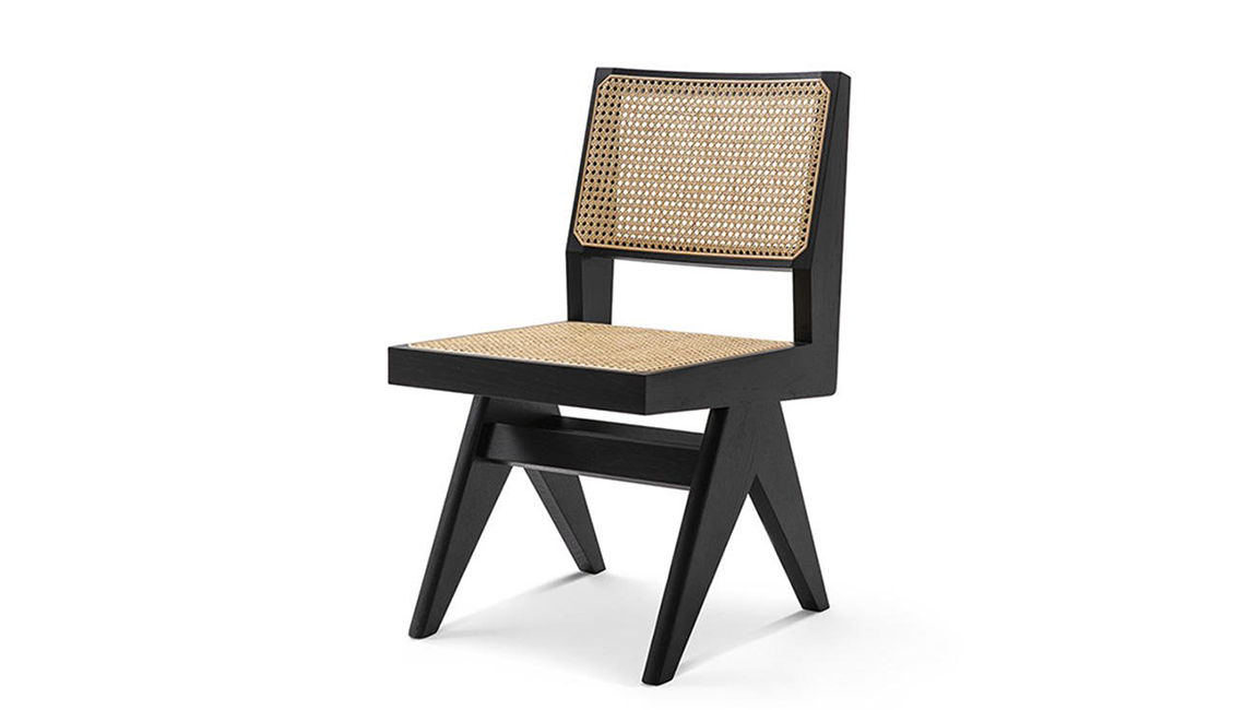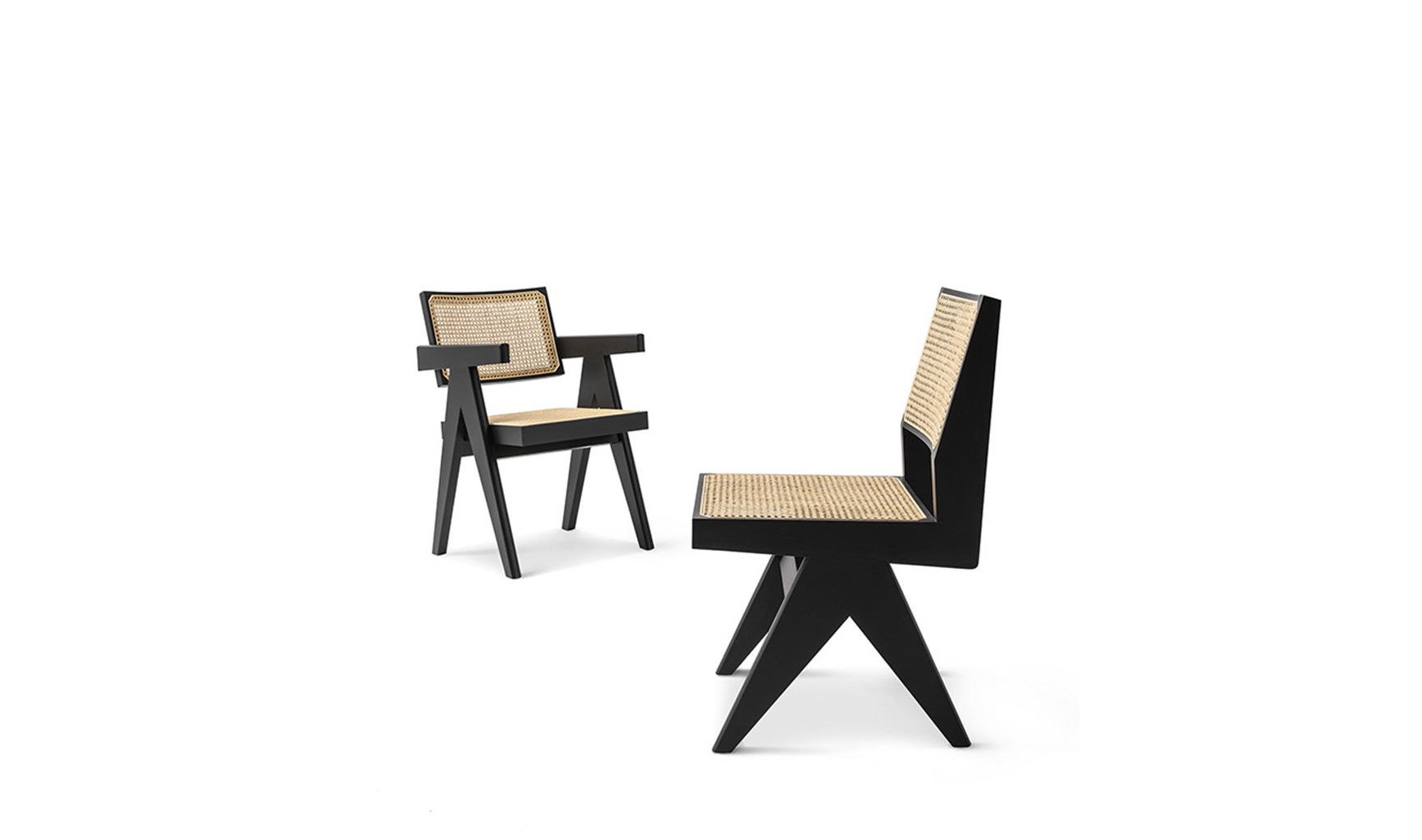 Questa sedia è uno dei modelli più conosciuti tra gli arredi del Capitol Complex di Chandigarh e si trovava in diversi uffici amministrativi del palazzo del Secretariat. E’ costituita da elementi separati tra cui i sostegni laterali posizionati a forma di “V” rovesciata per convergere a sostenere il bracciolo anch’esso in massello. L’impagliatura del sedile e dello schienale all’interno di un telaio in legno sono invece elementi caratteristici dello spirito del luogo, espresso anche nell’uso di legni locali come il teak. In coerenza con la più conosciuta Office Chair, la sedia senza braccioli utilizza anche essa la tipologia a “V” degli appoggi, in tal caso più ridotti poiché non si estendono sino al bracciolo. In essa la priorità è data alla sequenza sedile -schienale in paglia di Vienna, posti in continuità e uniti da due profili in legno dalla massiccia sezione geometrica, elementi che strutturano, con le gambe complanari, un insieme possente e semplice allo stesso tempo. La riedizione Cassina propone oltre alla storica versione in teak, due versioni in rovere naturale e tinto nero.