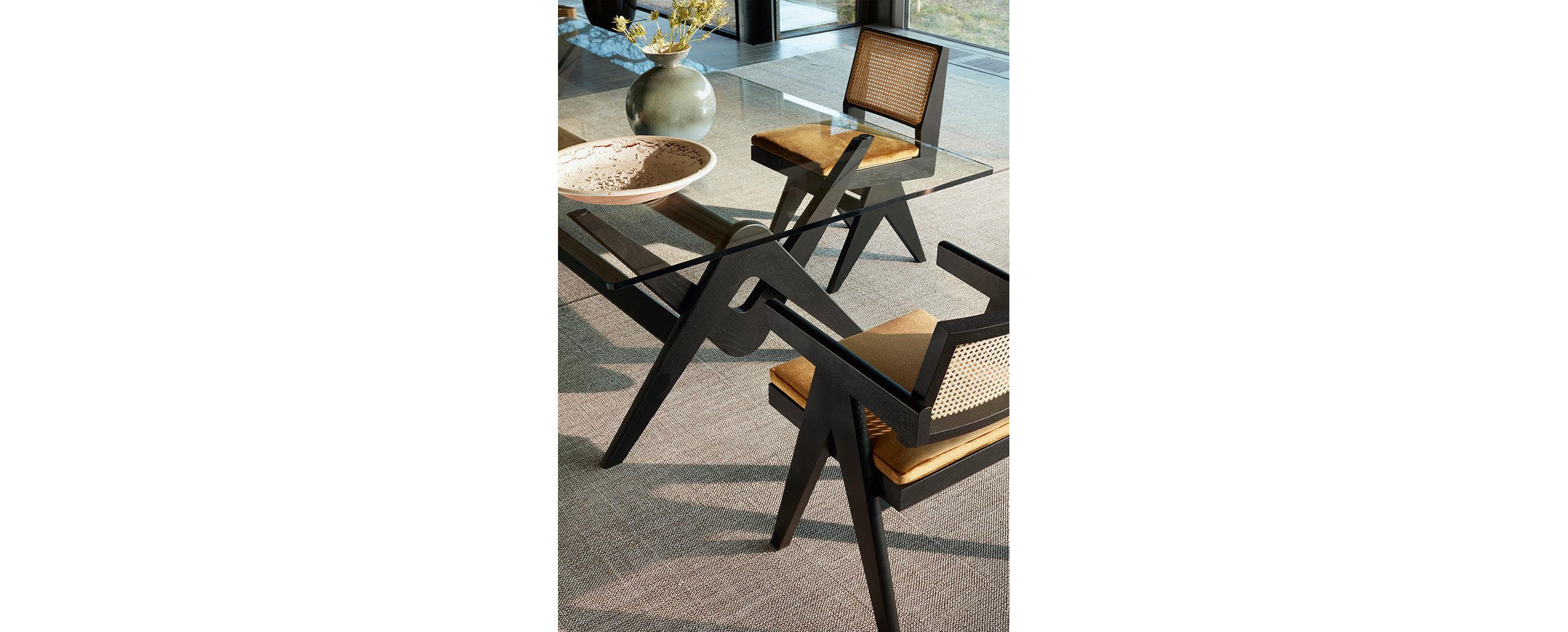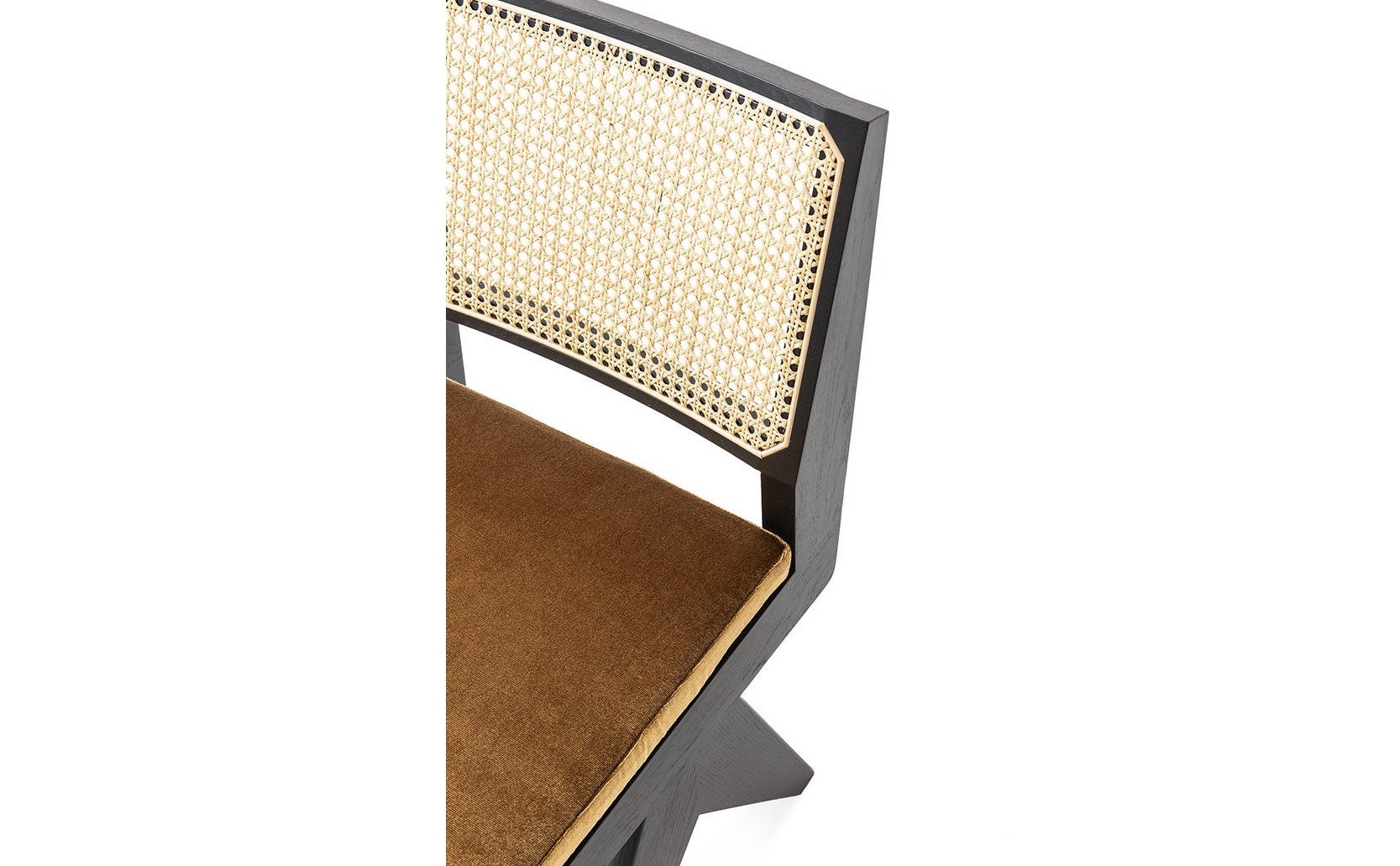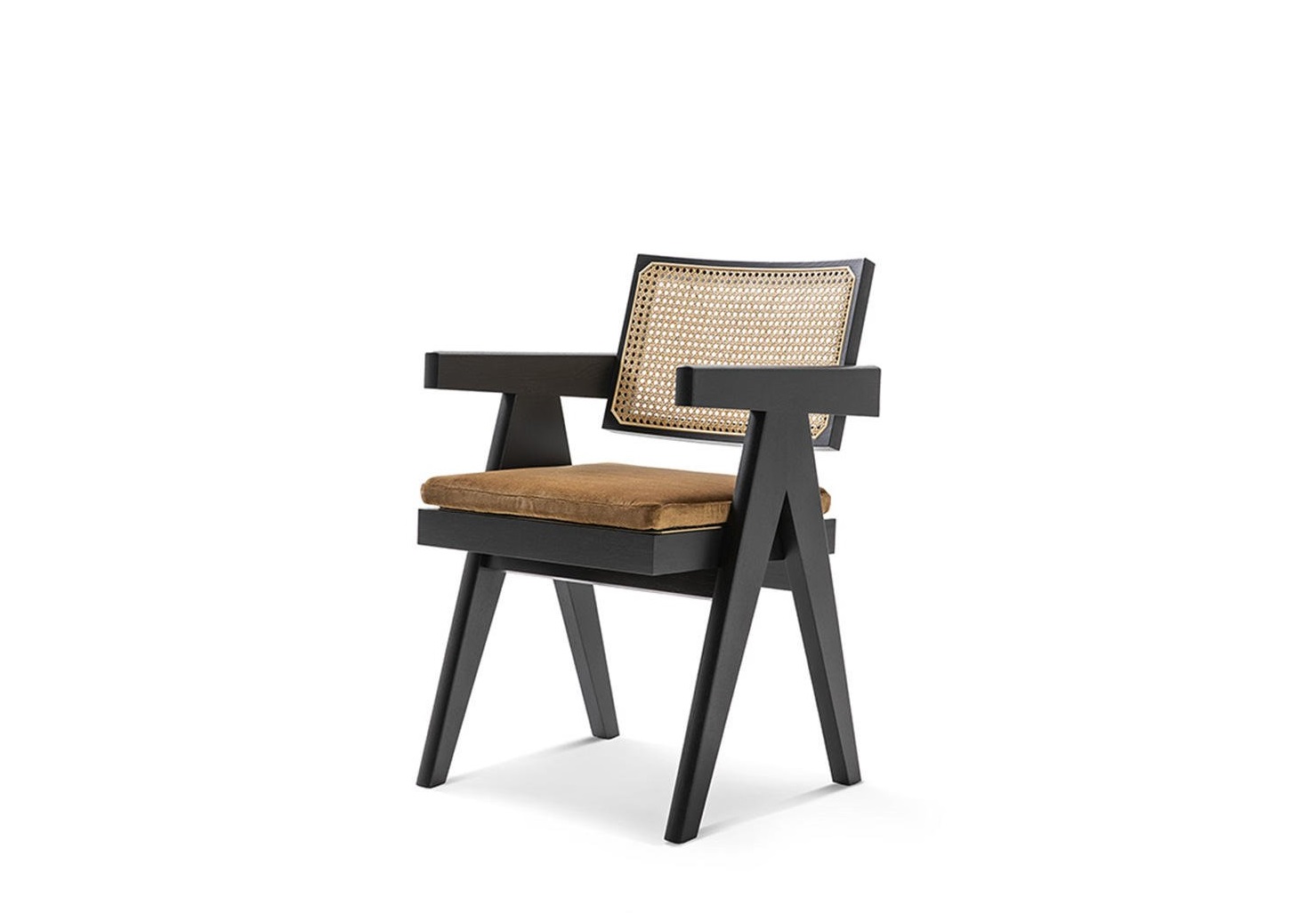 Questa sedia è uno dei modelli più conosciuti tra gli arredi del Capitol Complex di Chandigarh e si trovava in diversi uffici amministrativi del palazzo del Secretariat. E’ costituita da elementi separati tra cui i sostegni laterali posizionati a forma di “V” rovesciata per convergere a sostenere il bracciolo anch’esso in massello. L’impagliatura del sedile e dello schienale all’interno di un telaio in legno sono invece elementi caratteristici dello spirito del luogo, espresso anche nell’uso di legni locali come il teak. In coerenza con la più conosciuta Office Chair, la sedia senza braccioli utilizza anche essa la tipologia a “V” degli appoggi, in tal caso più ridotti poiché non si estendono sino al bracciolo. In essa la priorità è data alla sequenza sedile -schienale in paglia di Vienna, posti in continuità e uniti da due profili in legno dalla massiccia sezione geometrica, elementi che strutturano, con le gambe complanari, un insieme possente e semplice allo stesso tempo. La riedizione Cassina propone oltre alla storica versione in teak, due versioni in rovere naturale e tinto nero.