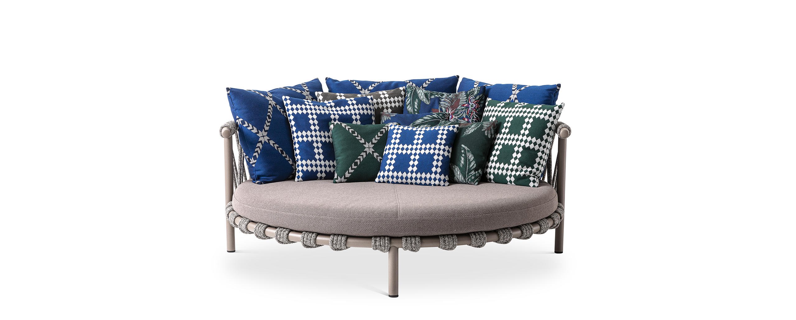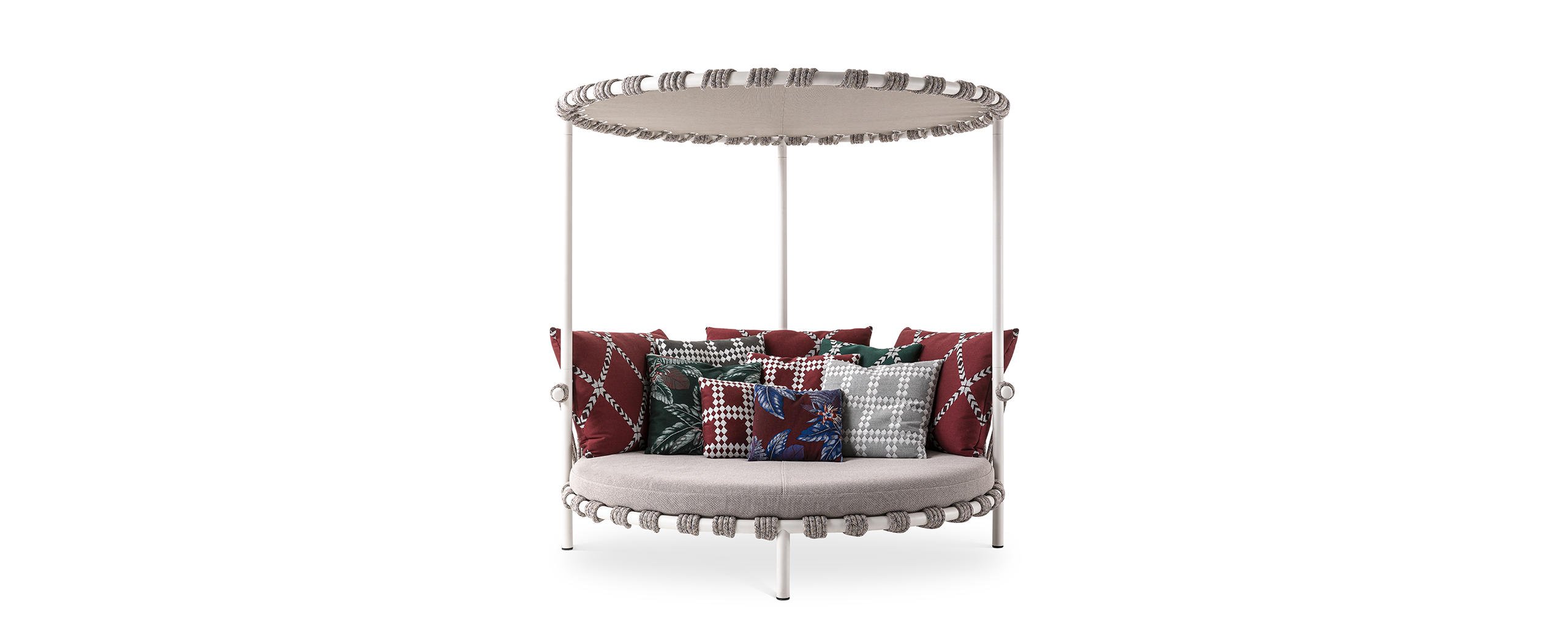 Patricia Urquiola interpreta la felicità della vita all’aria aperta con un prodotto di forte impatto, ispirato ai piccoli trampolini presenti nei giardini delle case in Groenlandia. Trampoline è un love bed con struttura in acciaio Inox AISI 304 verniciato, scenografico ed elegante, dalle forme morbide e giocose, perfetto per popolare accoglienti spazi open air; un’isola di relax e comfort grazie a un set di tre cuscini per lo schienale e a due tipologie di cuscini aggiuntivi, tutti in poliuretano espanso ricoperto con morbida ovatta di poliestere e rivestiti da tela idrorepellente. è disponibile sia in versione divano basso sia divano con baldacchino – per ripararsi dal sole –, entrambi caratterizzati dall’intreccio realizzato a mano in corda di polipropilene e nylon, in mélange o in multicolore, che avvolge la base e lo schienale, e che diventa decorazione distintiva.