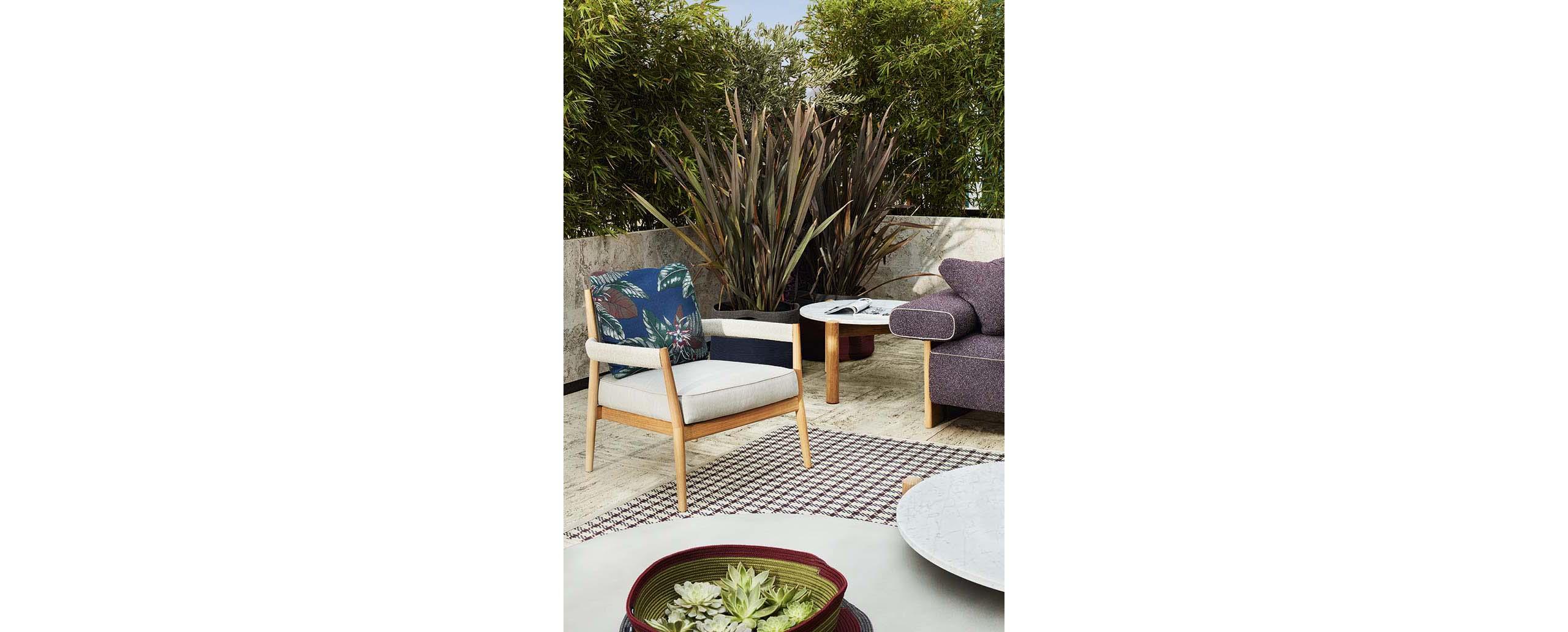 Il primo esemplare storico è stato realizzato nel 1937 per l’atelier di Charlotte Perriand a Montparnasse. La struttura del basamento era costituita da tre gambe a sezione circolare unite da traversi sui quali veniva appoggiato il piano, che poteva essere intercambiabile. Un progetto pensato per essere declinato in modi diversi; il modello infatti si ritroverà in molti altri e successivi progetti di Perriand, da quelli giapponesi degli anni 40, con piani o vassoi intrecciati realizzati con materiali locali, a quello dello spazio soggiorno degli appartamenti delle Unité d’Habitation a Marsiglia. Il Table à Plateau Interchangeable, oggi presente nella Collezione Cassina I Maestri, è stato sviluppato anche per uso esterno. La versione outdoor, in due misure come il modello per interni, ha una struttura in massello di teak e il piano in marmo di Carrara con finitura olio-idro.