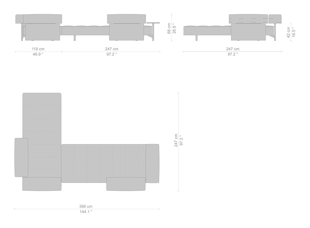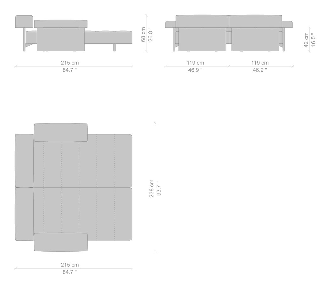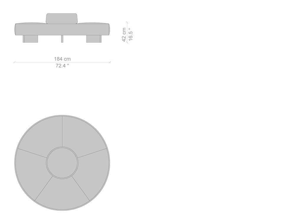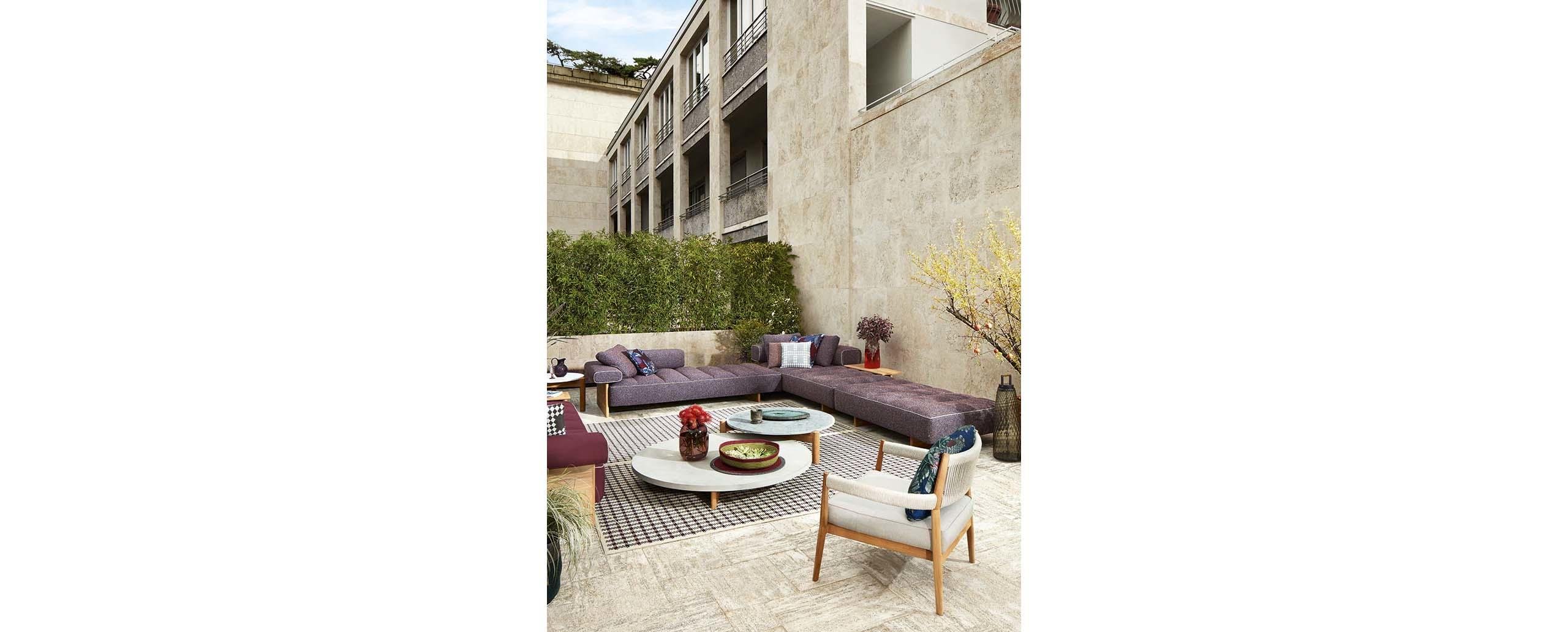 Ispirato allo spirito della villeggiatura degli anni 50, Sail Out è un divano componibile da esterno che ricorda la forma morbida dei materassini gonfiabili in tela grazie alle singole fasce con imbottitura estraibile inserite in tasche cucite singolarmente. Vanta dettagli sartoriali, come il profilo in gros-grain grigio o nello stesso tessuto del divano, e un comfort elevato dato dall’utilizzo nell’imbottitura di SoloSoff?, un prodotto a base di fibra di poliestere soffiata e memory foam. Versatile e funzionale, con un telaio in metallo, Sail Out offre un’infinita varietà di combinazioni grazie a tre moduli per la seduta – con 5, 6 o 7 fasce – e a tre elementi correlati: il tavolino in teak e il bracciolo/schienale, in due altezze, sono intercambiabili, grazie a un meccanismo di incastro sui pannelli in teak della struttura che ricorda quello dei poggiatesta delle automobili. Il divano è arricchito da un pouf rotondo, in due misure, costituito da spicchi che convergono in un piccolo vuoto nascosto per far defluire l’acqua. Appoggiato sul pouf, un cuscino zavorrato può sorreggere un vassoio oppure essere usato come bracciolo. Completa la collezione un tavolino basso.