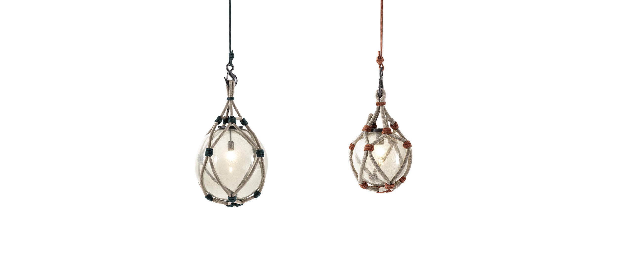 Bollicosa Nautilus ripropone la sfera di vetro soffiato della Bollicosa indoor, con la caratteristica superficie a bollicine data dalla soffiatura artigianale; le naturali irregolarità rendono ruvido e opaco il materiale, implementando la sua qualità tridimensionale, con un effetto che ricorda alla vista una pietra fossile. La versione da esterno avvolge il diffusore con una rete di corda in polipropilene color neutro, con nodi in toni a contrasto, che richiama gli intrecci realizzati a mano degli arredi della collezione outdoor di Cassina. In due misure, ? 30 cm o ? 50 cm, con vetro trasparente fumé con nodi verdi, o rosa con nodi ruggine.