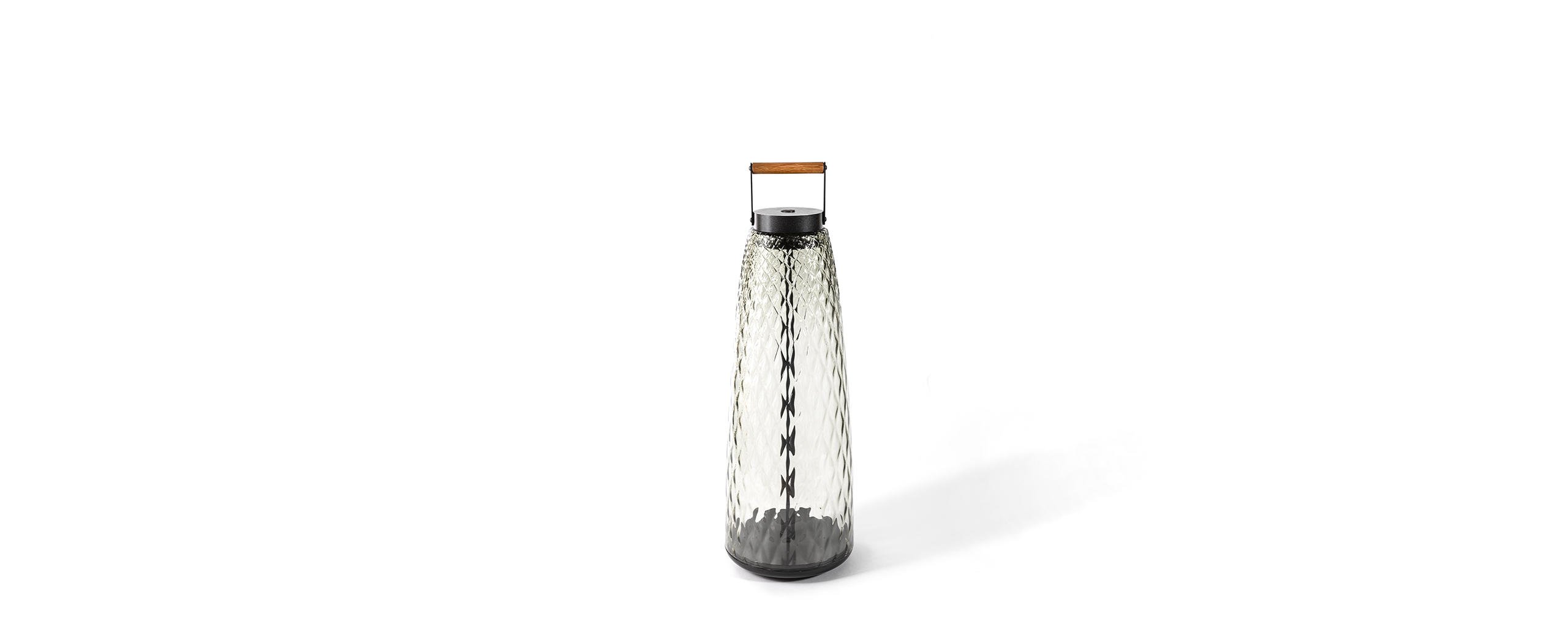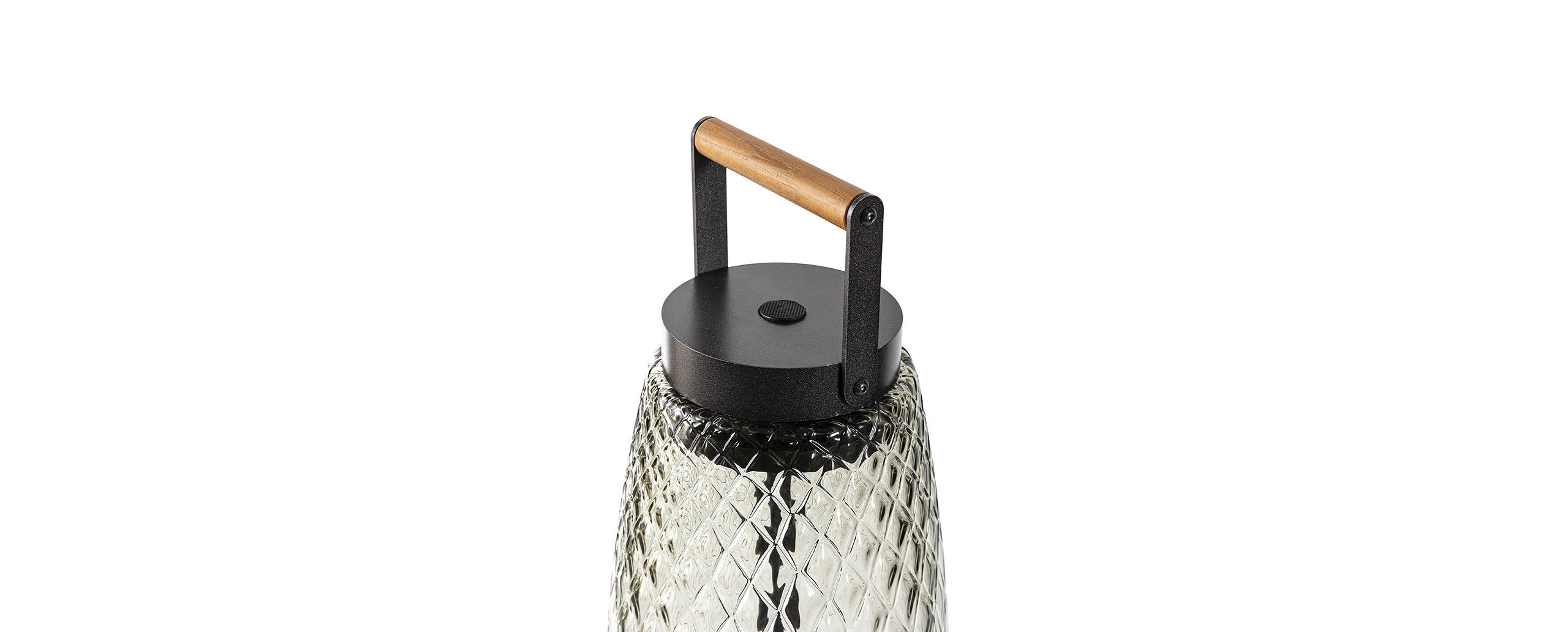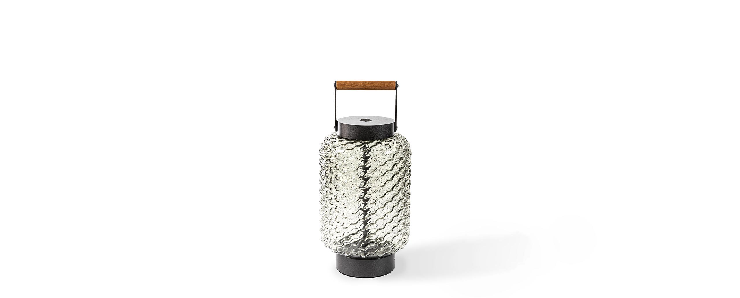 Ficupala Outdoor è una lampada versatile e funzionale. Con il suo stile eclettico, tra il postmoderno e l’Art déco, richiama le forme morbide della natura attraverso le curve dolci del vetro soffiato, qui caratterizzato da una superficie finalmente lavorata e materica. Come una lanterna, può essere posizionata secondo l’uso grazie alla sua anima tecnologica: un Led ricaricabile con cavo USB. Disponibile in un’unica misura, con vetro trasparente fumé e maniglia in legno iroko.