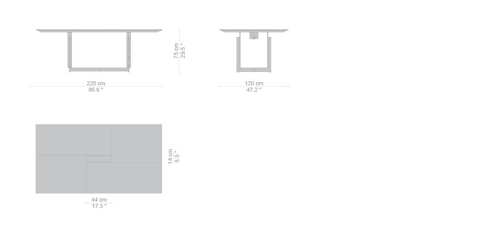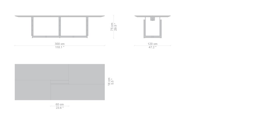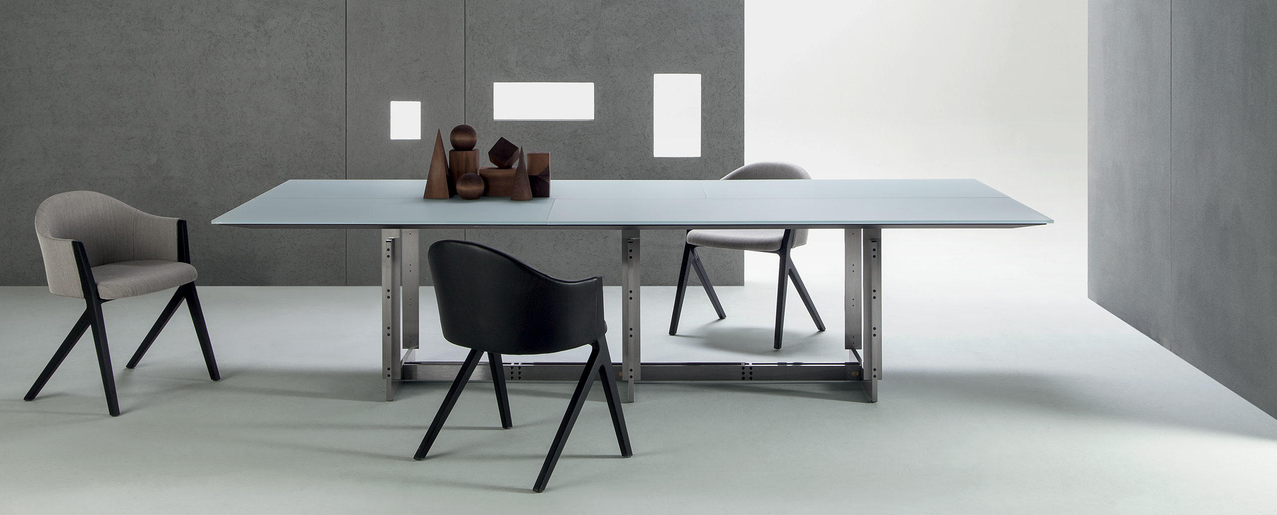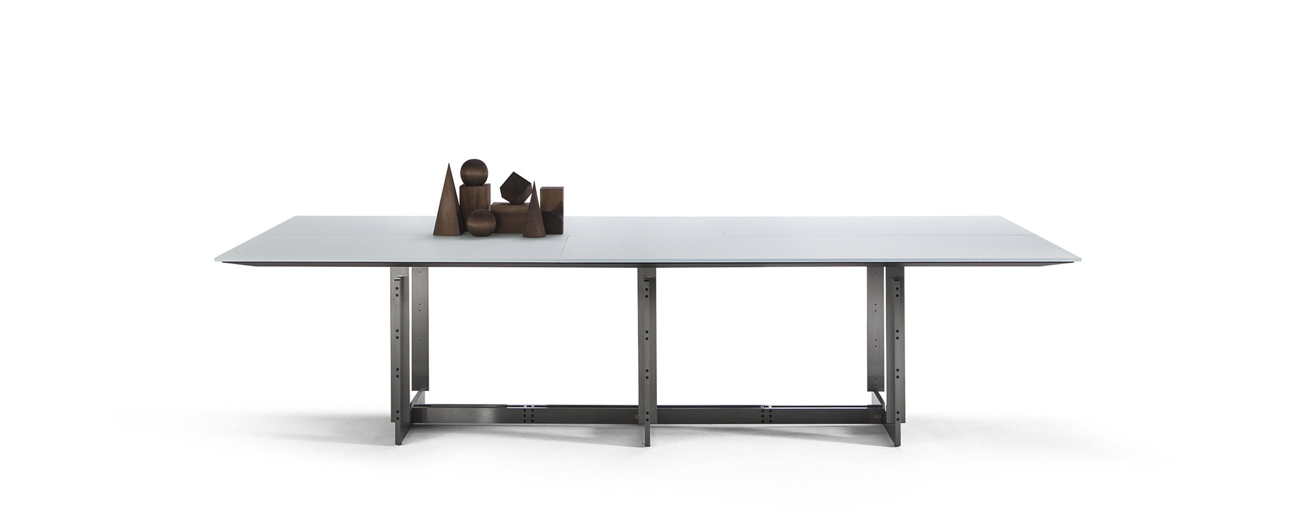 Collezione composta da tavoli rettangolari di diverse dimensioni, concepita per gli ambienti domestici e di lavoro. I tavoli sono caratterizzati da struttura in metallo trafilato satinato, protetta con vernice trasparente, collegata per mezzo di viti brunite a vista, piedini in materiale plastico di colore nero; i piani sono disponibili in due essenze, frassino tinto nero o noce canaletto, oppure in vetro retrolaccato verniciato nel colore bianco. I piani dei tavoli per ufficio, in entrambe le versioni, sono proposti con antina passacavi dotata di vaschetta contenitiva posta sotto il piano.
