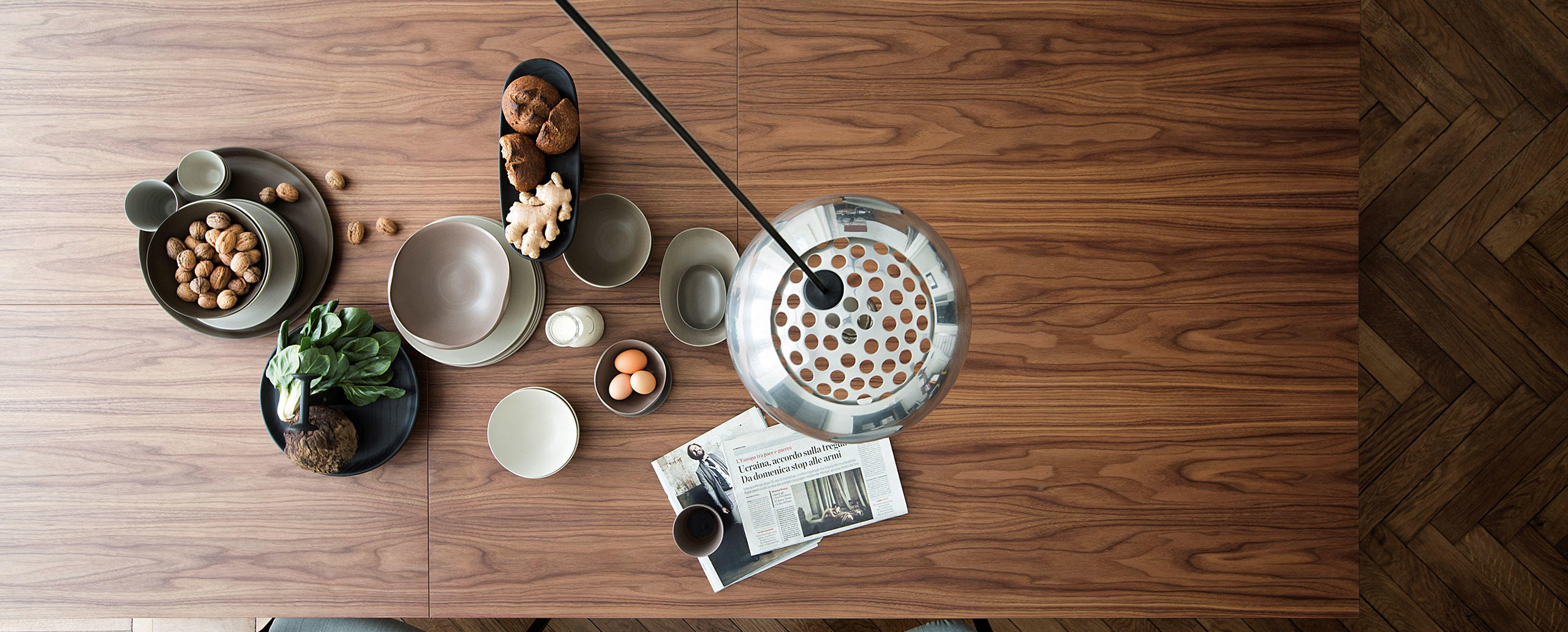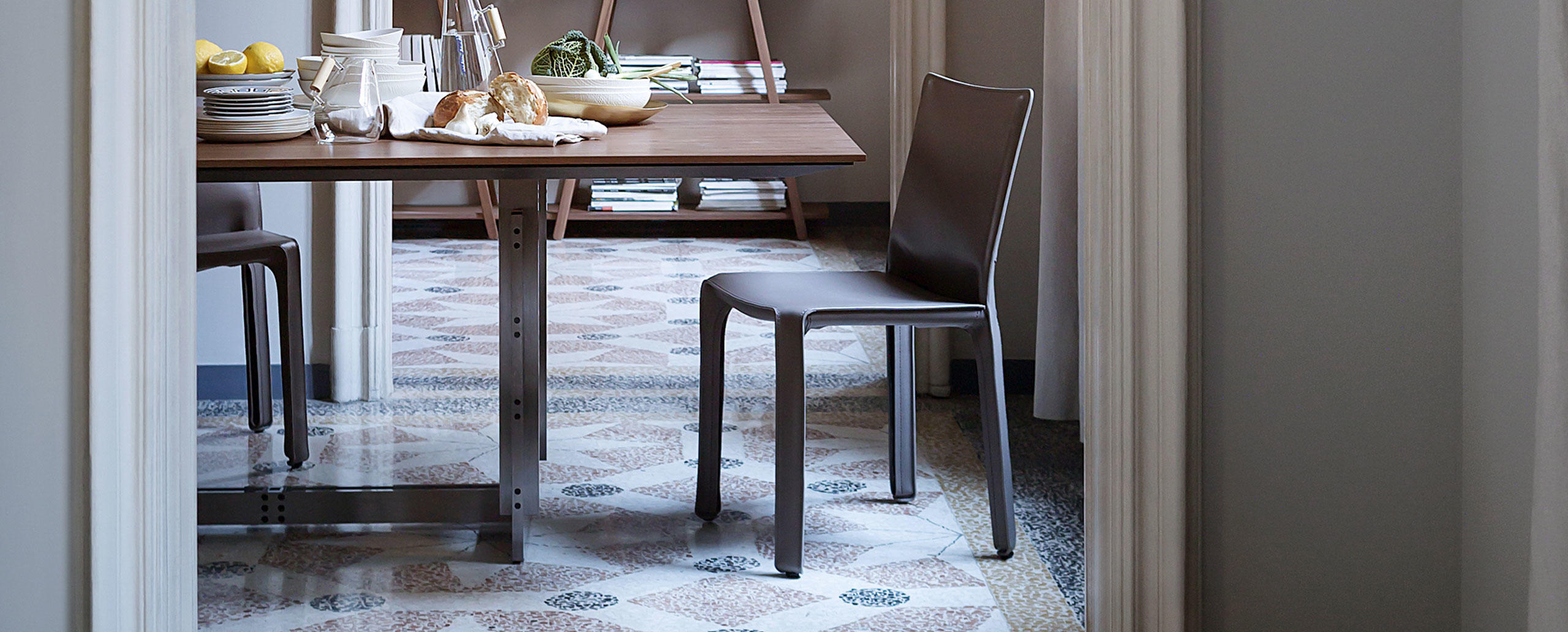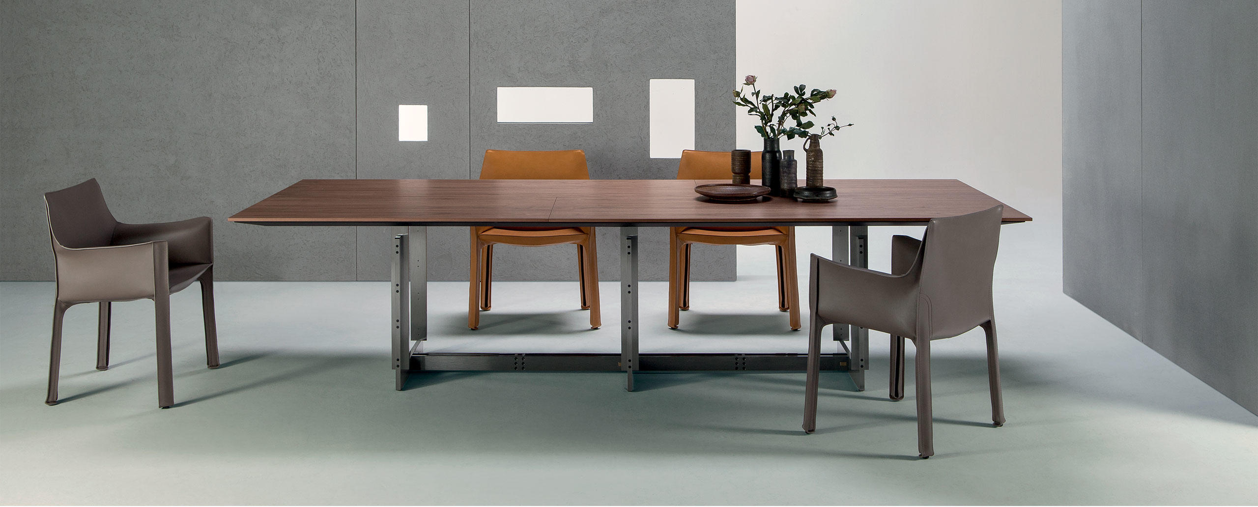 Collezione composta da tavoli rettangolari di diverse dimensioni, concepita per gli ambienti domestici e di lavoro. I tavoli sono caratterizzati da struttura in metallo trafilato satinato, protetta con vernice trasparente, collegata per mezzo di viti brunite a vista, piedini in materiale plastico di colore nero; i piani sono disponibili in due essenze, frassino tinto nero o noce canaletto, oppure in vetro retrolaccato verniciato nel colore bianco. I piani dei tavoli per ufficio, in entrambe le versioni, sono proposti con antina passacavi dotata di vaschetta contenitiva posta sotto il piano.