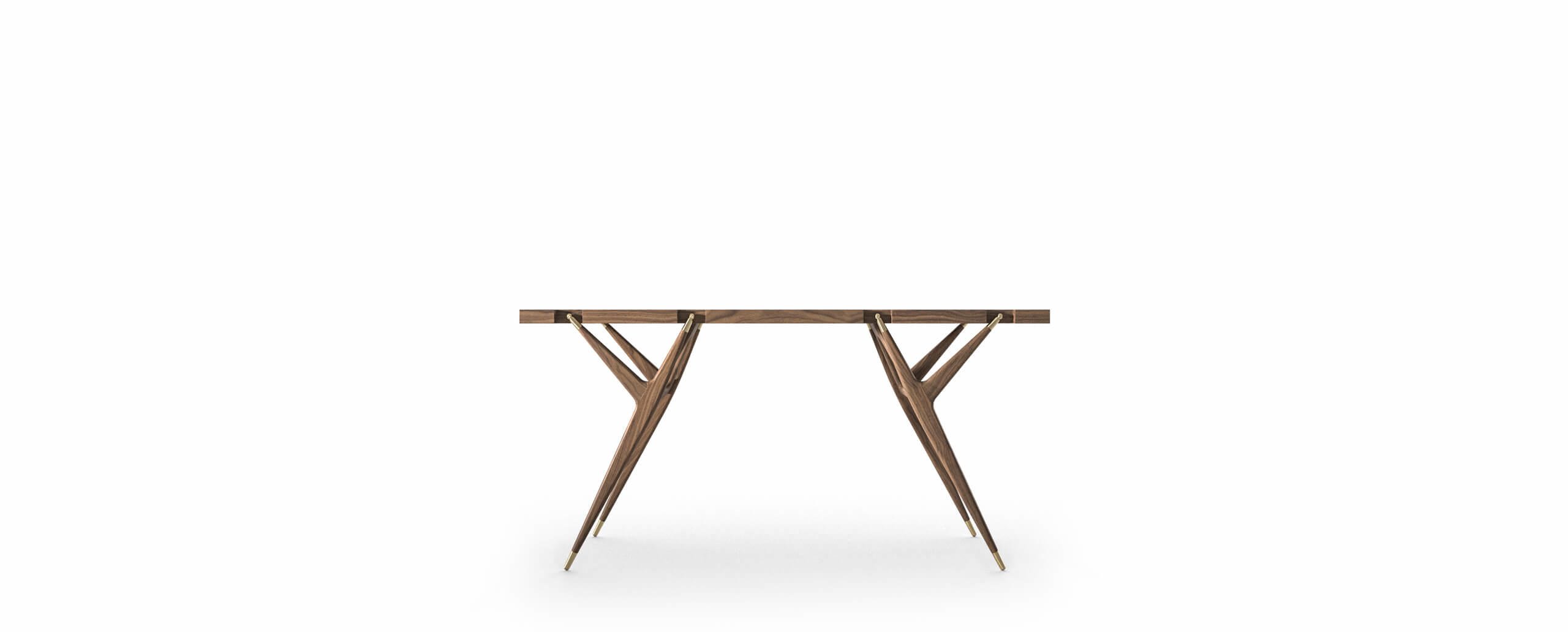 L’idea di questa consolle, disegnata da Ico Parisi nel 1947 per una committenza privata, nasce da poche linee tracciate di getto su un foglio: una retta orizzontale e due oblique a definire una strut-tura dalle proporzioni pressoché perfette e dall’aspetto organico. Cassina ha saputo rispettare e valorizzare il cuore di questo progetto unendo la tecnologia all’artigianalità, tipiche della fale-gnameria dell’azienda; il risultato è una raffinata consolle in legno massello impreziosita da det-tagli metallici che si adatta a tutti gli ambienti di casa. Il piano rettangolare presenta sui due lati maggiori, in prossimità degli estremi, quattro scassi a intaglio retto, entro i quali, come vere e proprie articolazioni, sono avvitati i puntali dei bracci superiori delle gambe dalla caratteristica forma a “Y” divergente, disponibili in Frassino o Noce Canaletto e vincolate a due a due mediante una traversa sagomata. L’equilibrio e la solidità sono garantiti da due elementi obliqui in legno massello tornito, uniti in diagonale alla traversina e incastrati nel sottopiano.