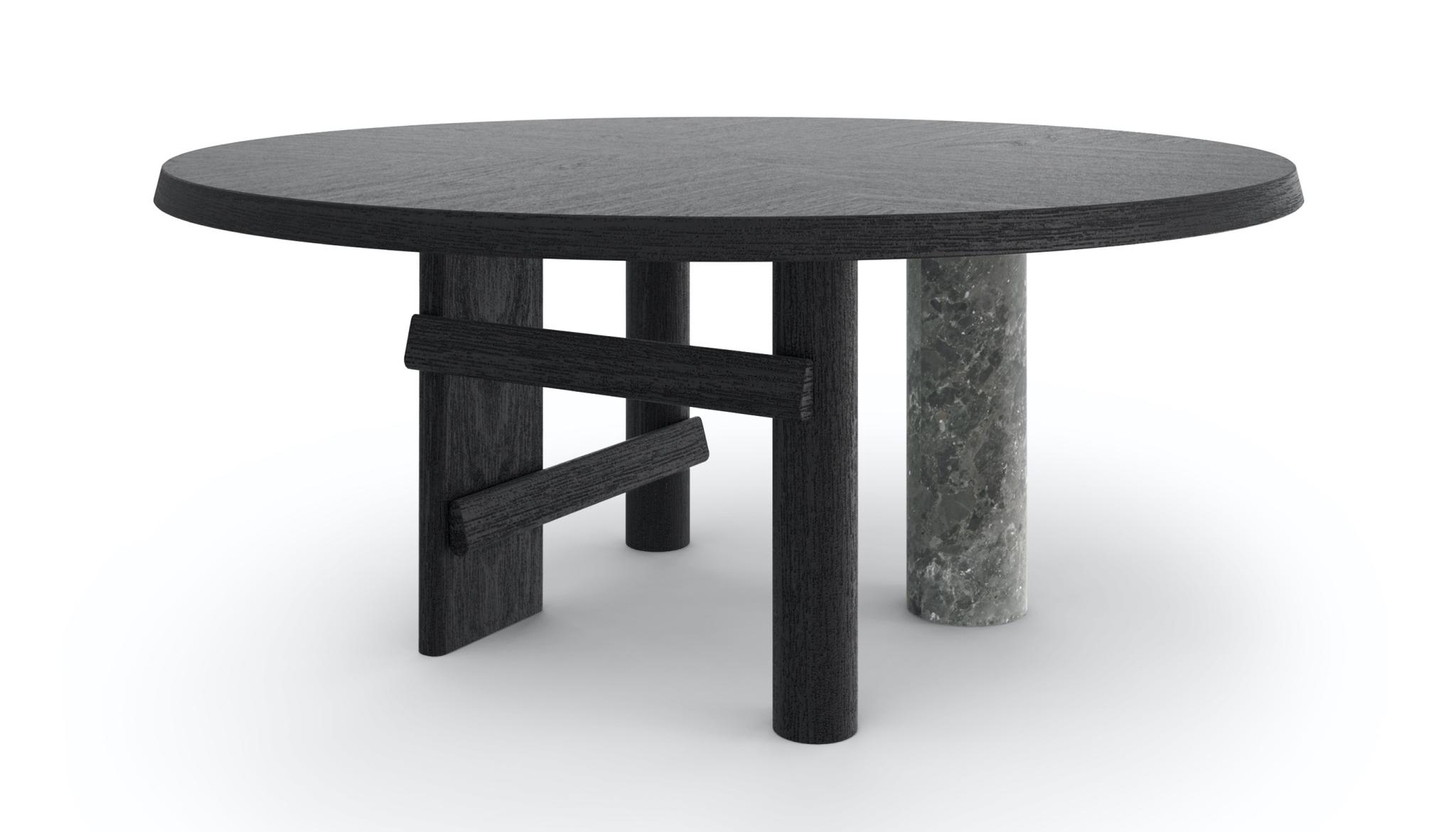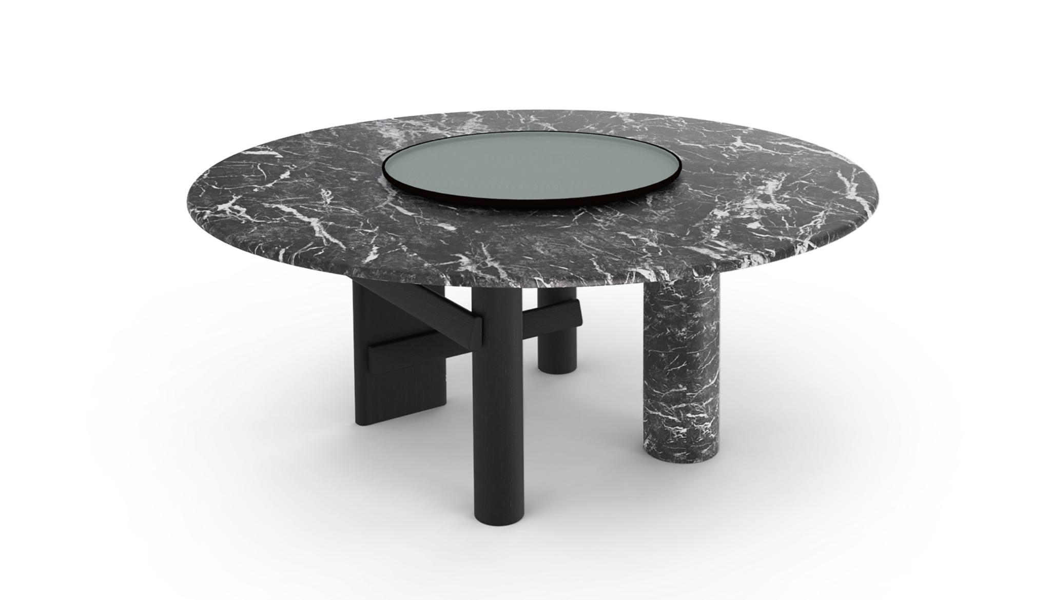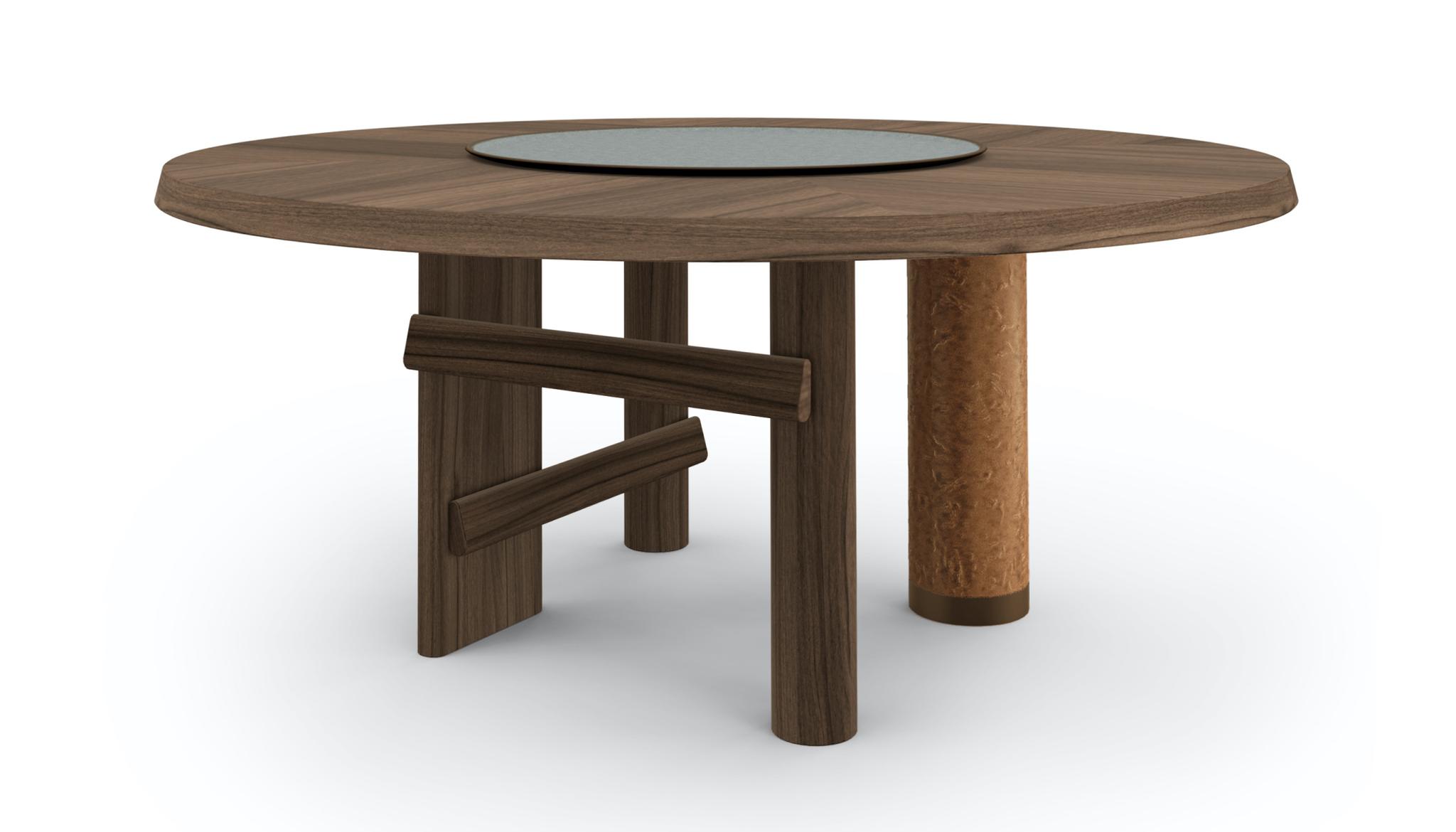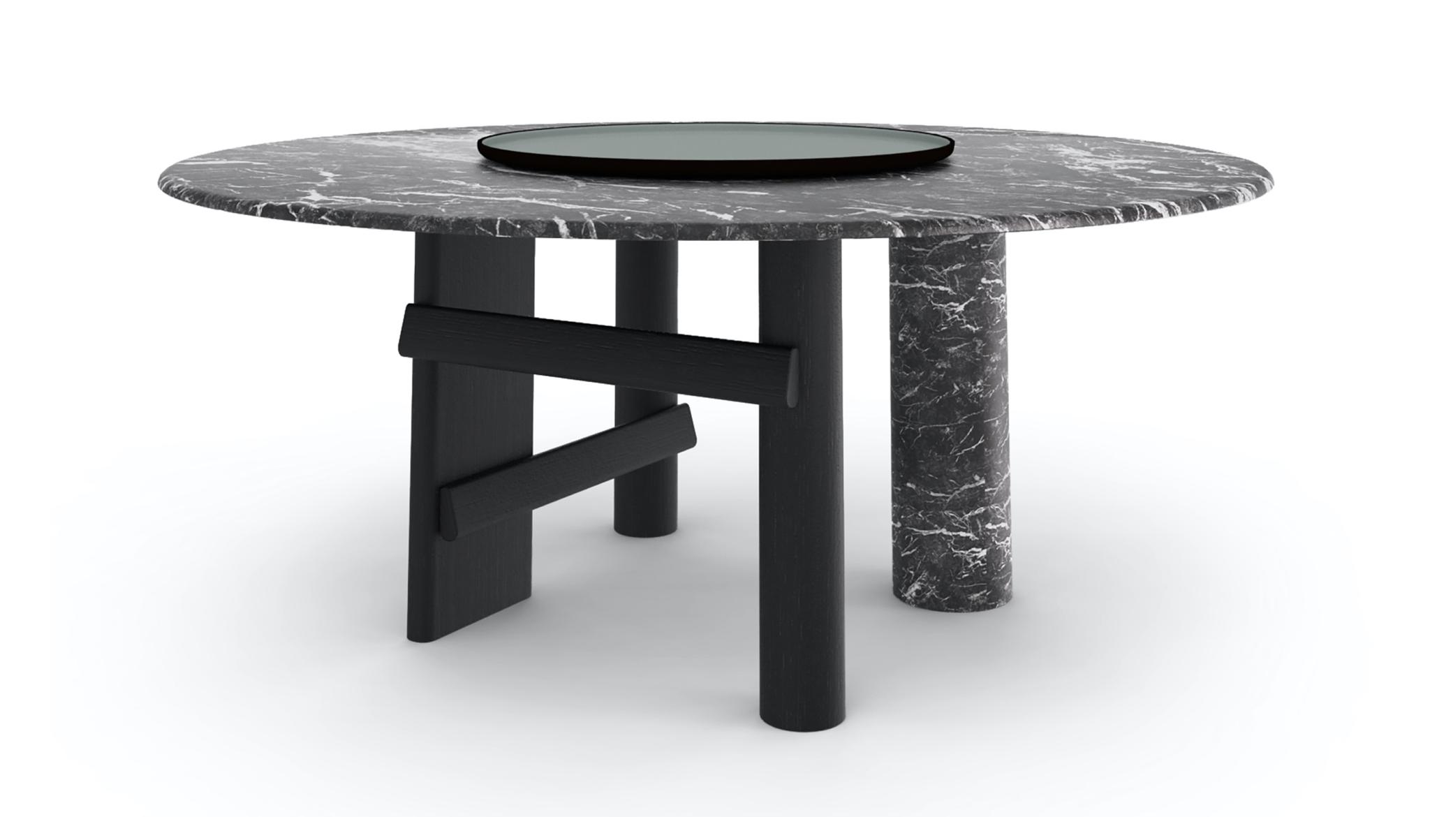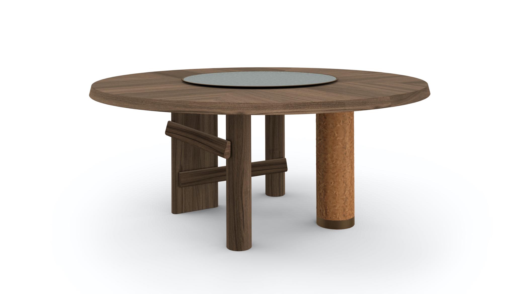 A design dining room table inspired by the ritual reconstruction of Japanese shrines, a contemporary piece that celebrates light-hearted cheer through dialog between different materials.