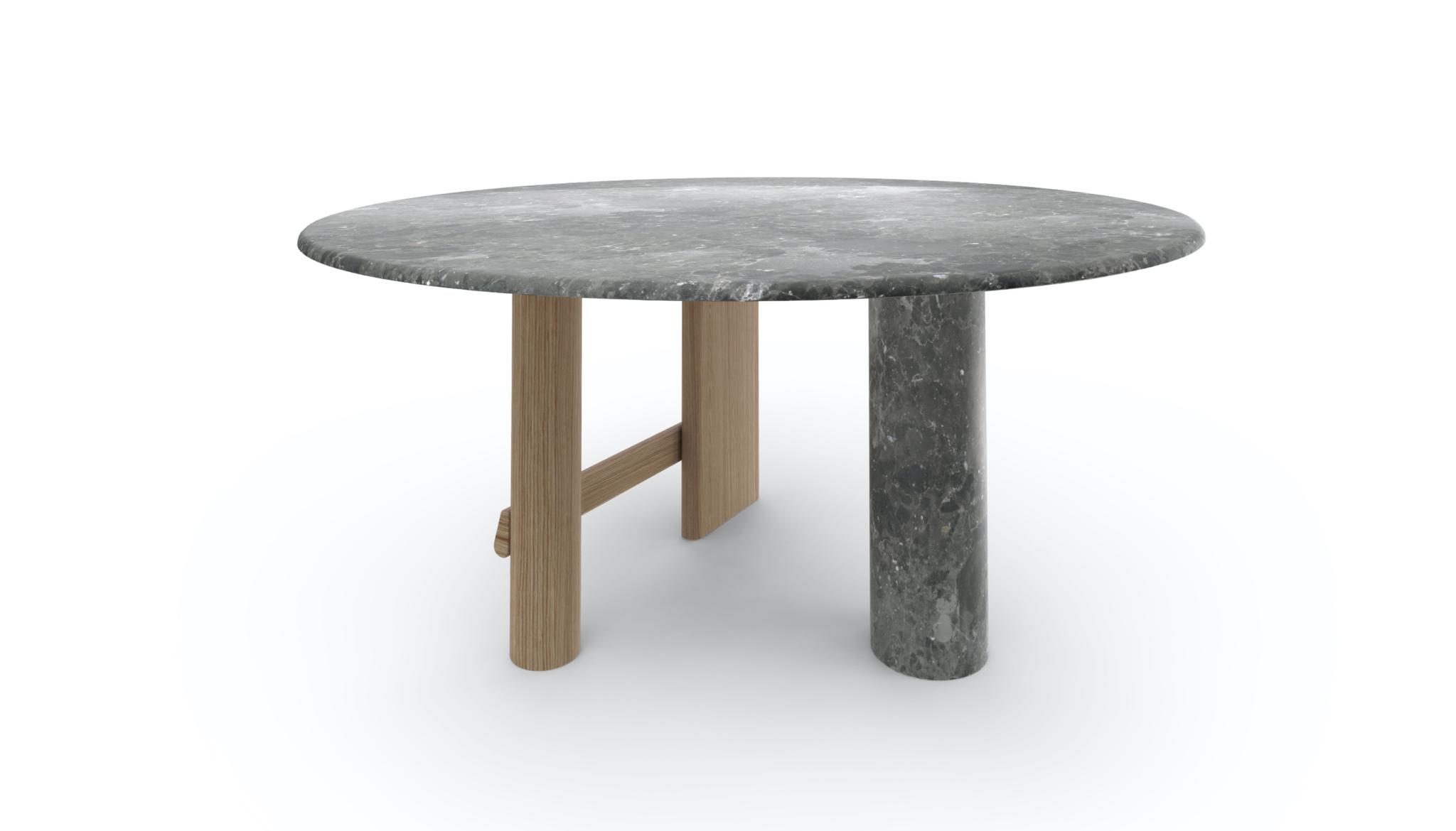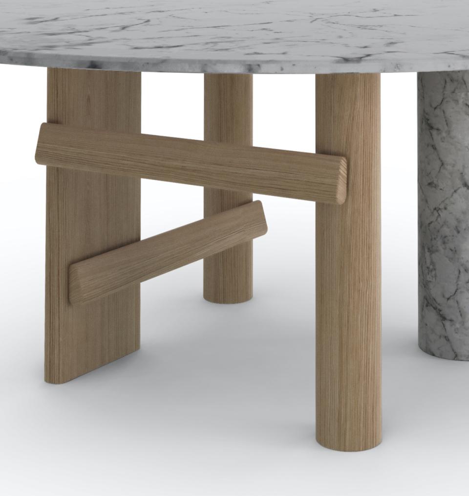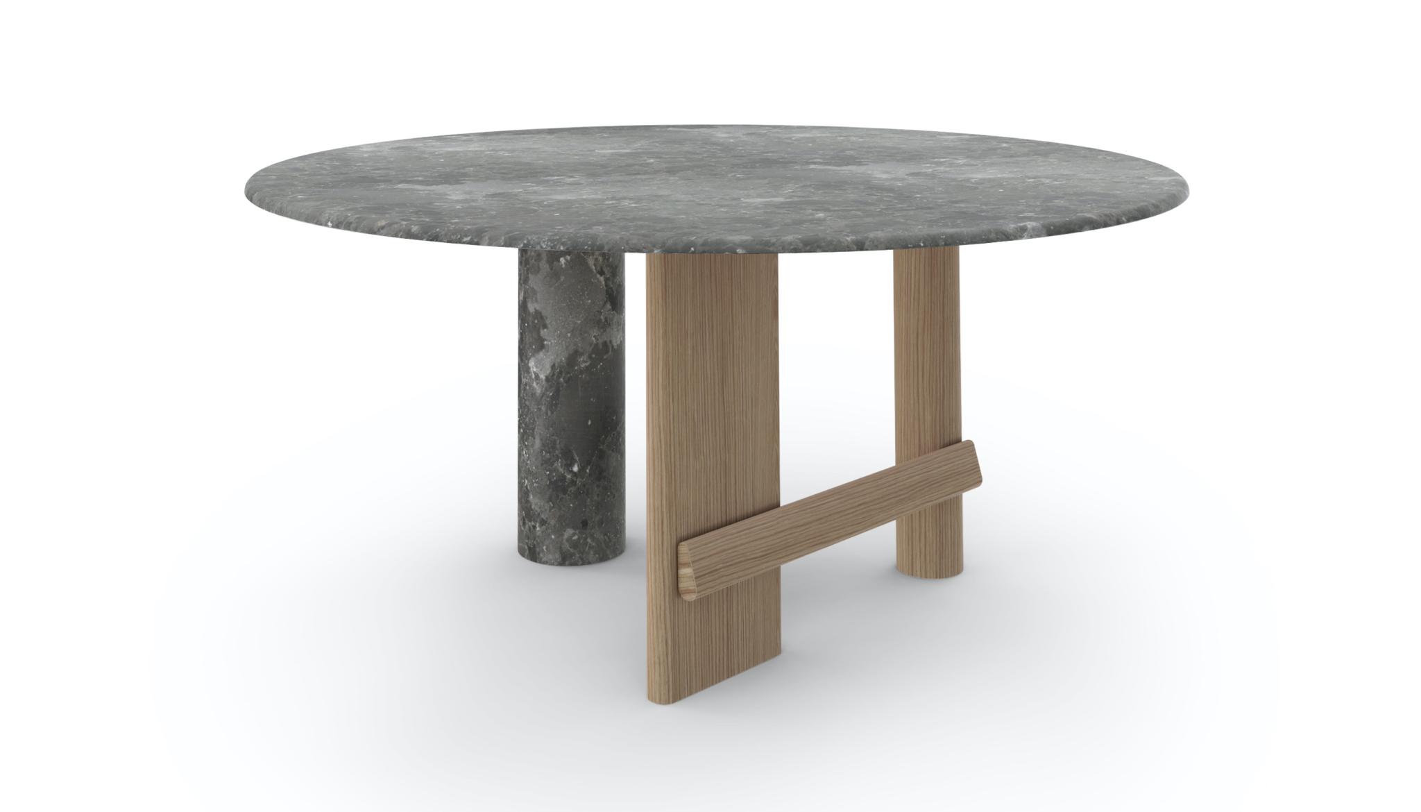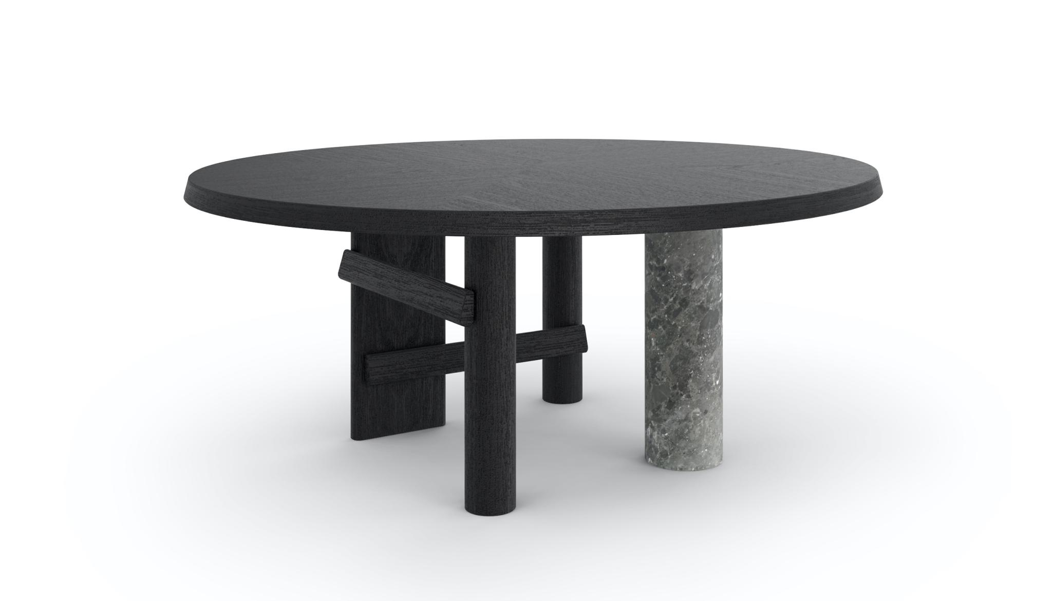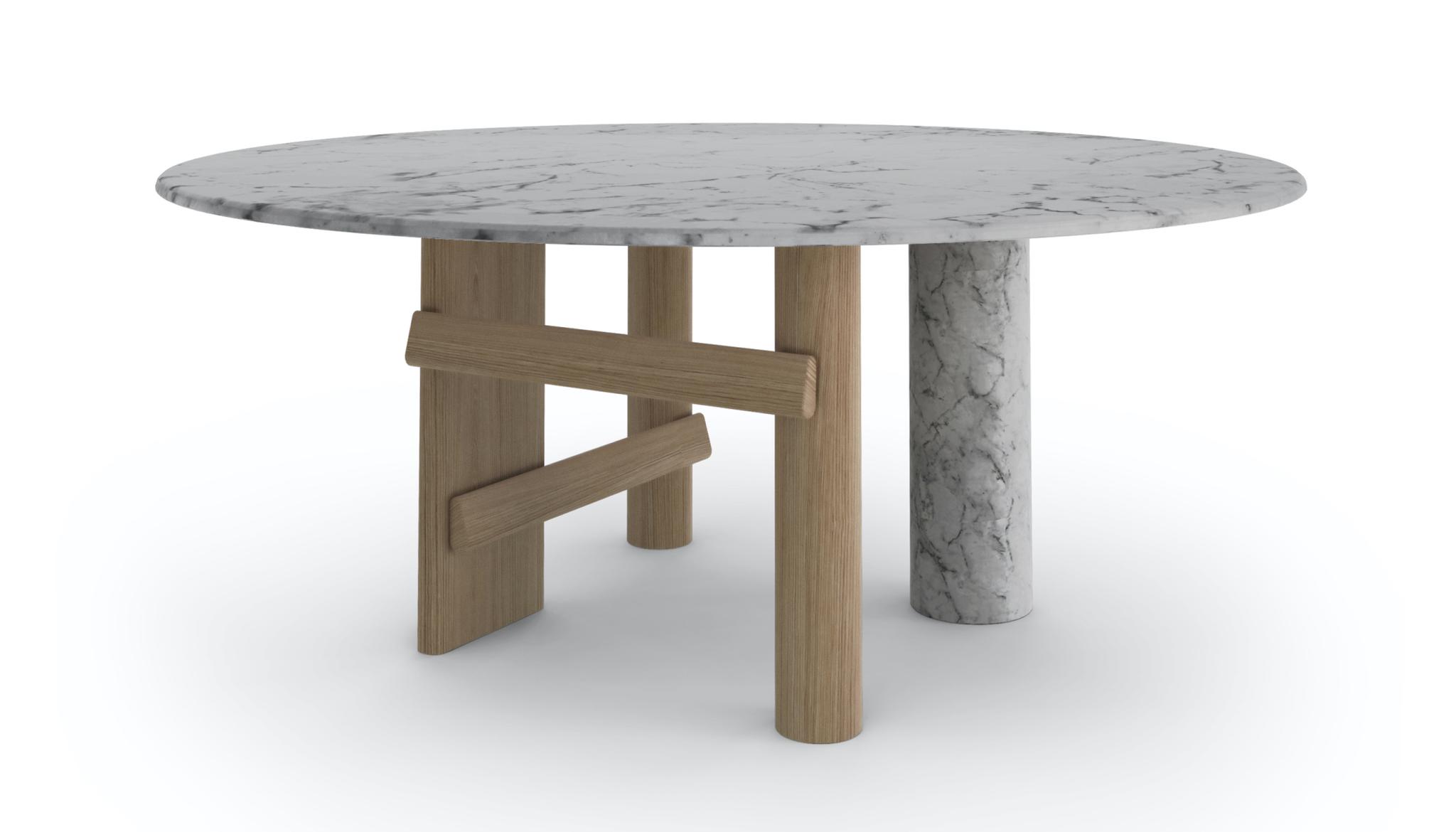 A design dining room table inspired by the ritual reconstruction of Japanese shrines, a contemporary piece that celebrates light-hearted cheer through dialog between different materials.