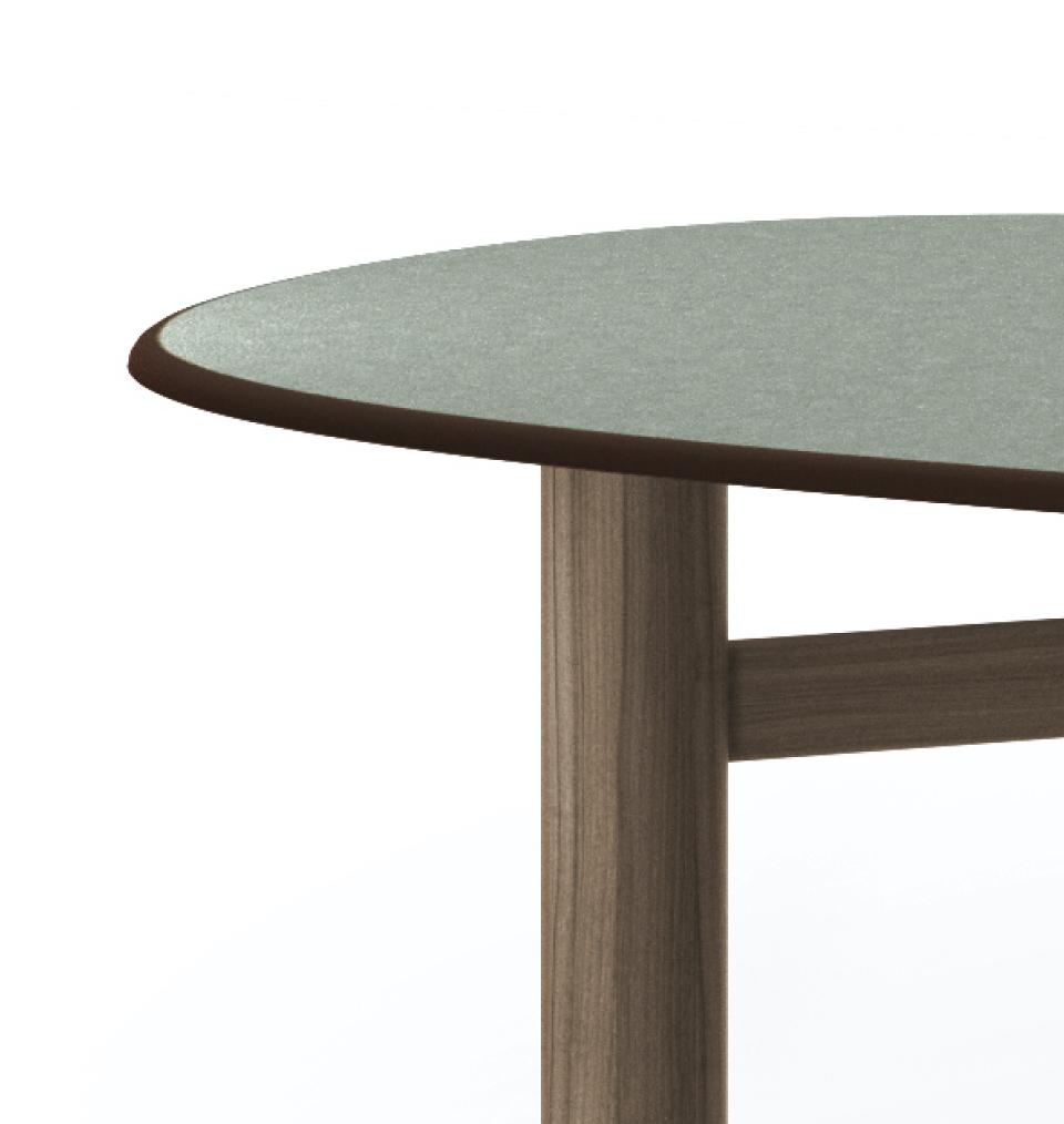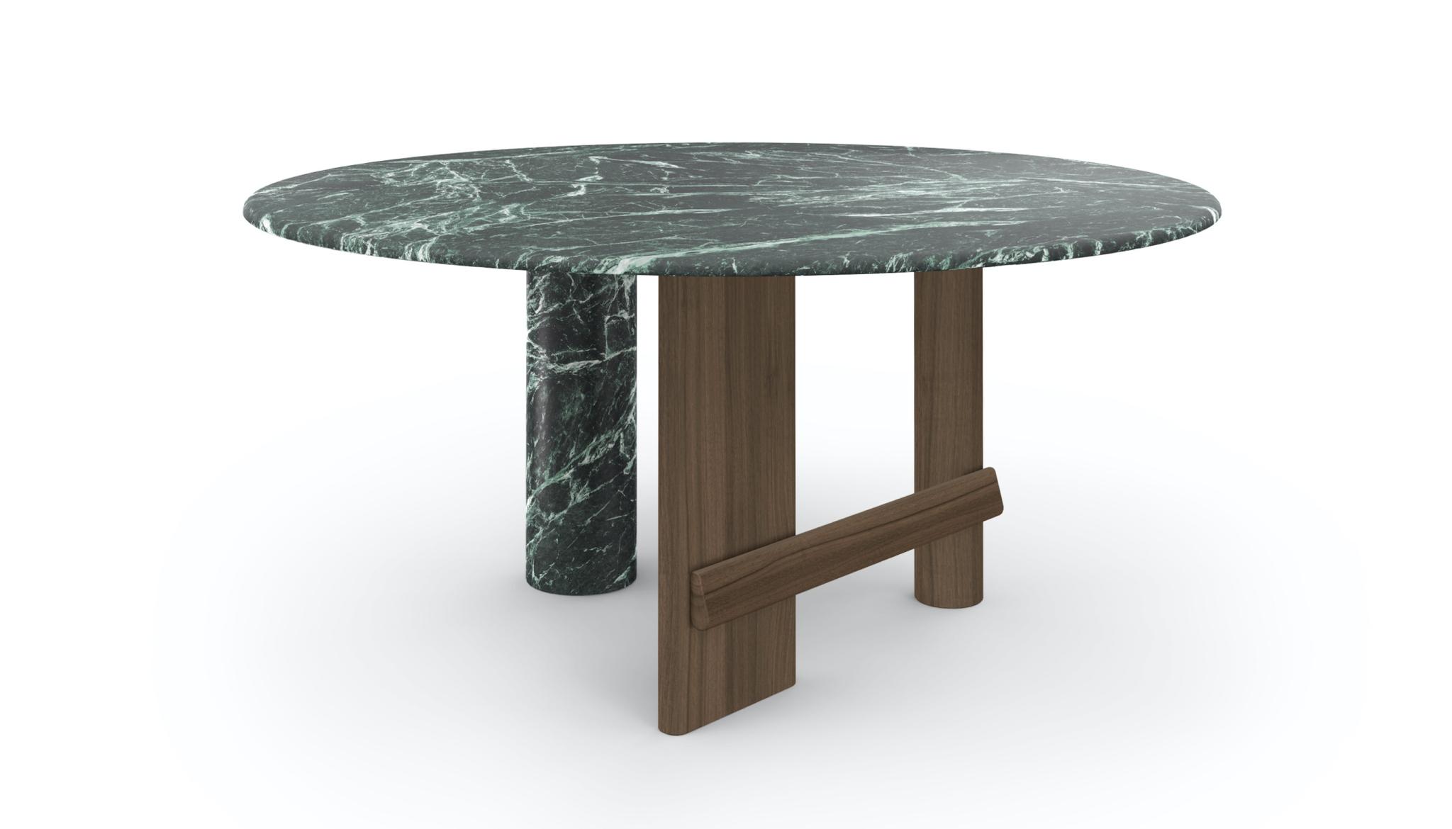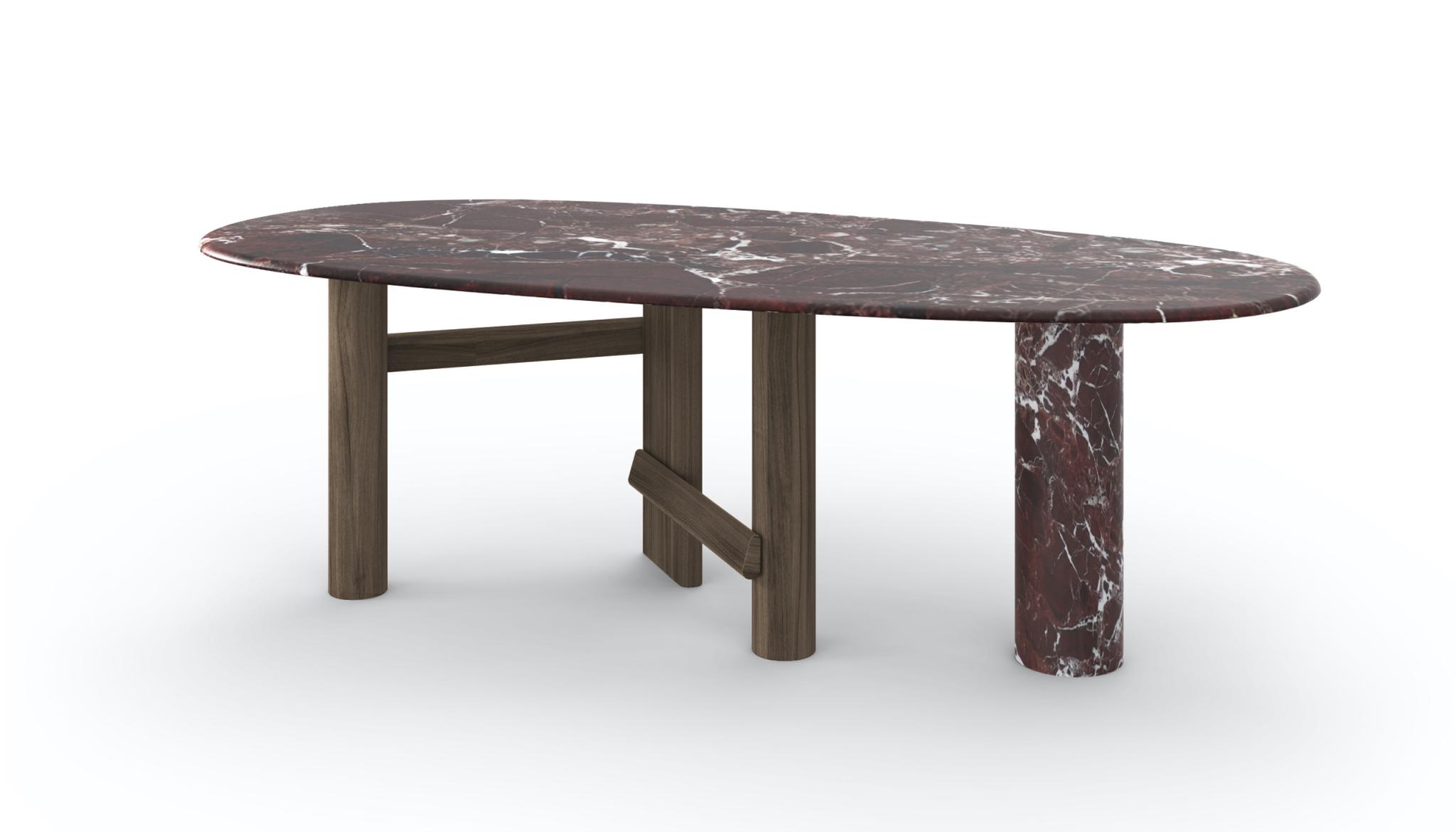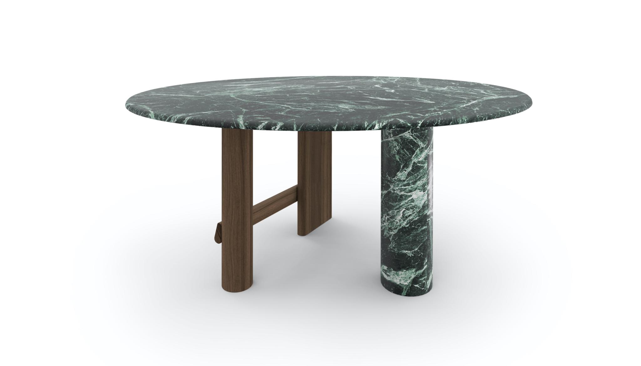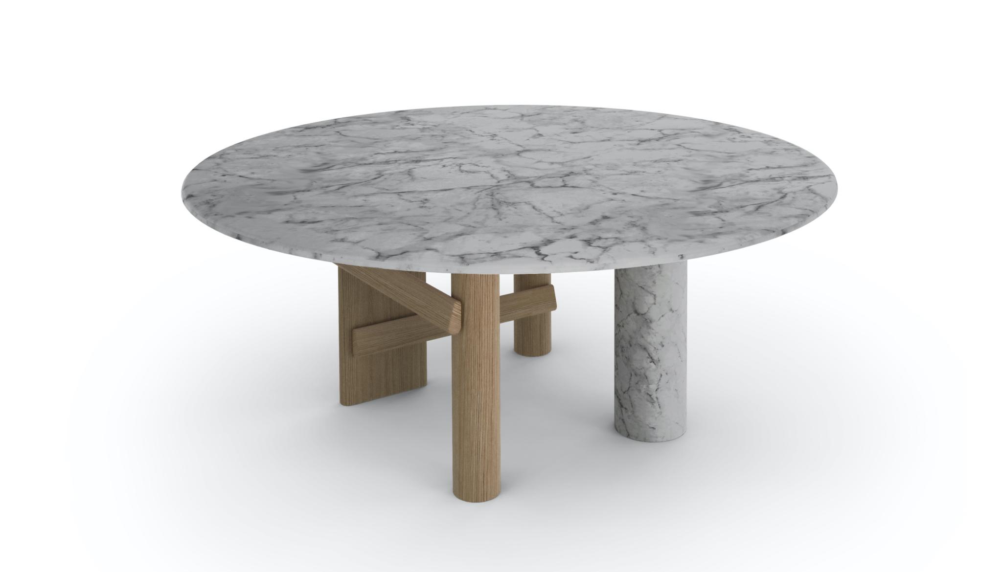 A design dining room table inspired by the ritual reconstruction of Japanese shrines, a contemporary piece that celebrates light-hearted cheer through dialog between different materials.