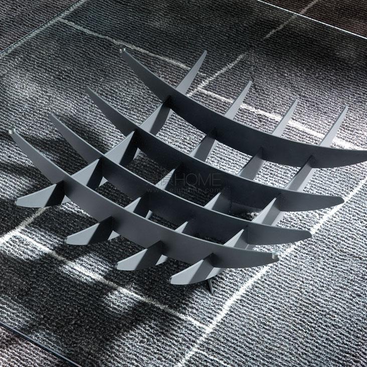 Coffee table with graphite (OP69), white (OP71) or black (OP17) varnished steel base. Top in clear glass.