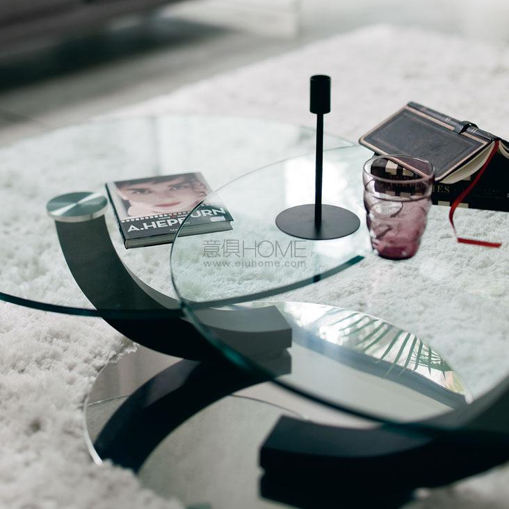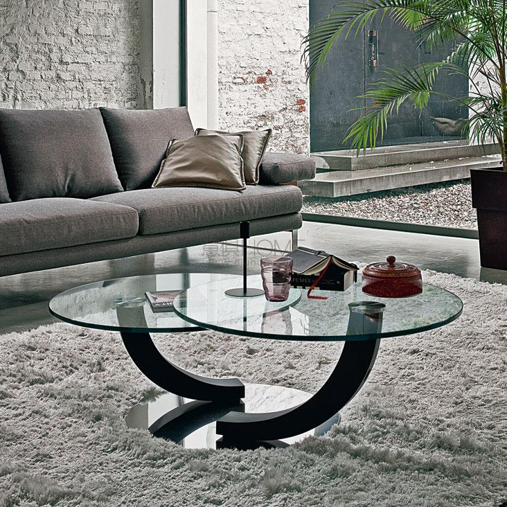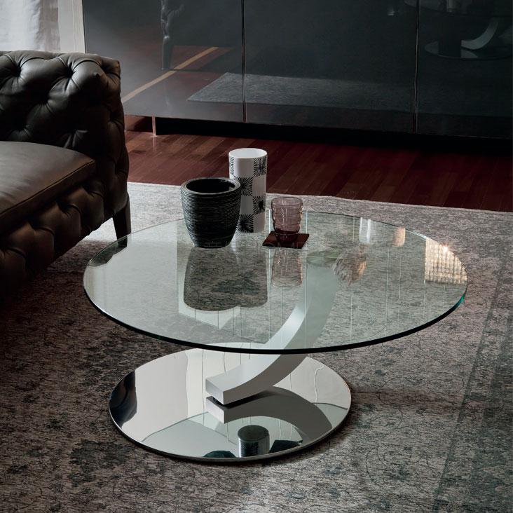 Coffee table with base in polished stainless steel. One or two swiveling clear glass tops. Canaletto walnut (FNC), wenghè (FW), white (OP7) or black (OP17) feet.