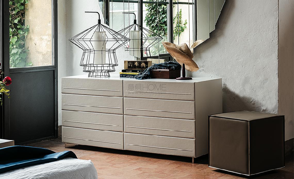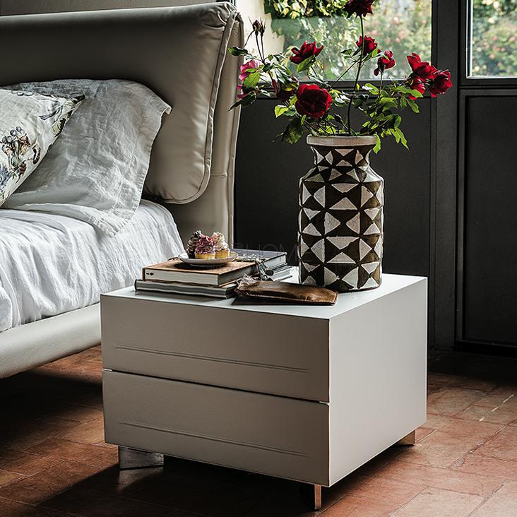 Two drawers nightstand, 4/8 drawers double dresser or seven-drawers high chest with frame in Canaletto walnut (NC), burned oak (RB) or white (OP7) lacquered wood. Polished stainless steel feet. Drawer fronts covered in synthetic leather, or soft leather as per sample card. Desk in matt white lacquered wood (OP7) with lateral support in matt white lacquered steel (OP71). To be laid on the top of Dyno 4 or 8 drawers.