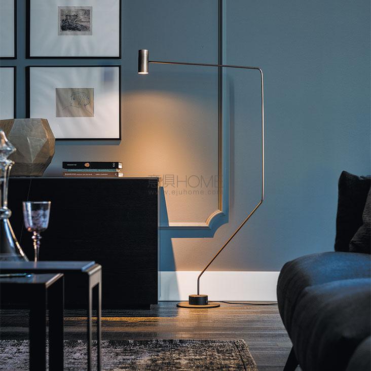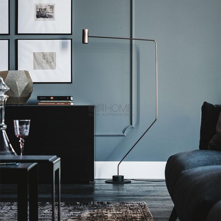 Floor lamp with frame in satin bronze steel (15) and matt black (OP17) painted steel base. Bulb not included.