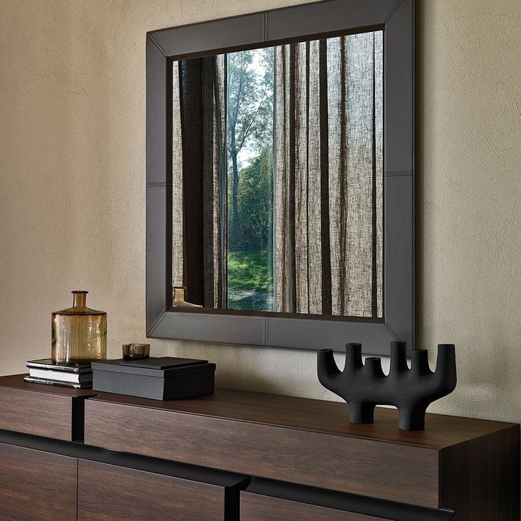Mirror with frame covered in leather as per sample card. Mirror is equipped with plates for both horizontal and vertical installation.