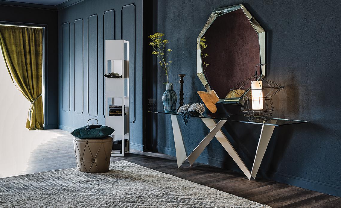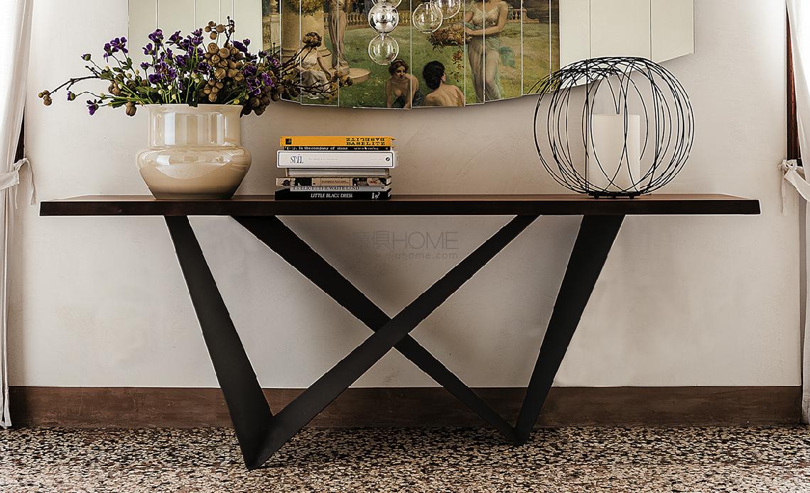 Console with base in titanium (GFM11), bronze (GFM18), graphite (GFM69), white (GFM71), black (GFM73) or mix (GFM69-GFM71) embossed lacquered steel, Brushed Bronze or Brushed Grey steel. 12mm top in clear, extra clear glass or Canaletto walnut (NC), burned oak (RB) or natural oak (RN) with solid wood irregular edges. Wall anchorage is necessary.