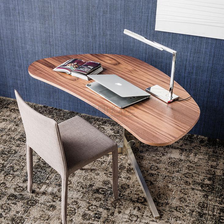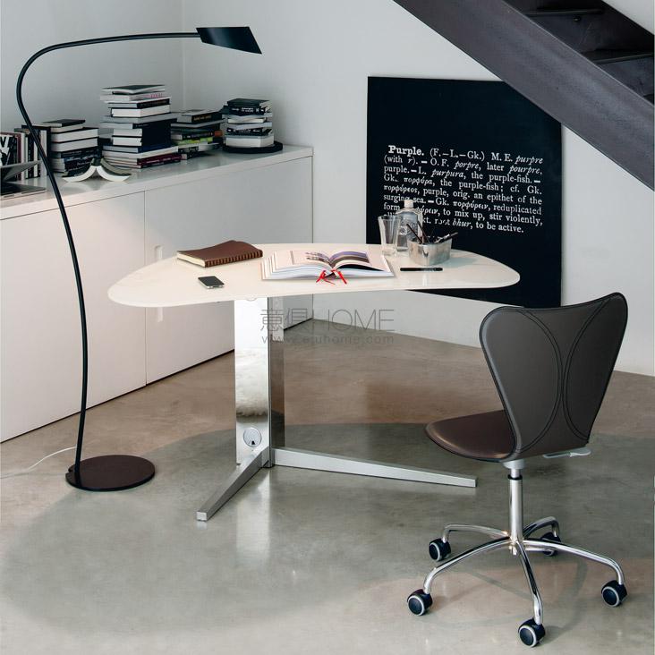 Desk with stainless steel base. Top in extra clear white painted glass (12mm tempered) or Canaletto walnut (NC).