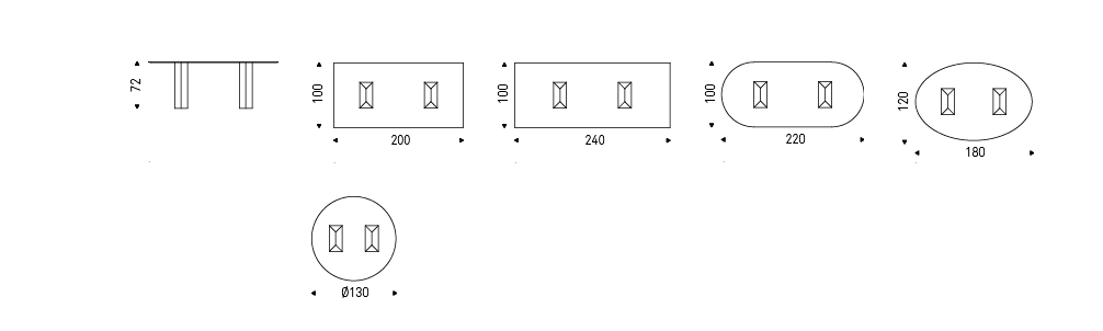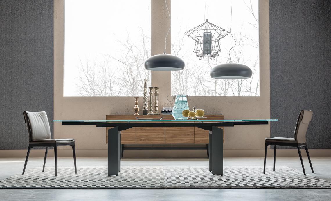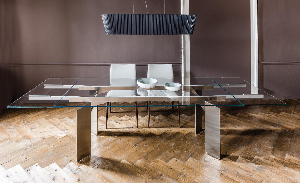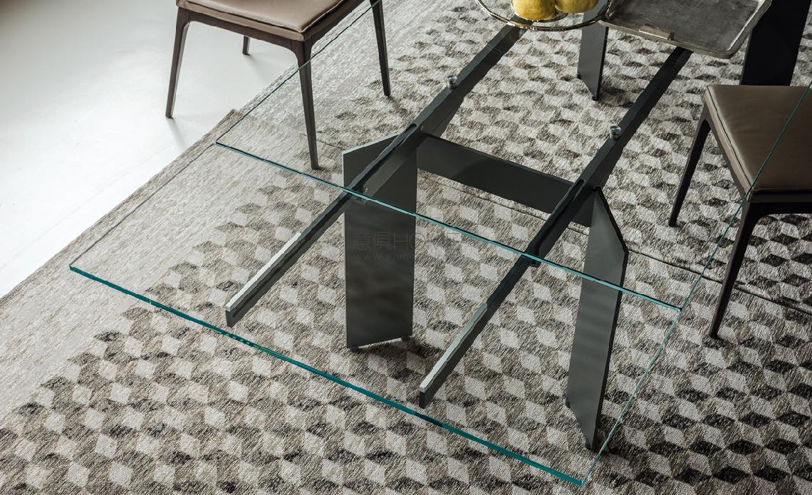 Extendible table with legs in graphite (GFM69), white (GFM71) or black (GFM73) embossed lacquered steel. White (GFM71), graphite (GFM69) or black (GFM73) embossed lacquered aluminum rails. 12mm clear or extra clear glass top and extensions. The top is laid on the base.