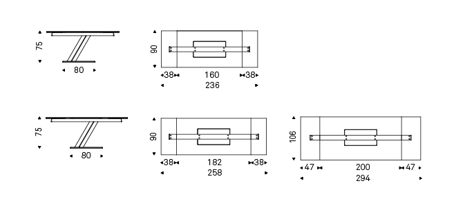 Extendible table with base and rail in graphite (GFM69) or black (GFM73) embossed lacquered steel. Top and extensions in 12mm clear, extra clear or smoked tempered glass.