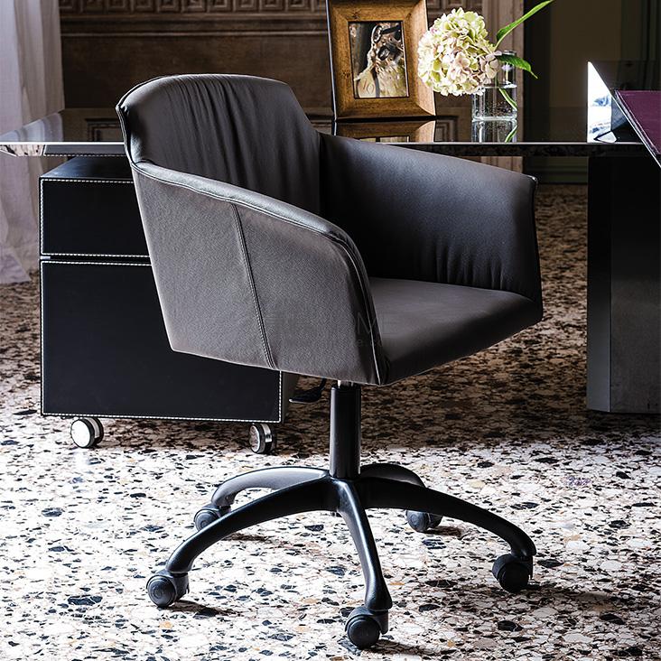 Swiveling chair with or without arms, adjustable in height and with castors. Base with 5 spokes in polished aluminium, column and gas piston in chromed steel (08) or with base and column in matt black aluminium and gas piston in chromed steel (08). Seat and back upholstered in fabric, synthetic nubuck, micro nubuck, synthetic leather or soft leather as per sample card.