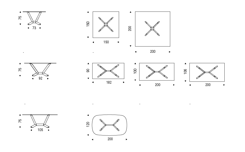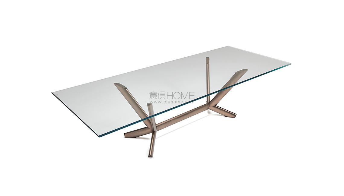 Table with base in titanium (GFM11), bronze (GFM18), graphite (GFM69) or black (GFM73) embossed lacquered steel, Brushed Bronze or Brushed Grey. 15mm top in clear, extra clear or extra clear glass with reversed bevelled edges. Glass top 12mm on 182x90 and 200x106 versions. The top is laid on the base.