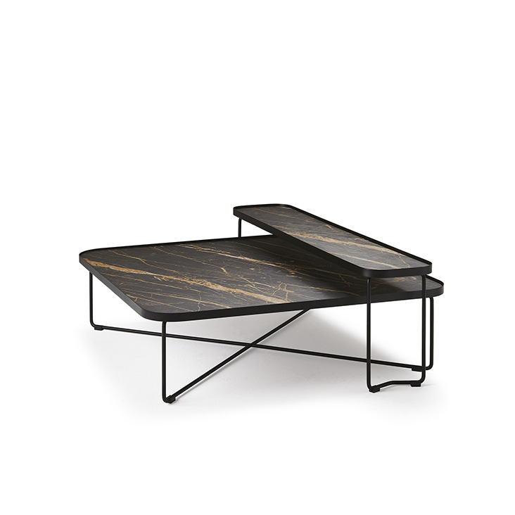 Coffee table with frame in embossed titanium (GFM11) or black (GFM73) lacquered steel, or with base in Bronze and Brushed Bronze top frame. Marmi Calacatta (KM01), Alabastro (KM02), Ardesia (KM04), matt Golden Calacatta (KM05), glossy Golden Calacatta (KM06), matt Portoro (KM07), glossy Portoro (KM08), glossy Sahara Noir (KM09), Emperador (KM10), Makalu (KM11), Breccia (KM12), Arenal (KM13) or Zefiro (KZ20) ceramic top.
