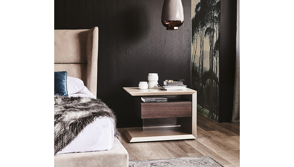 Reversible nightstand with titanium (GF11), graphite (GF69) or white (GF71) embossed lacquered frame. Drawer unit in Canaletto walnut (NC) or burned oak (RB).