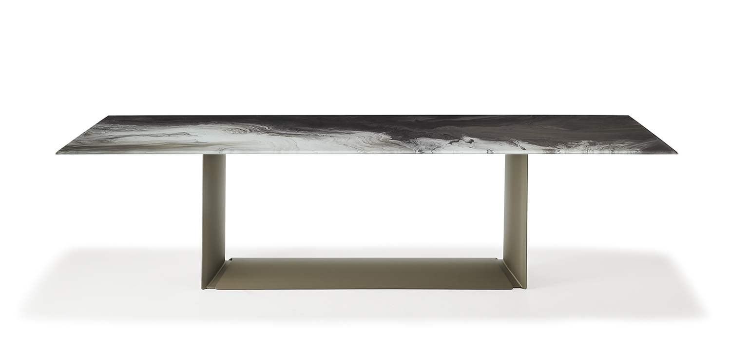 Table with titanium (GFM11), bronze (GFM18), graphite (GFM69) or black (GFM73) embossed lacquered steel base. Top 12mm thick in extra clear bevelled glass with artistic decorative printing in two different colours (CY01, CY02).