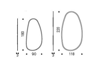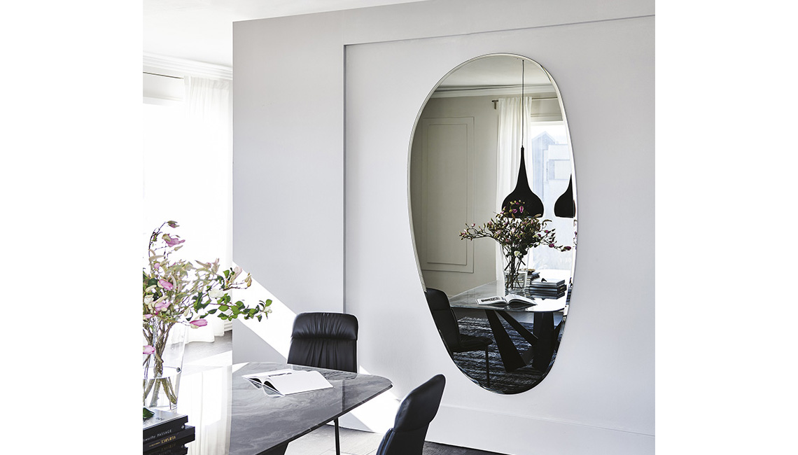 Wall mirror in mirrored, smoked grey or bronze mirrored glass with bevelled edges. Wall bracket with fixing possibilities in different positions.