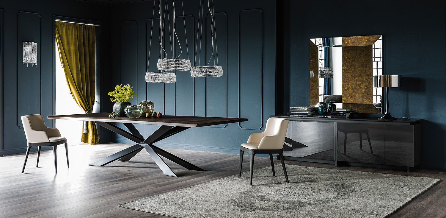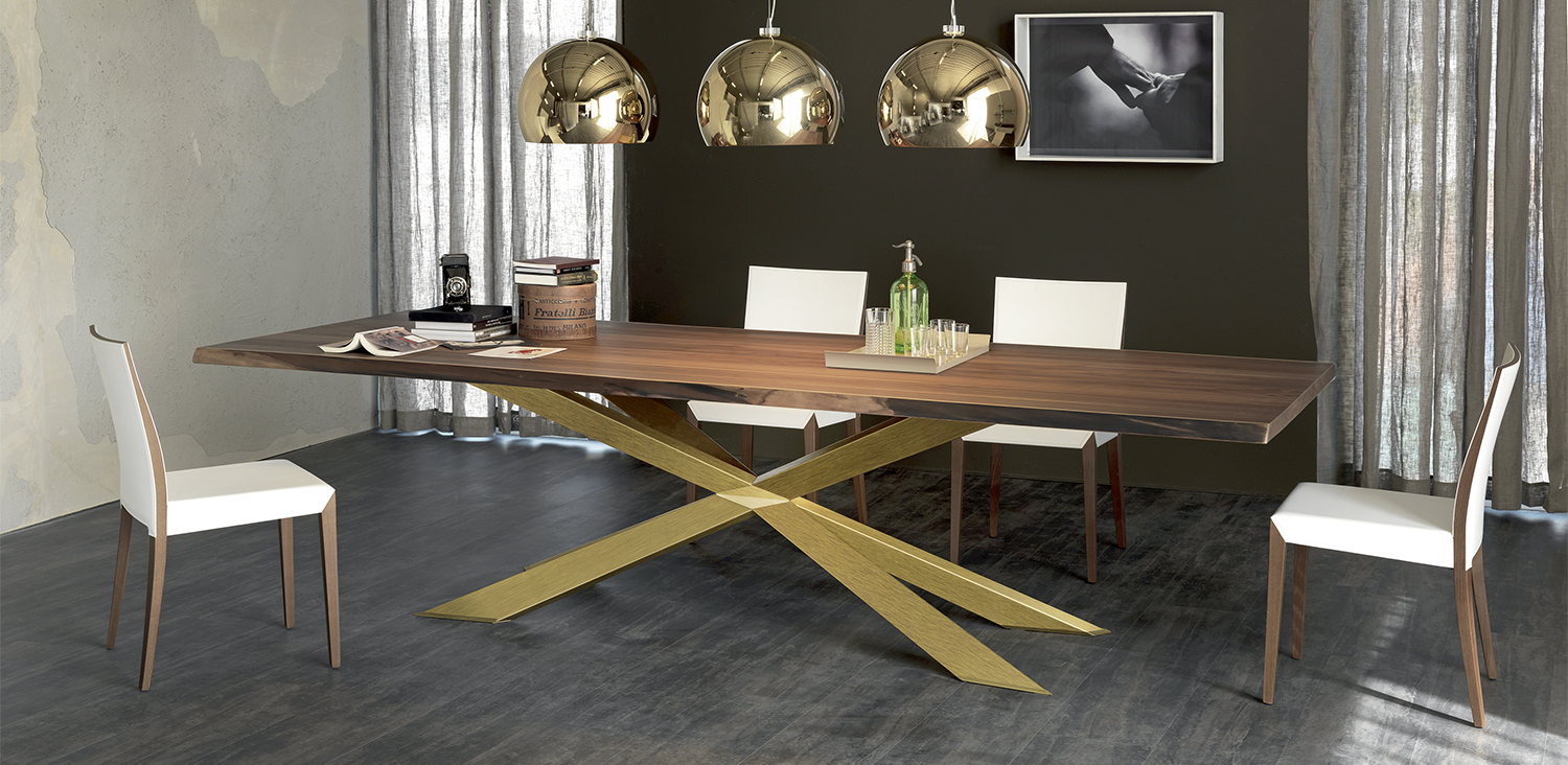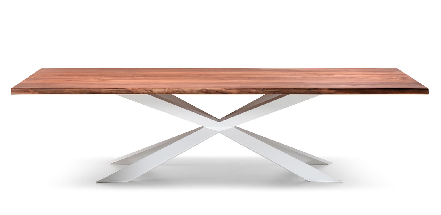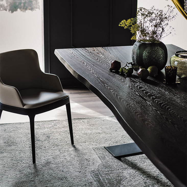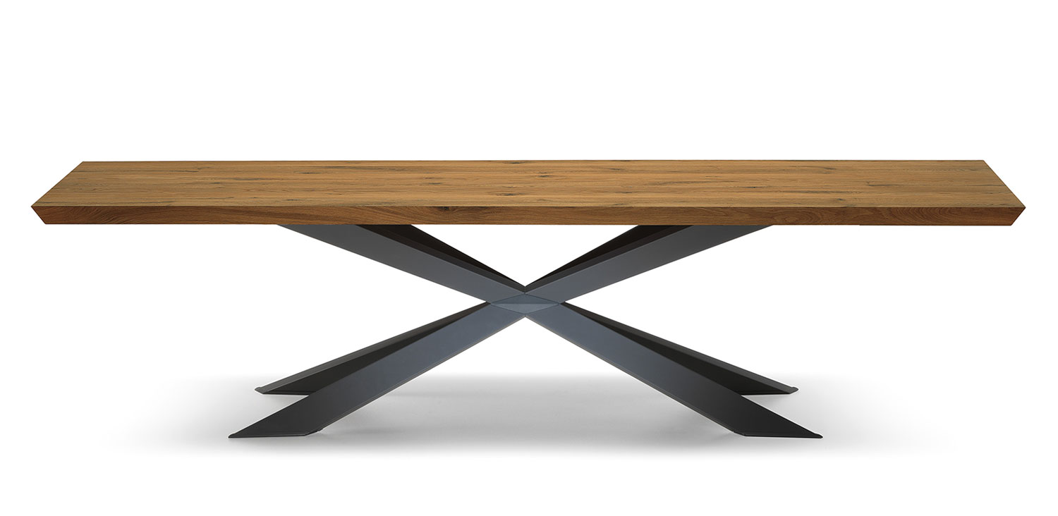 Table with base in matt black (OP17), graphite (OP69) or white (OP71) painted steel, or in weathered brass or polished stainless steel, or in satin bronze (15), satin titanium (11) painted steel, or with wooden base in Canaletto walnut (NC), dark Wenghè (W2) or Heritage oak (HR). Top "S" version 4cm thick with irregular solid wood edges in Canaletto walnut (NC), burned oak (RB) or natural oak (RN). Small reflection irregularities on the stainless steel base or glazes on the satin titanium or satin bronze painted base are due to handmade processing.