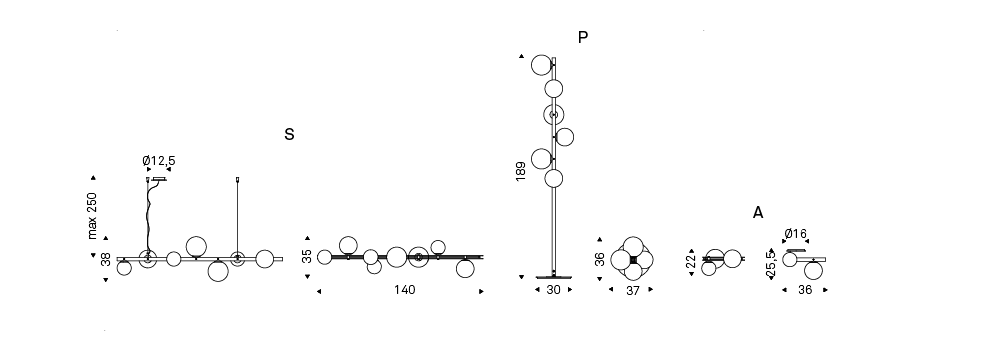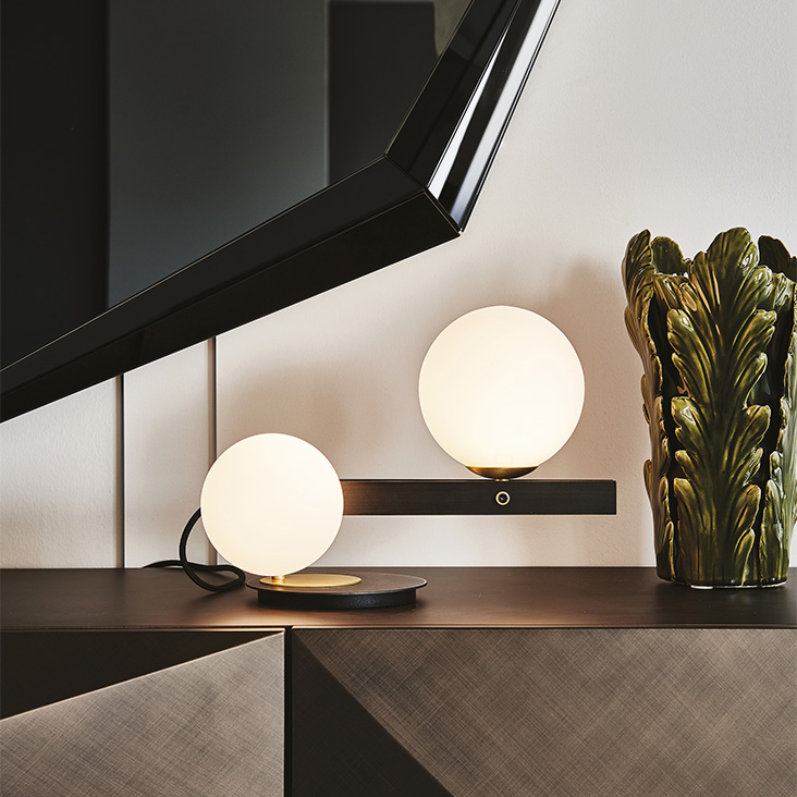 Table lamp, ceiling lamp, wall lamp and floor lamp with frame in burnished steel and details in brushed brass. Lampshades in blown satin white glass. Bulbs included.