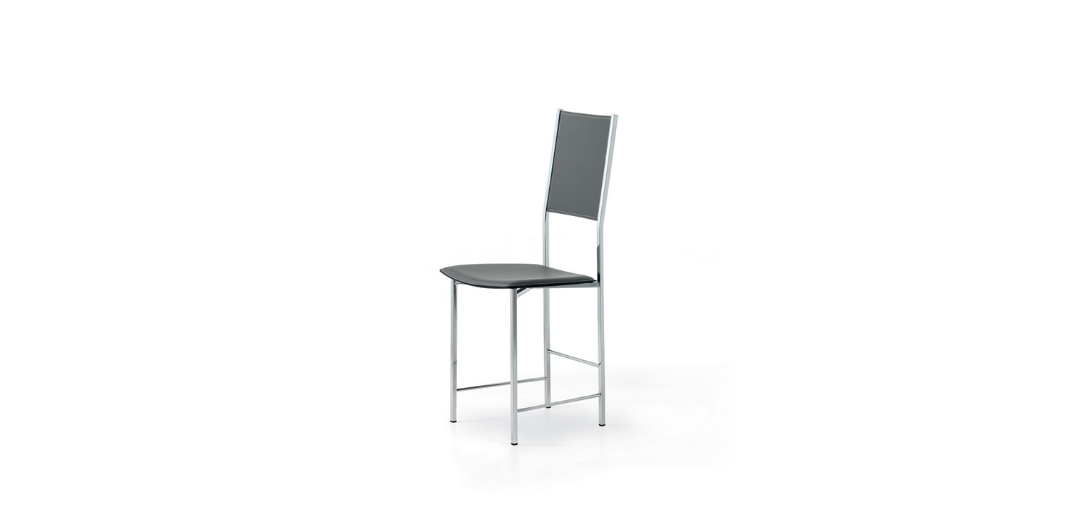 Chair with frame in chromed steel (08) or black chrome (06), black (OP17), white (OP71), graphite (OP69) painted steel. Back and seat in leather as per sample card. Standard stitching.