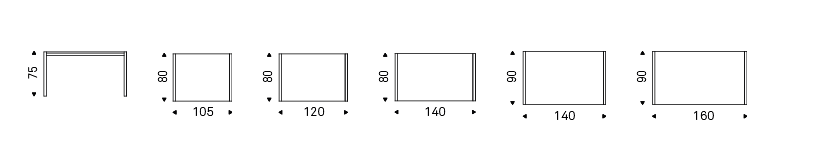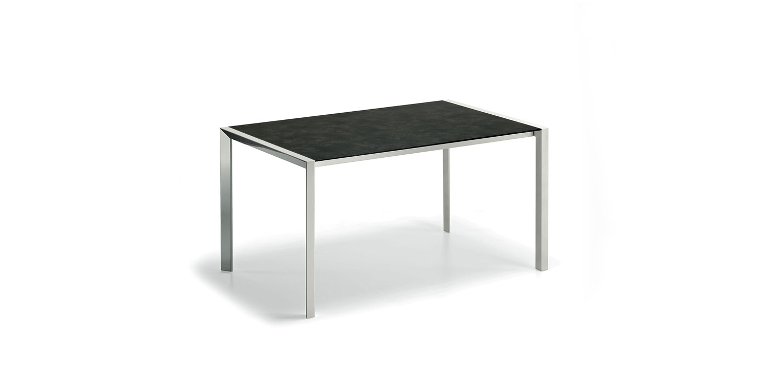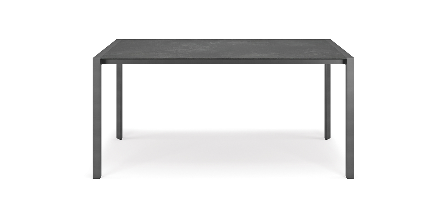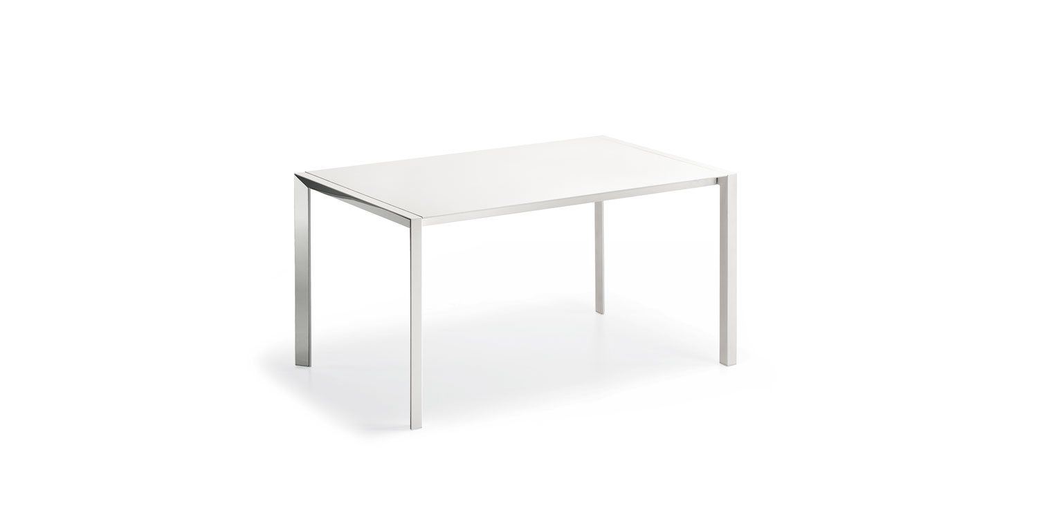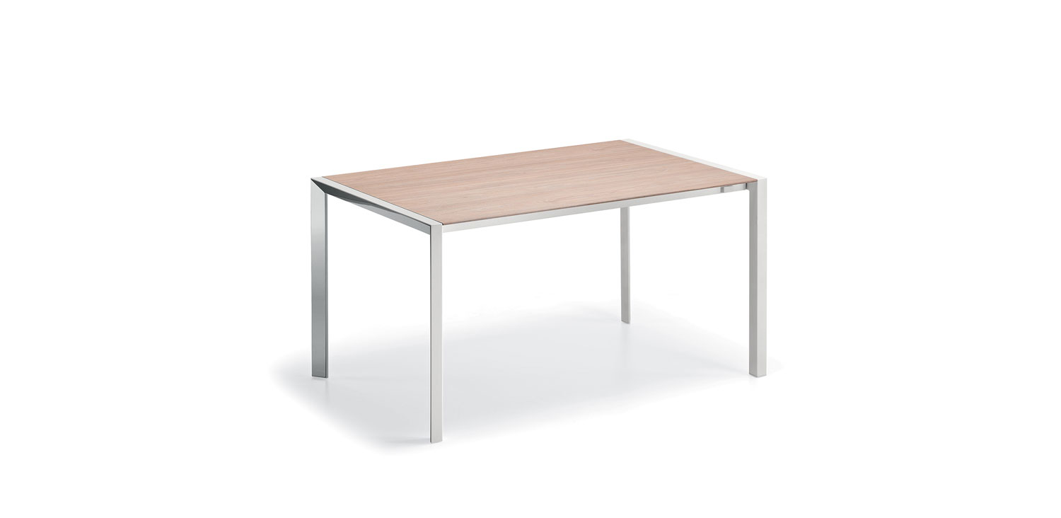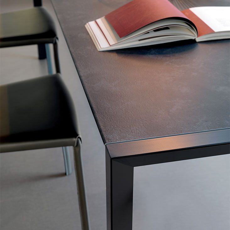 Table with base in graphite (GFM69) or white (GFM71) embossed lacquered steel, with or without profile in polished stailess steel. Top in matt white post-formed (LM01) or grey oxide (LM06) laminated wood.