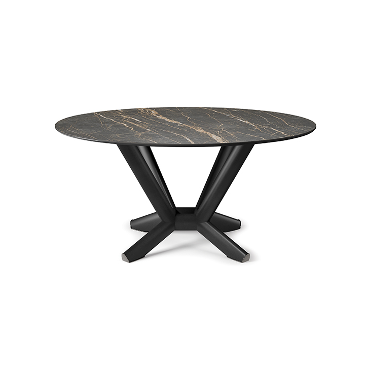 Table with base in titanium (GFM11), bronze (GFM18), graphite (GFM69) or black (GFM73) embossed lacquered steel, Brushed Bronze or Brushed Grey. Top in ceramic Marmi Calacatta (KM01), Alabastro (KM02), Ardesia (KM04), matt Golden Calacatta (KM05), glossy Golden Calacatta (KM06), matt Portoro (KM07), glossy Portoro (KM08), glossy Sahara Noir (KM09), Emperador (KM10), Makalu (KM11), Breccia (KM12) or Arenal (KM13).