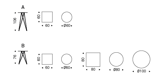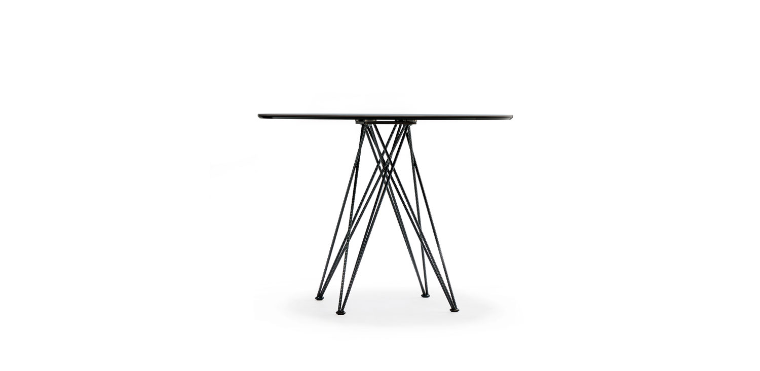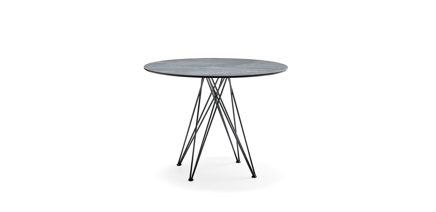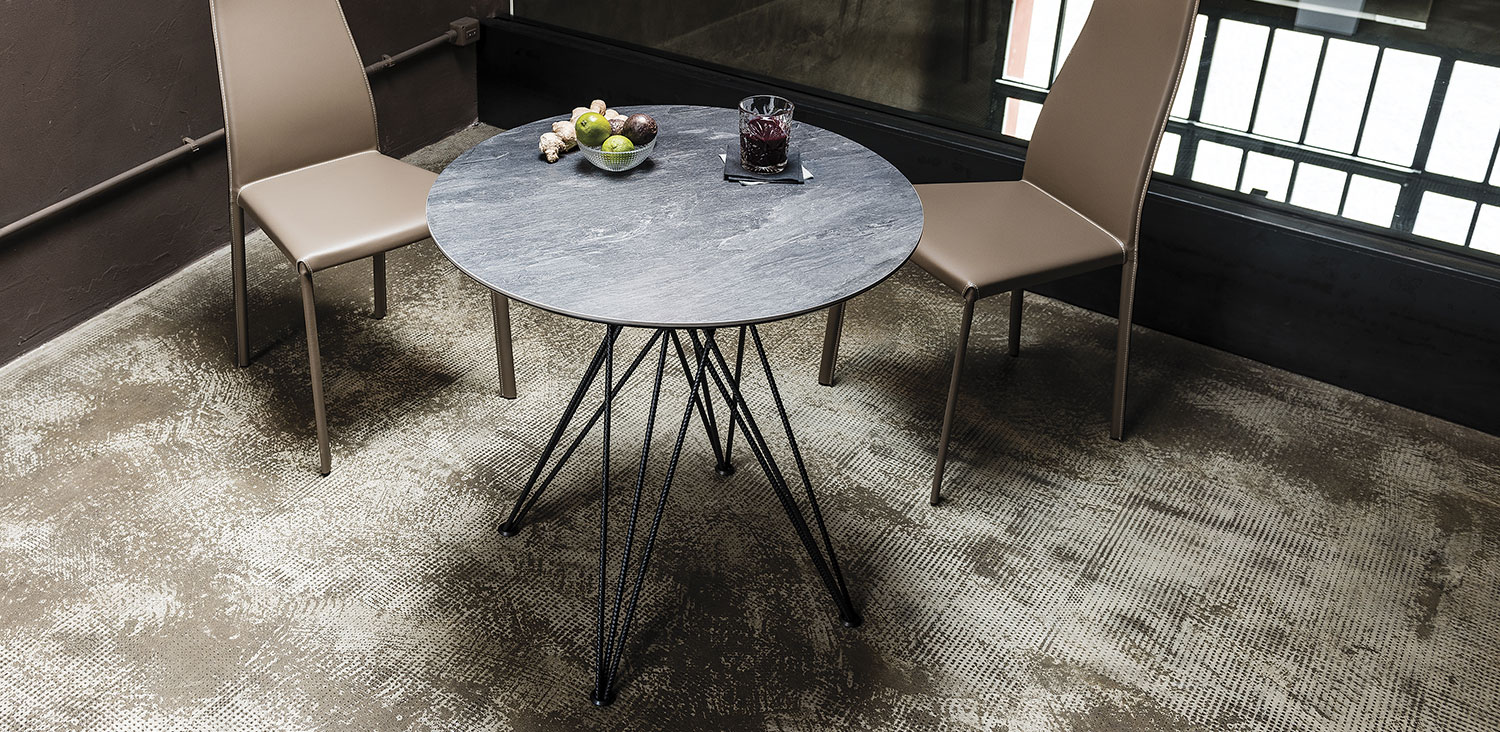 Bistrot table with graphite (GFM69), white (GFM71) or black (GFM73) embossed lacquered steel base. Marmi Calacatta (KM01), Alabastro (KM02), Ardesia (KM04), Emperador (KM10), Makalu (KM11) or Arenal (KM13) ceramic top.