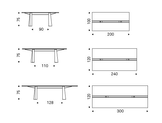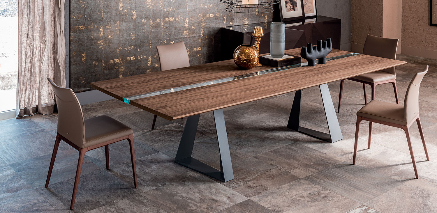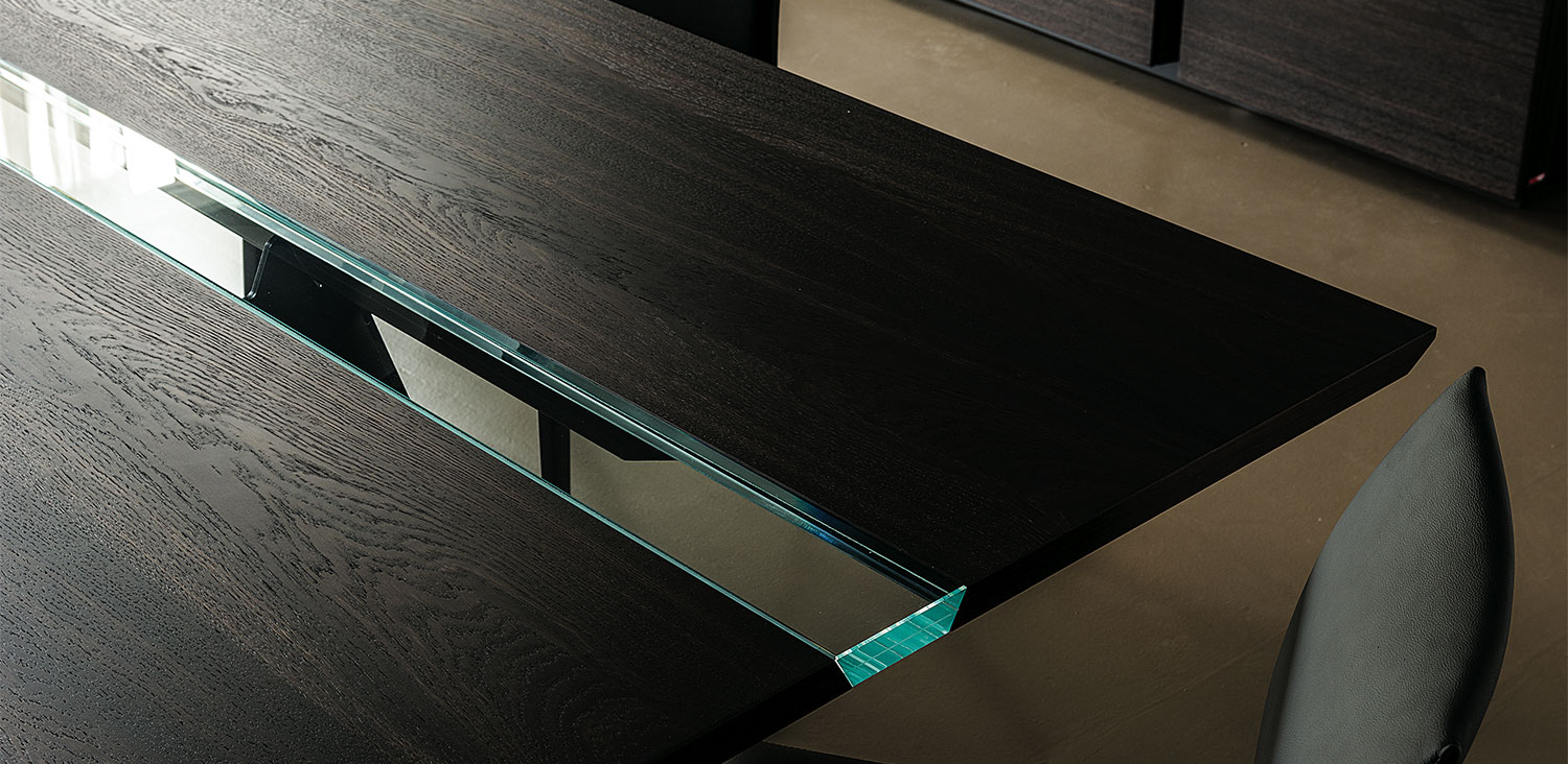 Table with base in graphite (GFM69), white (GFM71) or black (GFM73) embossed lacquered steel. Top in Canaletto walnut (NC) or burned oak (RB) with central insert in extra clear laminated glass.